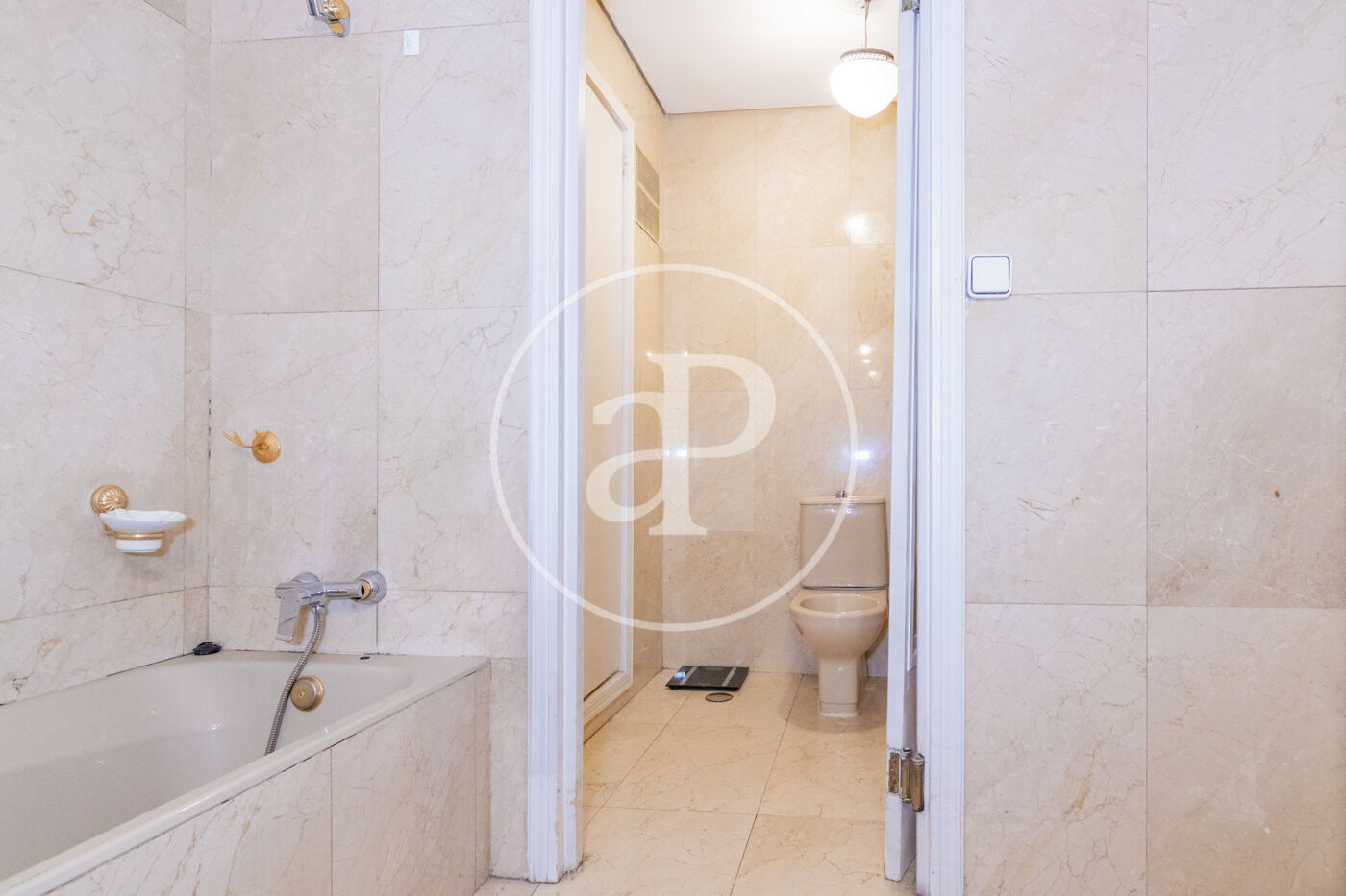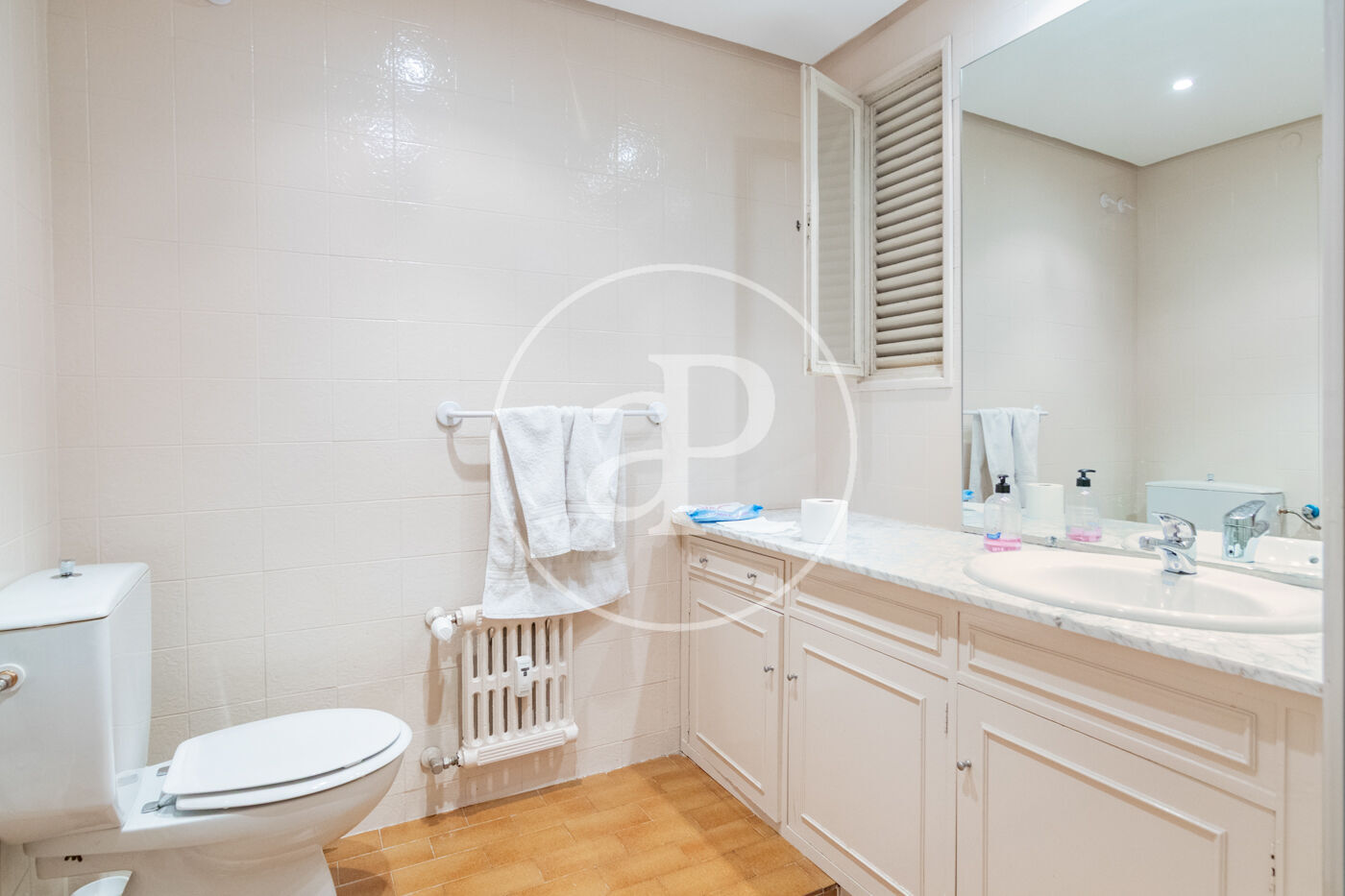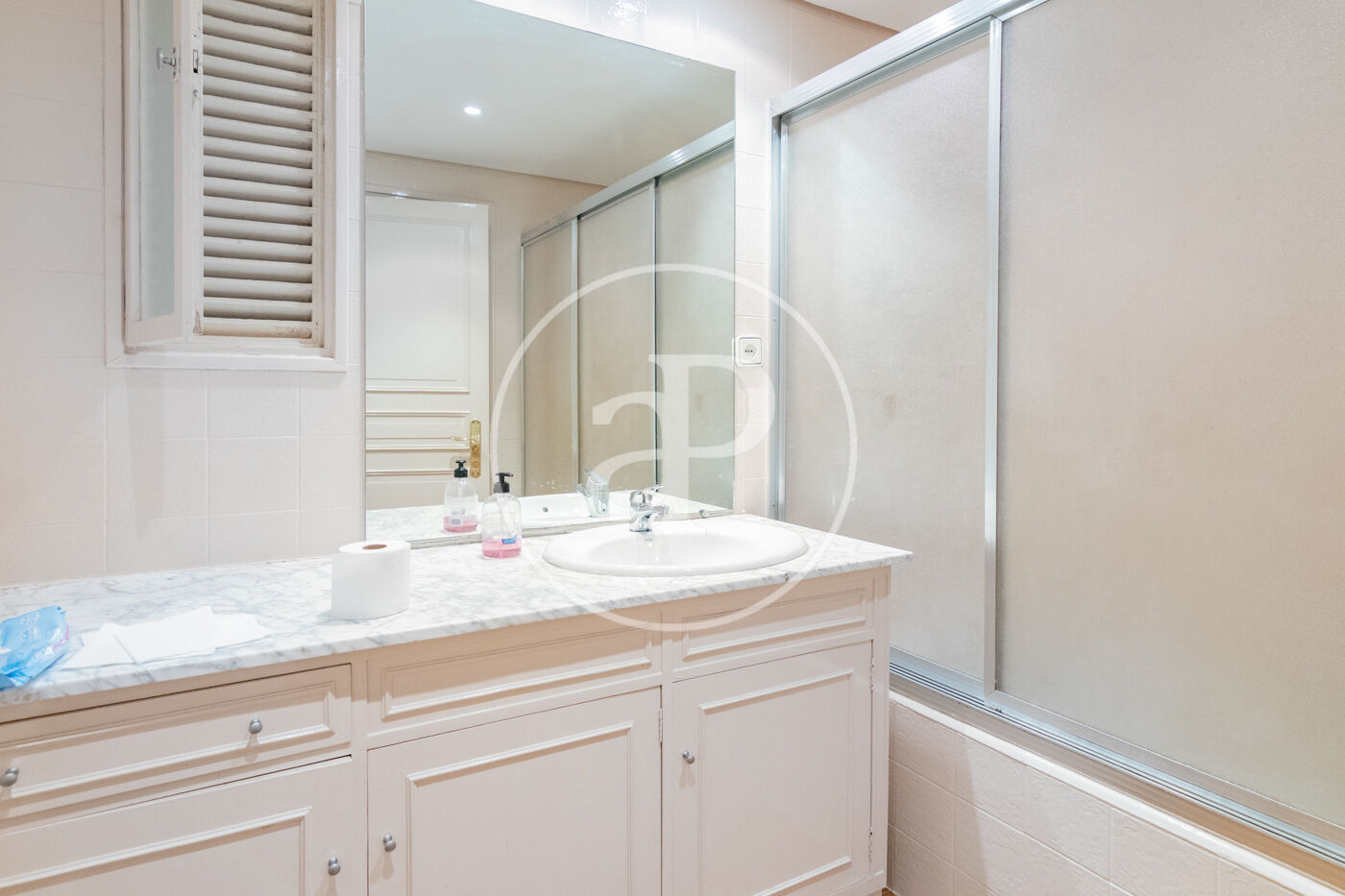 El dormitorio principal de fantásticas dimensiones cuenta con una amplia estancia de vestidor con armarios revestidos en madera y retroiluminados a través del cual damos paso al baño compuesto por una moderna bañera exenta, dos muebles de lavabo independientes con cajoneras hechas a medida, cabina de ducha en mármol. Completan la zona de noche tres dormitorios más, más la zona de servicio dividida en habitación con su baño y cuarto de lavandería y plancha.