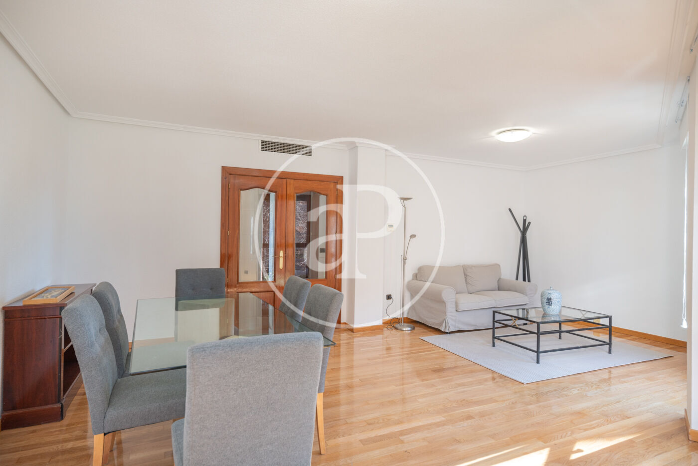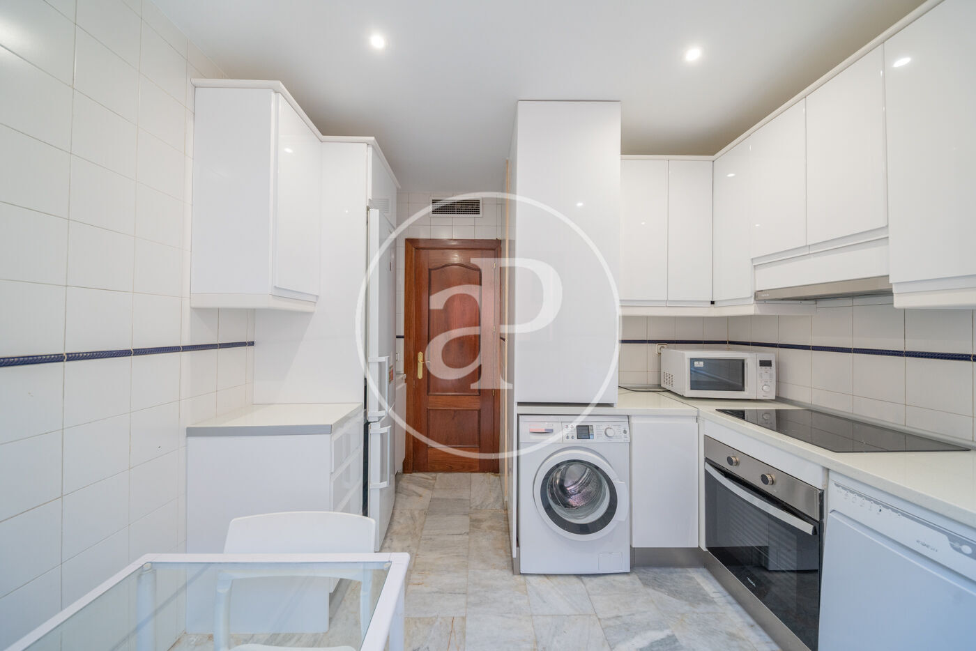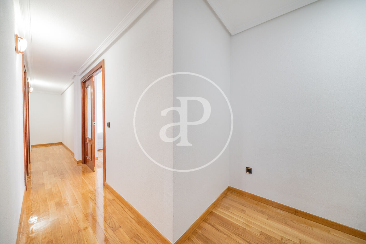 Ubicado en Fuente del Berro, se encuentra este piso semiamueblado de 140 m². Entrando en la propiedad, encontramos un hall-pasillo que nos da acceso a la derecha al amplio salón comedor con mucha luz y vistas a una zona ajardinada. Al otro lado del pasillo se encuentra la cocina completamente amueblada con office. Siguiendo por el pasillo nos encontramos dos dormitorios dobles con vistas al patio interior donde se ubica la piscina, y un baño completo compartido. Al final del pasillo, se encuentra el dormitorio principal con baño completo en suite y vistas a la zona ajardinada.