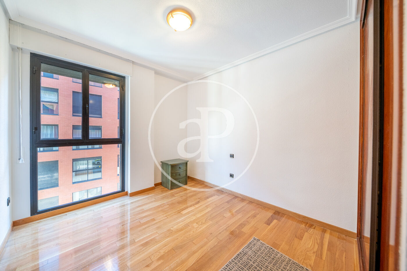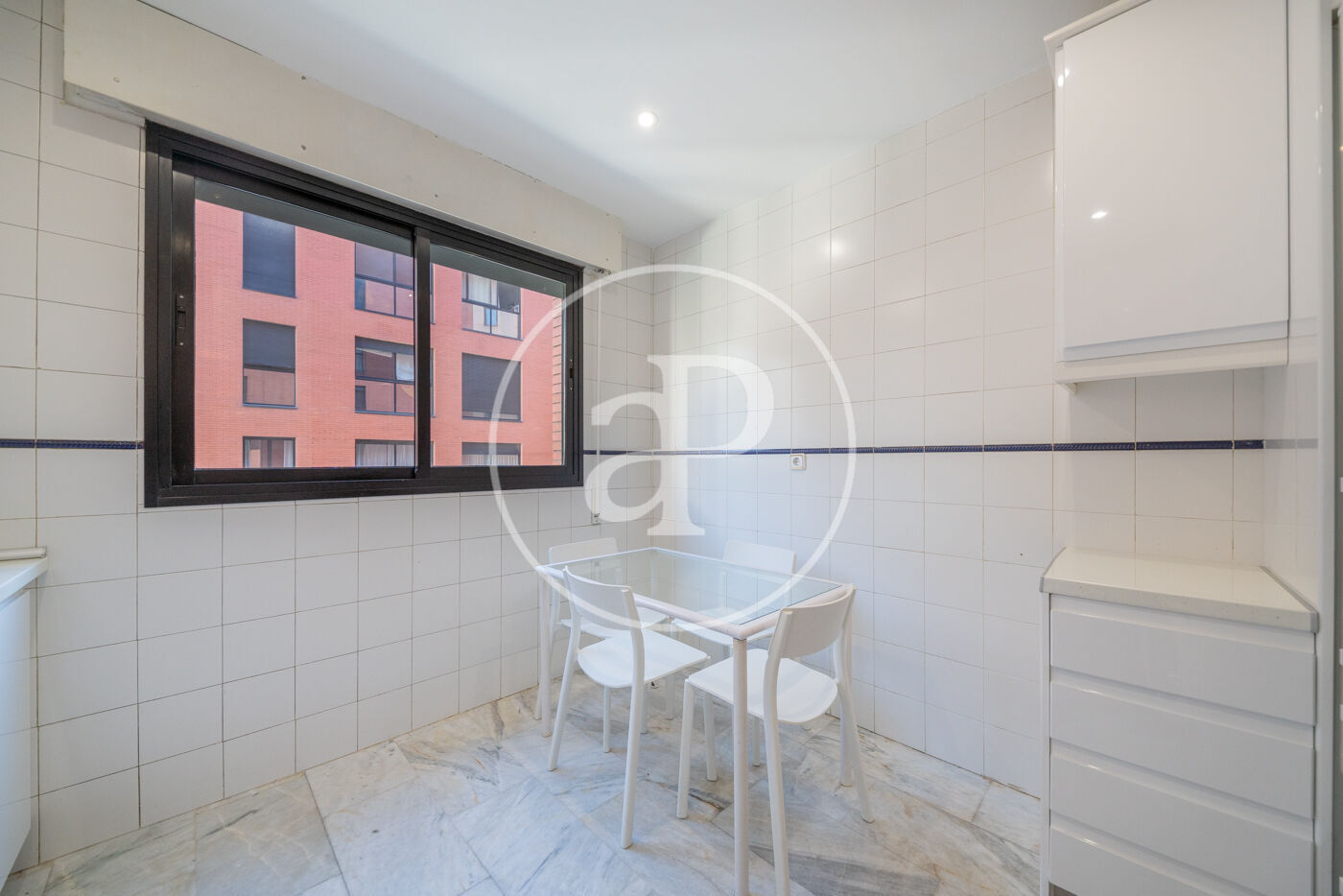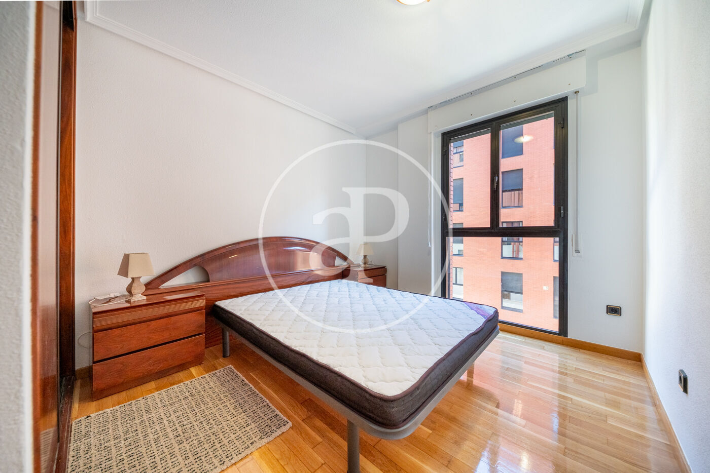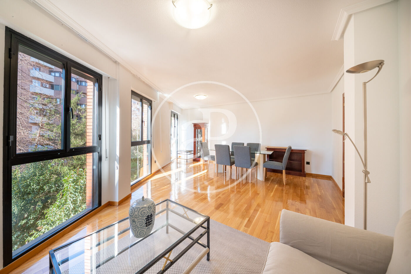 Ubicado en Fuente del Berro, se encuentra este piso semiamueblado de 140 m². Entrando en la propiedad, encontramos un hall-pasillo que nos da acceso a la derecha al amplio salón comedor con mucha luz y vistas a una zona ajardinada. Al otro lado del pasillo se encuentra la cocina completamente amueblada con office. Siguiendo por el pasillo nos encontramos dos dormitorios dobles con vistas al patio interior donde se ubica la piscina, y un baño completo compartido. Al final del pasillo, se encuentra el dormitorio principal con baño completo en suite y vistas a la zona ajardinada.