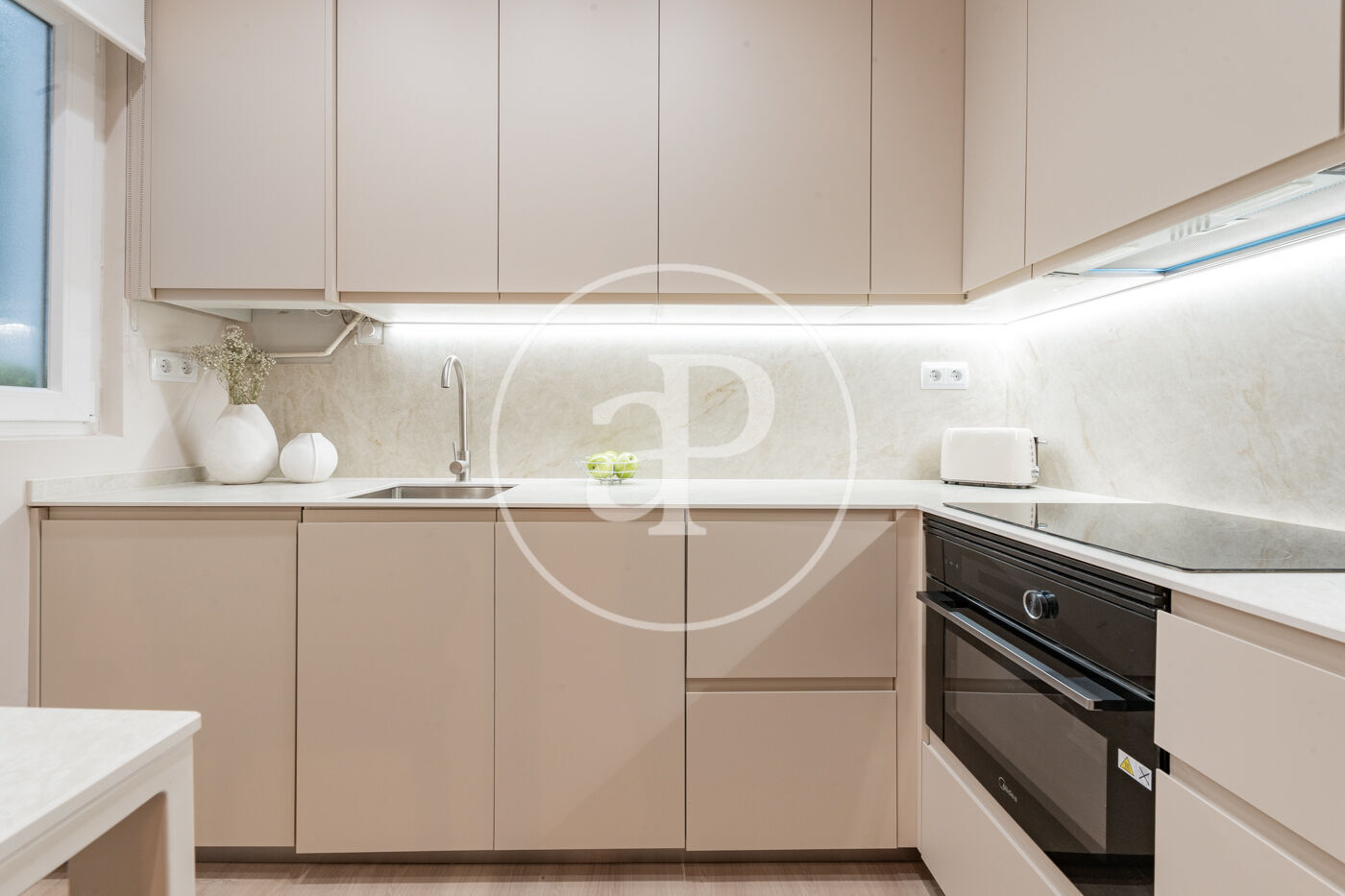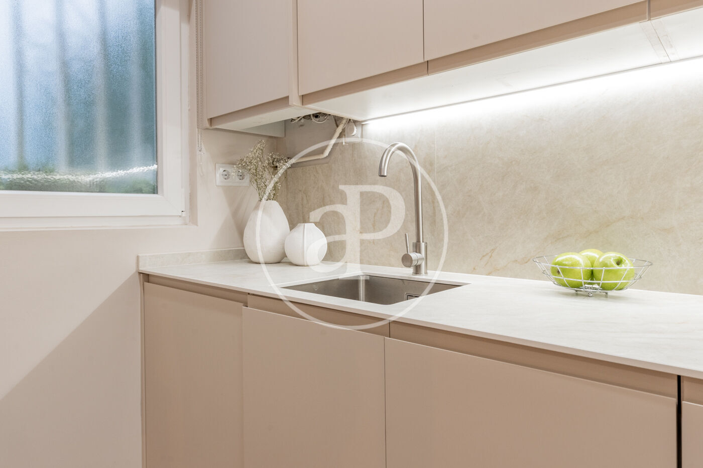 La zona de día con techos de más de 3 metros de altura la conforma un espacio abierto de salón y elegante moderna cocina de autor con muebles a medida de excelente calidad con encimera y barra de la marca líder de piedra sinterizada Neolith. Se entrega completamente equipada (frigorífico, lavavajillas, vitrocerámica inducción, lavadora y horno-microondas) con menaje completo y pequeño electrodoméstico (plancha y tabla de planchado, tostadora, cafetera italina, vaso americano, air fryer), lista para entrar a vivir. Completa la zona de día un espacio de home office abierto a la zona social con sofá cama, TV y con acceso directo a un patio ajardinado privado acondicionado y amueblado que representa un oasis de paz para disfrutar en el centro de la capital.