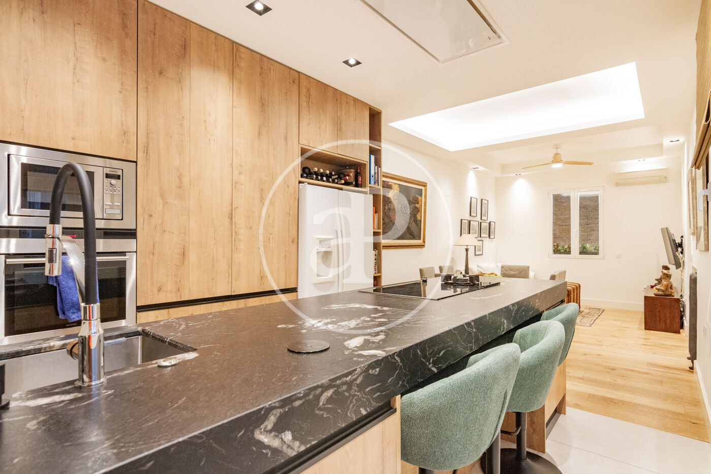 La zona de día está compuesta por un espacioso salón con zona de despacho que se independiza con puertas correderas. Disfruta de una magnífica luz natural con 3 balcones. La zona de la cocina, independiente, es muy espaciosa, con área de comedor y área de televisión. Hay cuarto de lavadora y aseo de cortesía.