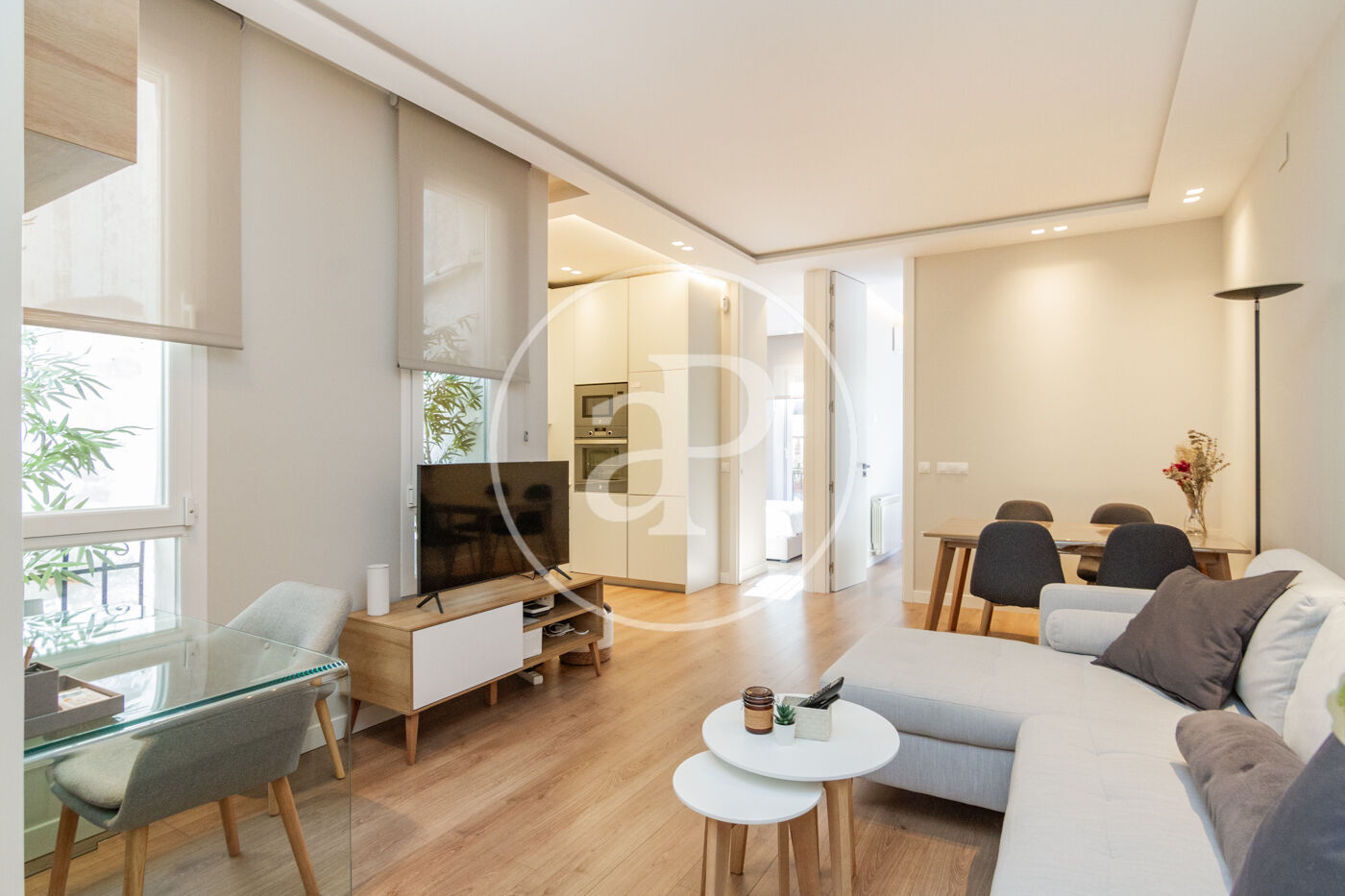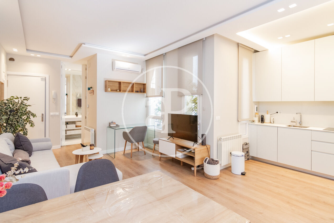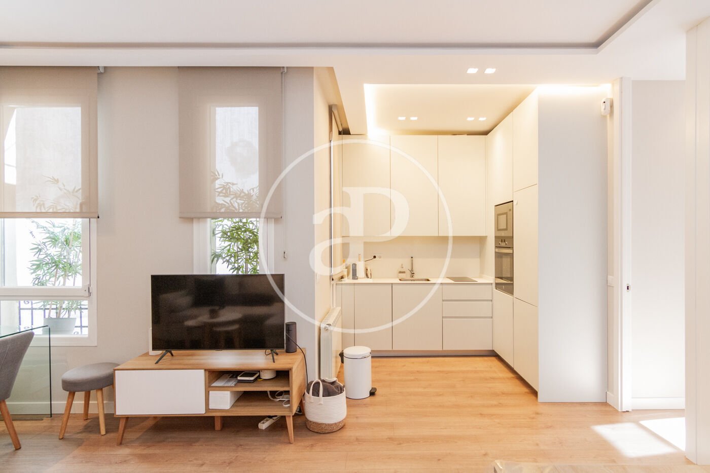 Luego tiene cocina integrada a salón, estilo americano, con todos los electrodomésticos nuevos de alta gama, lavavajillas, lavadora/secadora, horno, micro, vitrocerámica, nevera y congelador. El salón cuenta con mesa y sillas para espacio de estudio o trabajo, además de un escritorio, sofá-cama muy espaciosa y cómodo.