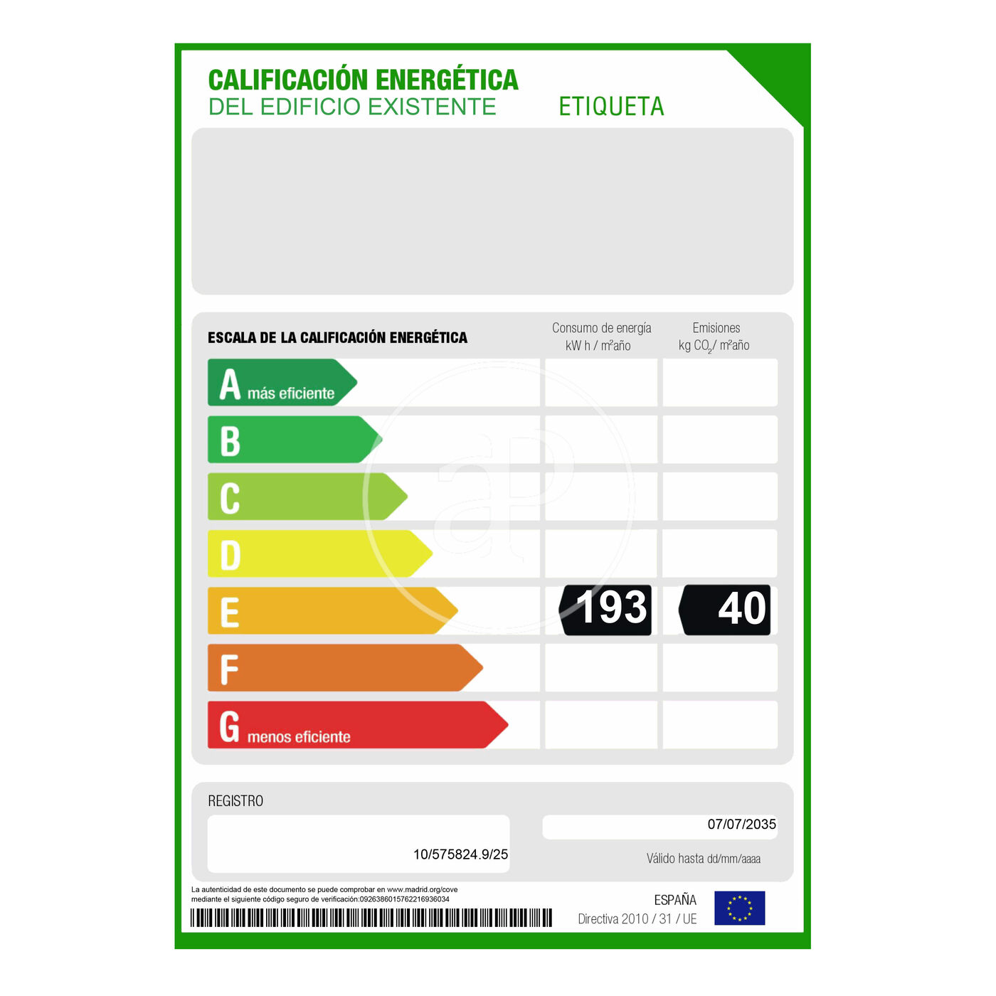 Más eficiente Menos eficie Calificación energética Consumo energía Kw h/m² año Emisiones Co/m² año 40.00 193.00