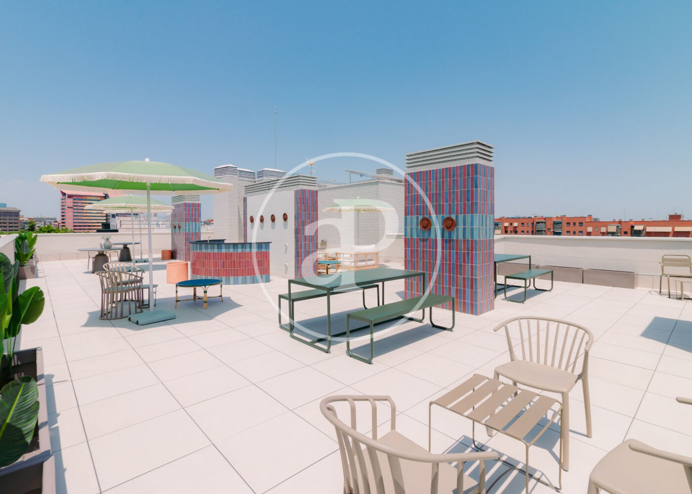 El edificio cuenta con varias zonas comunes, entre ellas, una zona de coworking con un coffee station, un gran SOLARIUM / AZOTEA en la quinta planta de 300 m²! disponible para relajarse y tomar el sol, trabajar, e incluso tener un sano encuentro con tus más queridos.