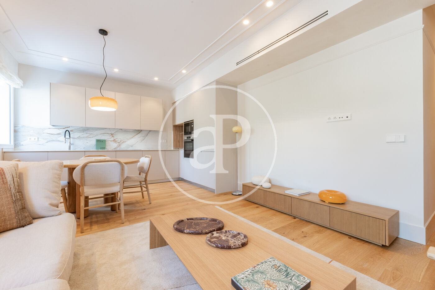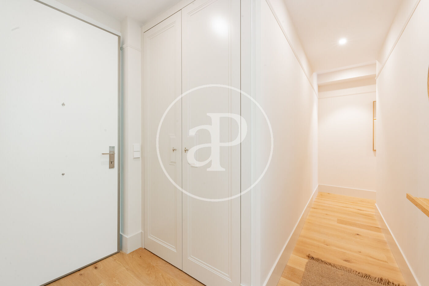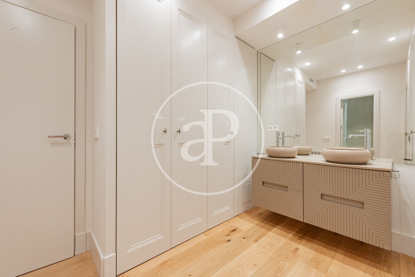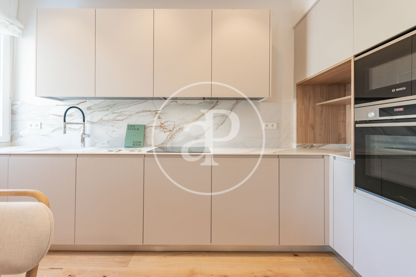 Al acceder a la vivienda, encontramos un armario gabanero que aporta un plus de organización desde la entrada. La zona de día se compone de un luminoso salón-comedor con cocina integrada, con molduras en los altos techos y paredes, un cuidado diseño de iluminacion, concebido como un espacio moderno y fluido. La cocina, completamente equipada, incorpora electrodomésticos panelados de primeras marcas, aportando estética y funcionalidad en perfecta armonía.