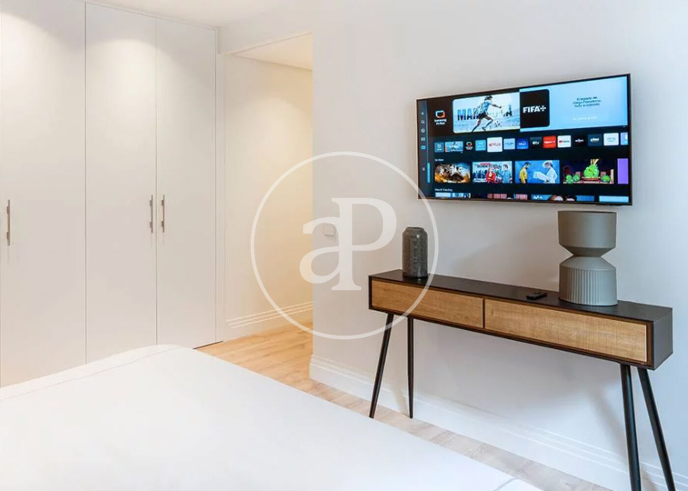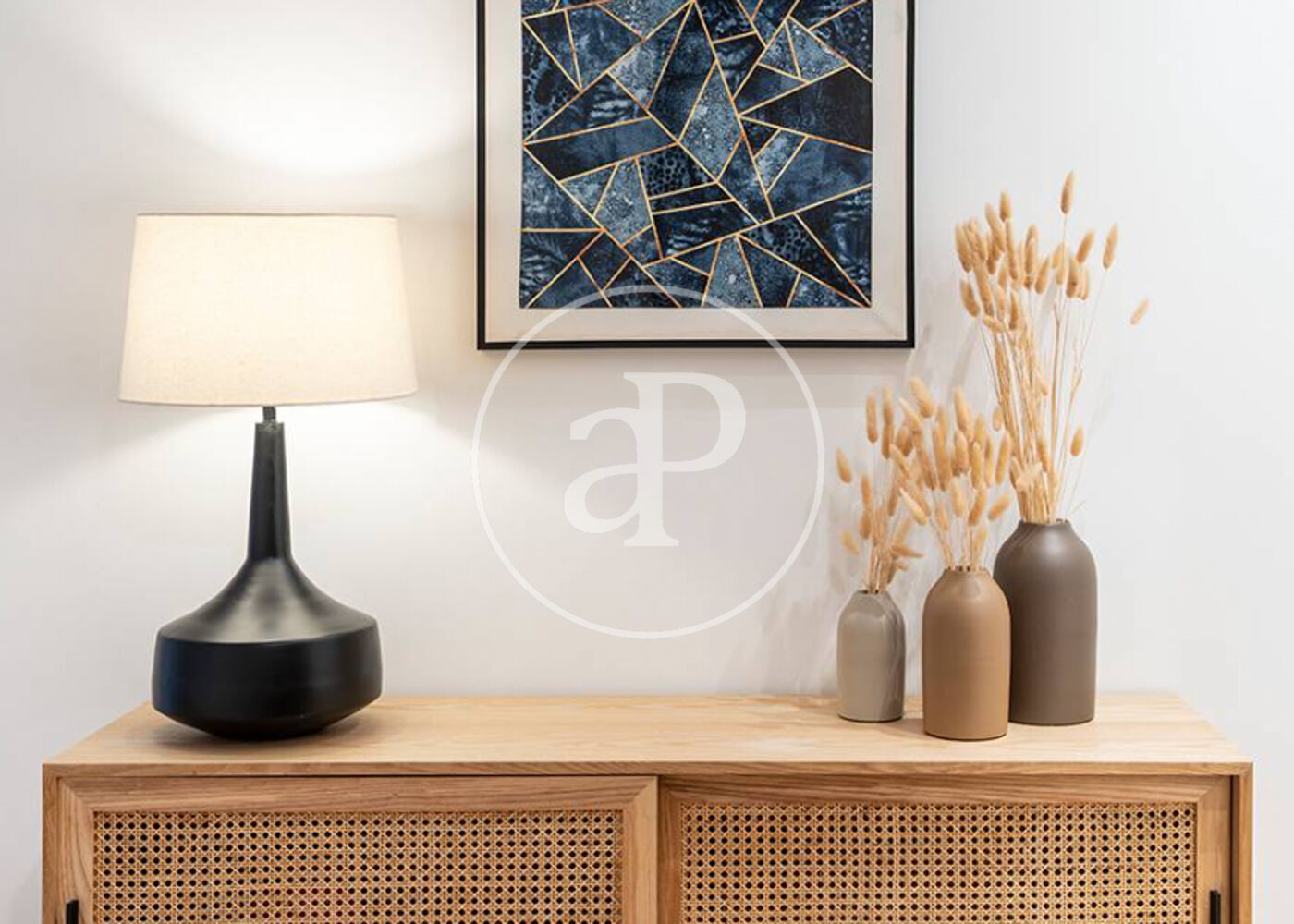 El eje principal de la vivienda es su zona de día, con un salón diáfano y muy luminoso, con zona de sofás y zona de comedor. La cocina tiene una distribución muy funcional y está equipada con todos los electrodomésticos. La vivienda se entrega completamente amueblada a estrenar, con mobiliario de diseño y acabados de altas calidades, televisores Smart TV, conexión Wi-Fi, aire acondicionado, calefacción y lavadora-secadora. Además, el edificio cuenta con ascensor, plaza de garaje, servicio de portería.