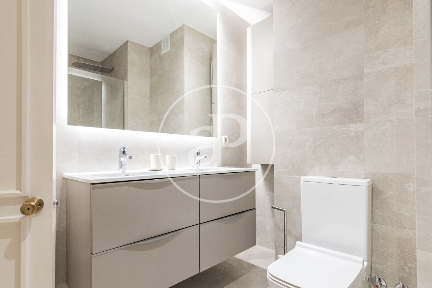 La zona de noche está conformada por 5 habitaciones exteriores: la habitación principal en suite con zona de armario; seguido de tres habitaciones amplias y luminosas y dos baños completos y un aseo, además posee una habitación y baño de servicio o multiuso. La finca cuenta con servicio de portería y existe la posibilidad de alquilar una plaza de garaje. Este piso se encuentra en la zona tranquila de Jerónimos, un barrio del distrito de Retiro, conocido como El Pequeño París, que alberga algunos de los edificios y monumentos más conocidos y visitados de la ciudad como el Museo del Prado, el Museo Naval y el Jardín Botánico.