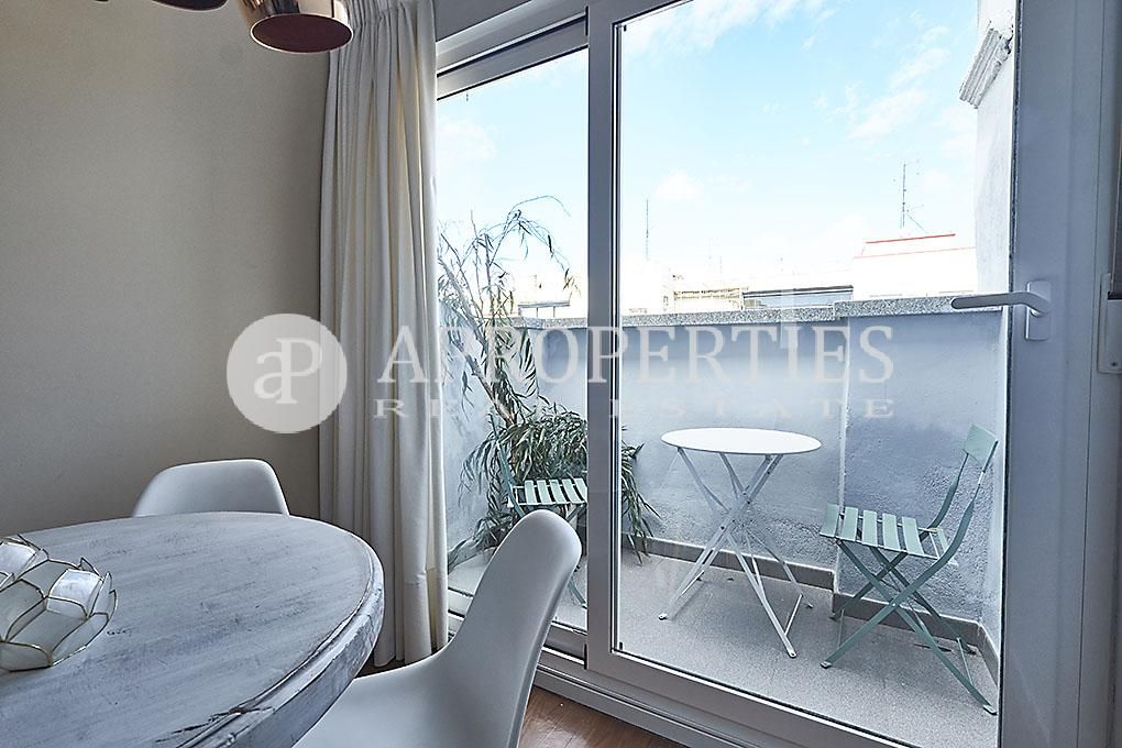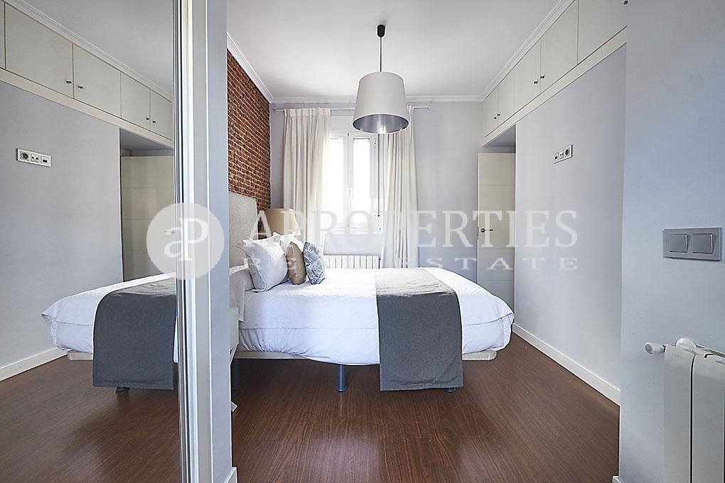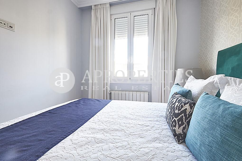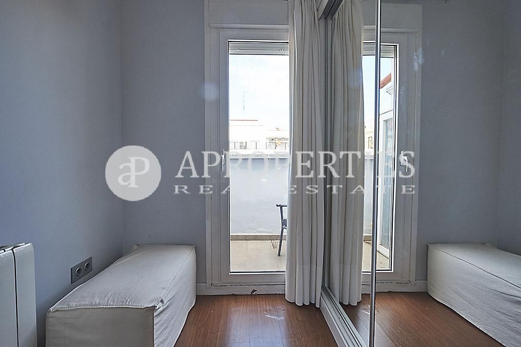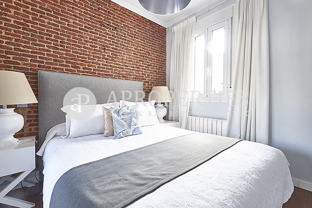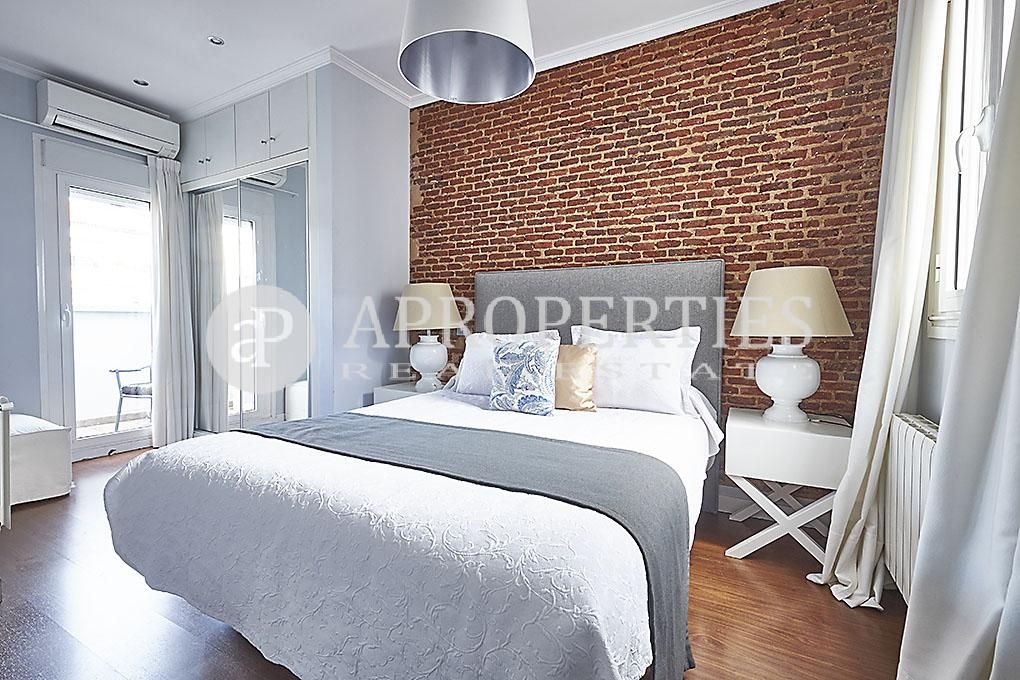 Espectacular y luminoso ático con vistas a la Plaza del Marqués de Salamanca. El apartamento está totalmente amueblado y equipado, listo para entrar y se compone de salón comedor con terraza; cocina independiente amueblada; dos dormitorios dobles con cama de matrimonio y armarios vestidos, uno de ellos con terraza; y un cuarto de baño con plato de ducha. Las paredes están pintadas en liso y tiene suelo de madera. La vivienda cuenta con aire acondicionado y calefacción por gas natural. Toda la zona esta perfectamente comunicada con transporte público.