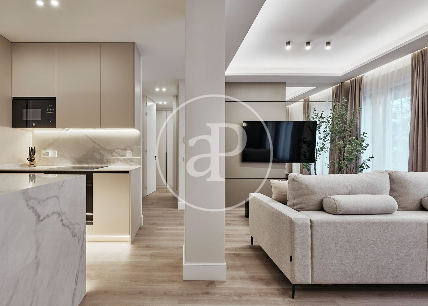 CONTRATOS DE TEMPORADA Magnifica vivienda de 82 metros cuadrados construidos se distribuye desde la entrada en la que tiene un gran armario empotrado. Seguidamente, encontramos la cocina, con electrodomésticos panelados AEG de alta gama. El piso dispone de una mesa de 4 comensales que divide la zona de día en dos ambientes. Por un lado, la cocina abierta y por el otro el salón, muy luminoso gracias a su gran ventanal y con vistas a un amplio patio de manzana, muy tranquilo. Desde el salón se accede al dormitorio, con cama doble y baño en suite con ducha; también con buena iluminación natural. La vivienda cuenta con ventanas con doble acristalamiento, calefacción central regulable individualmente y aire acondicionado por conductos en todas las estancias. La finca dispone de gimnasio, conserje de día, ascensor y opción de alquilar adicionalmente trastero y plaza de garaje con acceso directo al piso (adiconales 200€+iva). Los suministros incluidos con los consumos de luz, agua y gas hasta un importe de 250,00€ en su conjunto. El piso se encuentra en el emblemático barrio de Almagro en la conocida calle Génova, en finca con fachada clásica, pero con reforma integral tanto en zonas comunes como en las viviendas. Ubicación excepcional por encontrarse a un paso del Paseo de la Castellana, bien comunicada por el transporte público y cercana a multitud de comercios y restaurantes. DISPONIBLE A PARTIR DE ENERO 2026. ¿Te imaginas vivir aquí?