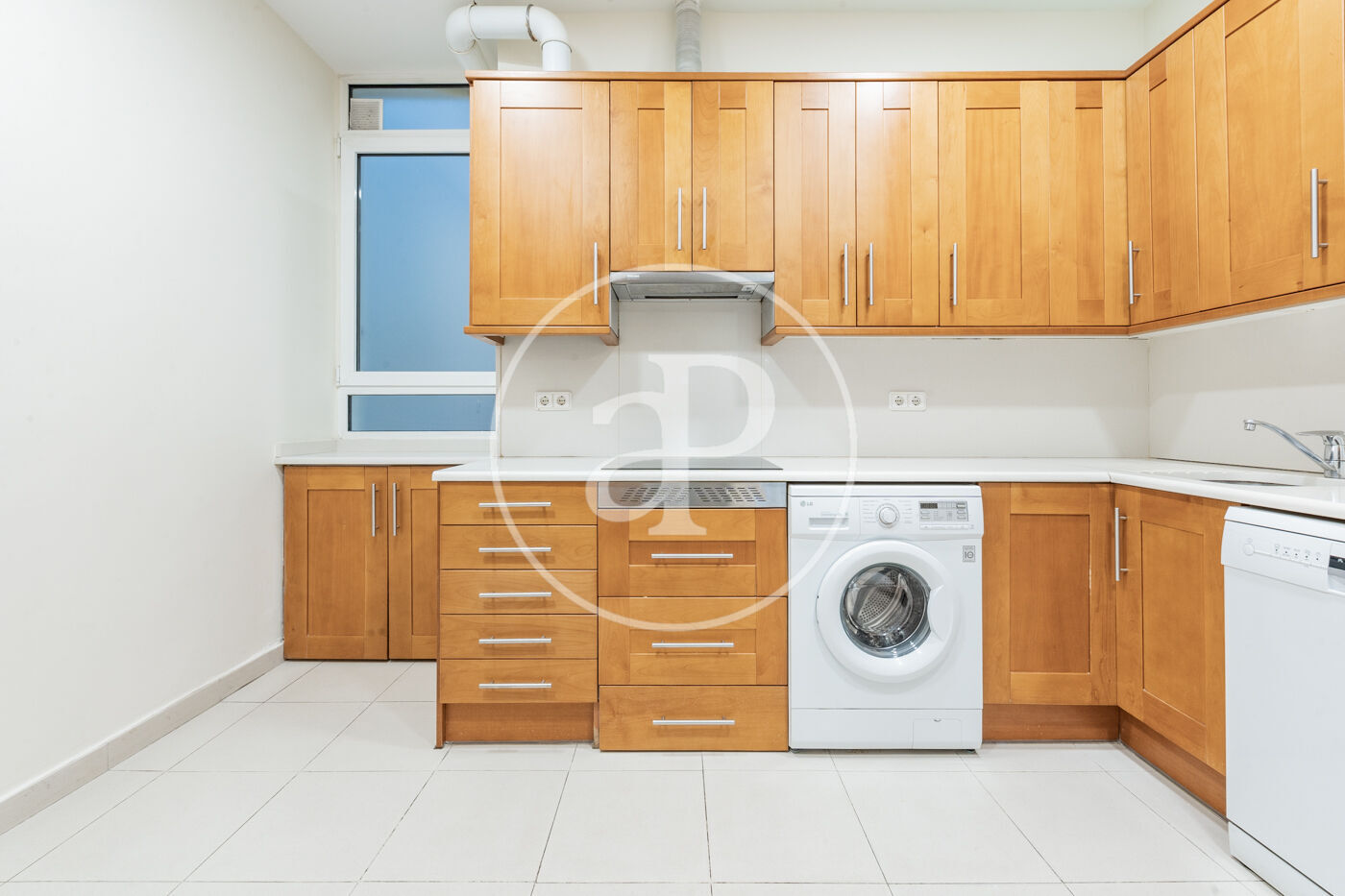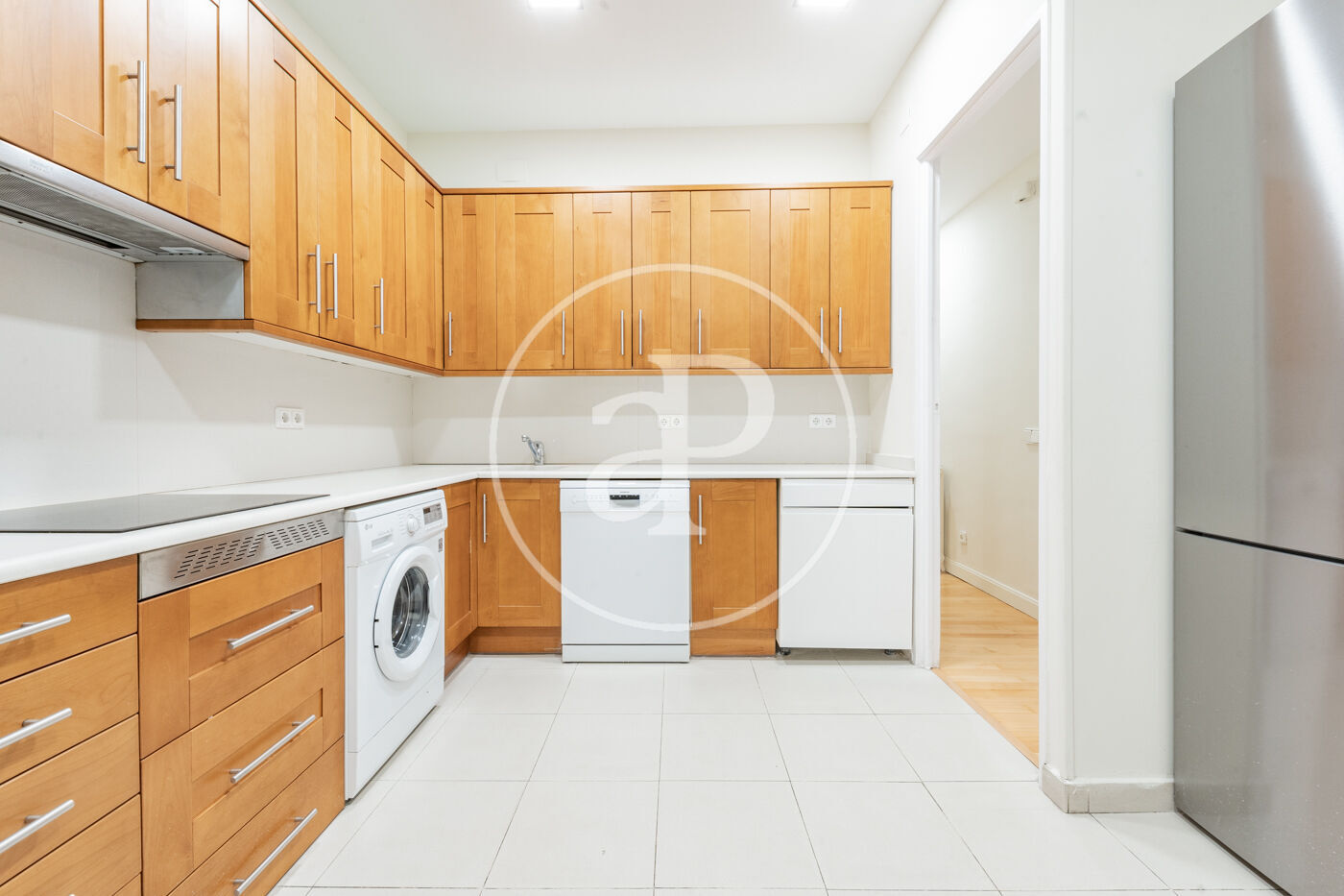 La vivienda se completa con una cocina independiente de generosas dimensiones, dos baños completos y un amplio recibidor que ofrece una elegante carta de presentación. Un cómodo pasillo distribuidor articula la vivienda, garantizando una circulación fluida y una agradable sensación de privacidad en cada estancia.