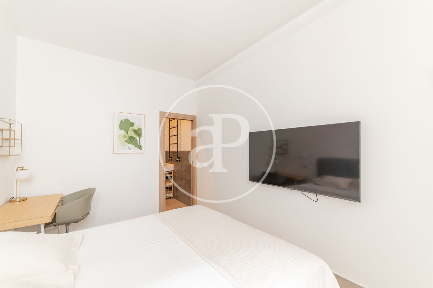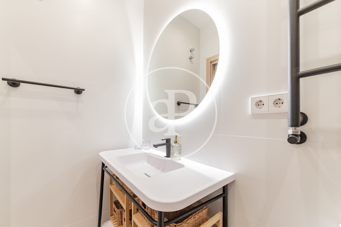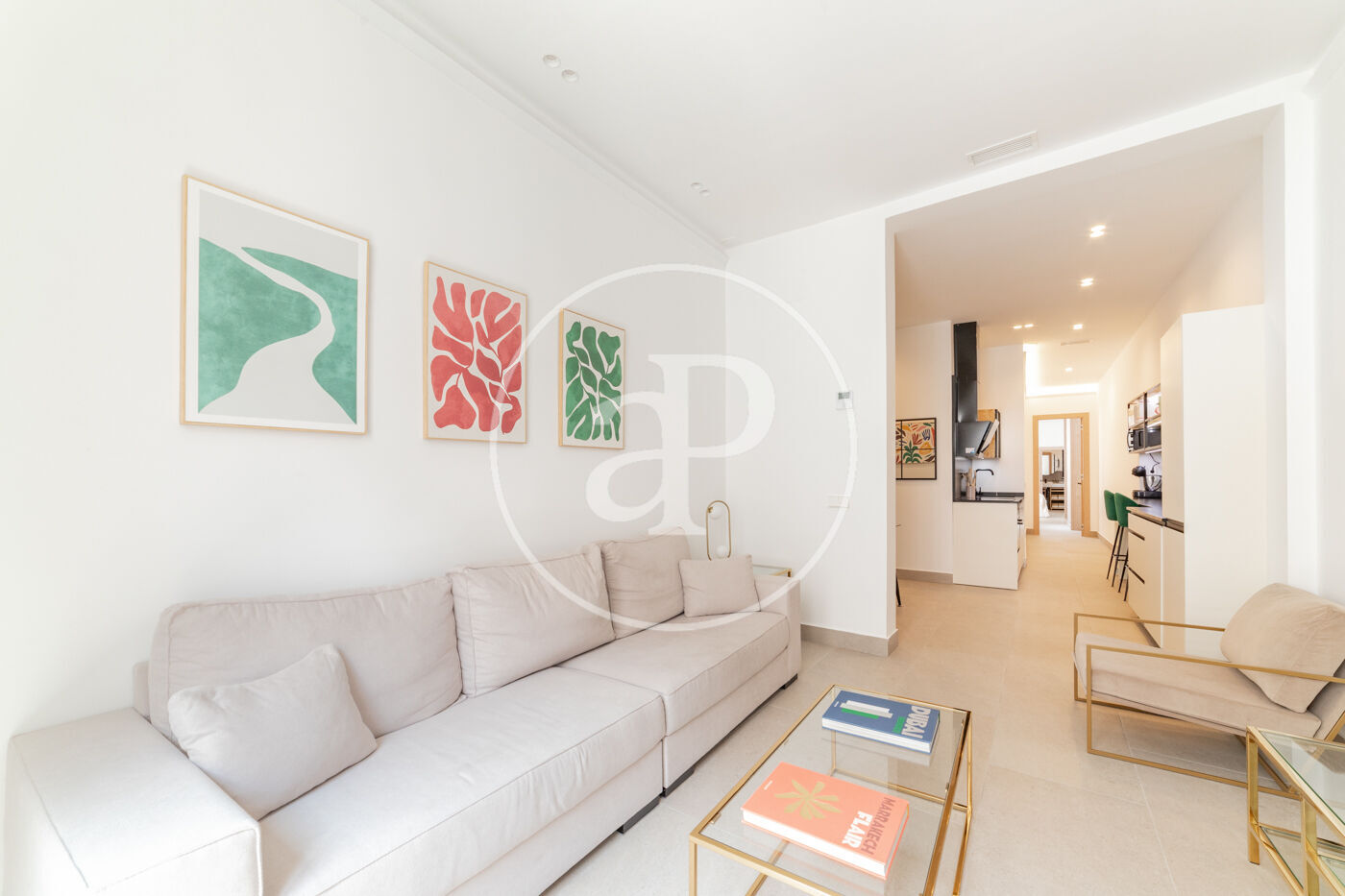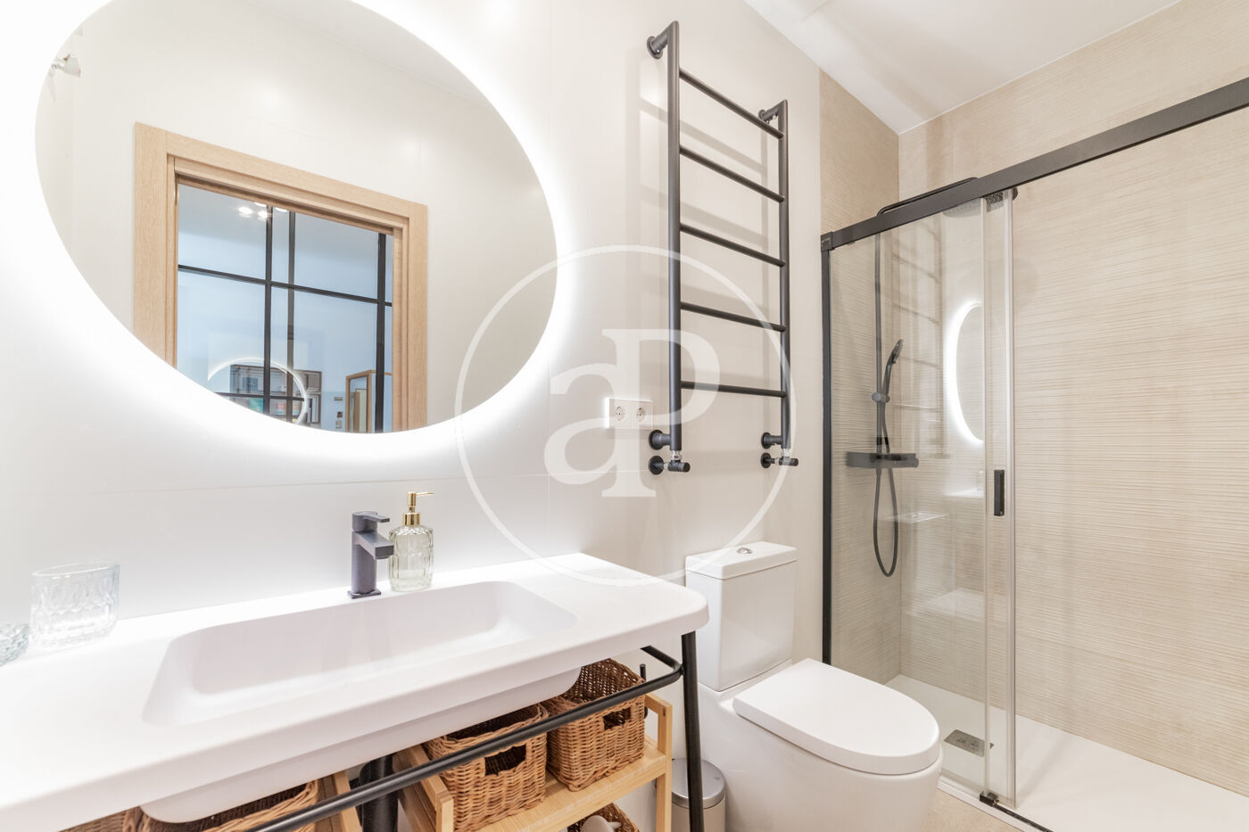 Desde la entrada, se accede a un amplio recibidor con comedor, cocina y sala de estar de concepto abierto, decorados en estilo nórdico. Cuenta con un aseo de cortesía y una cocina totalmente equipada con todo lo necesario para entrar a vivir. El salón cuenta con un amplio balcón y una Smart TV de gran tamaño. Los dos dormitorios son dobles y ofrecen mucho espacio de almacenamiento; uno tiene balcón y el otro, baño en suite. Se encuentra en un edificio de nueva construcción y dispone de wifi.