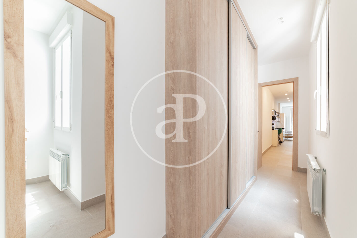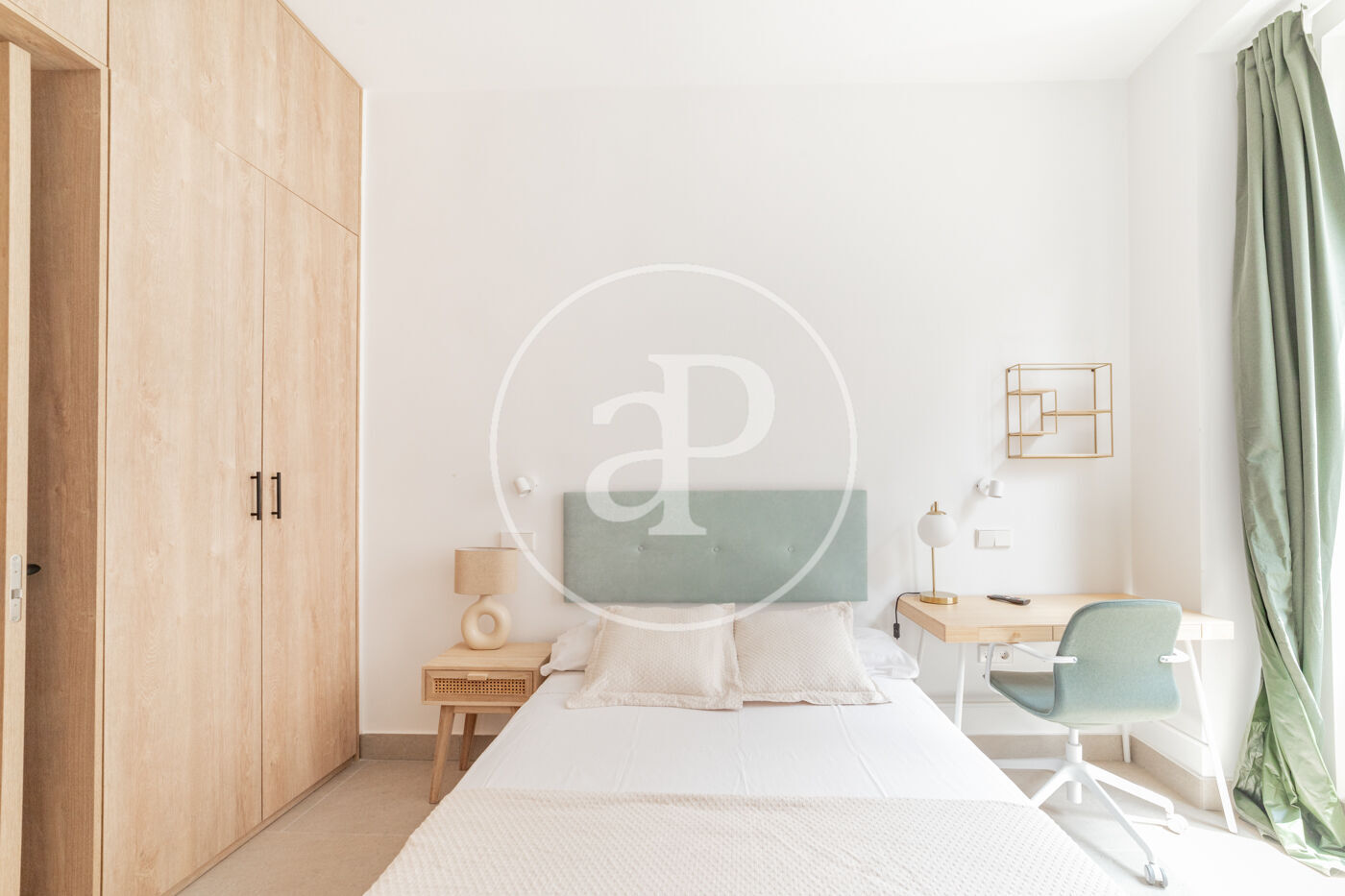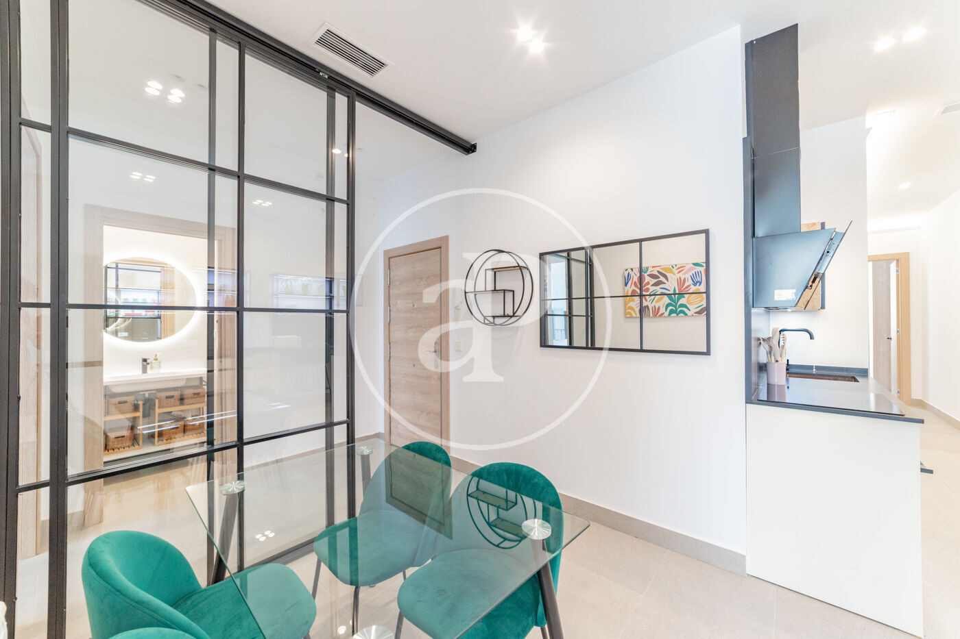 Desde la entrada, se accede a un amplio recibidor con comedor, cocina y sala de estar de concepto abierto, decorados en estilo nórdico. Cuenta con un aseo de cortesía y una cocina totalmente equipada con todo lo necesario para entrar a vivir. El salón cuenta con un amplio balcón y una Smart TV de gran tamaño. Los dos dormitorios son dobles y ofrecen mucho espacio de almacenamiento; uno tiene balcón y el otro, baño en suite. Se encuentra en un edificio de nueva construcción y dispone de wifi.