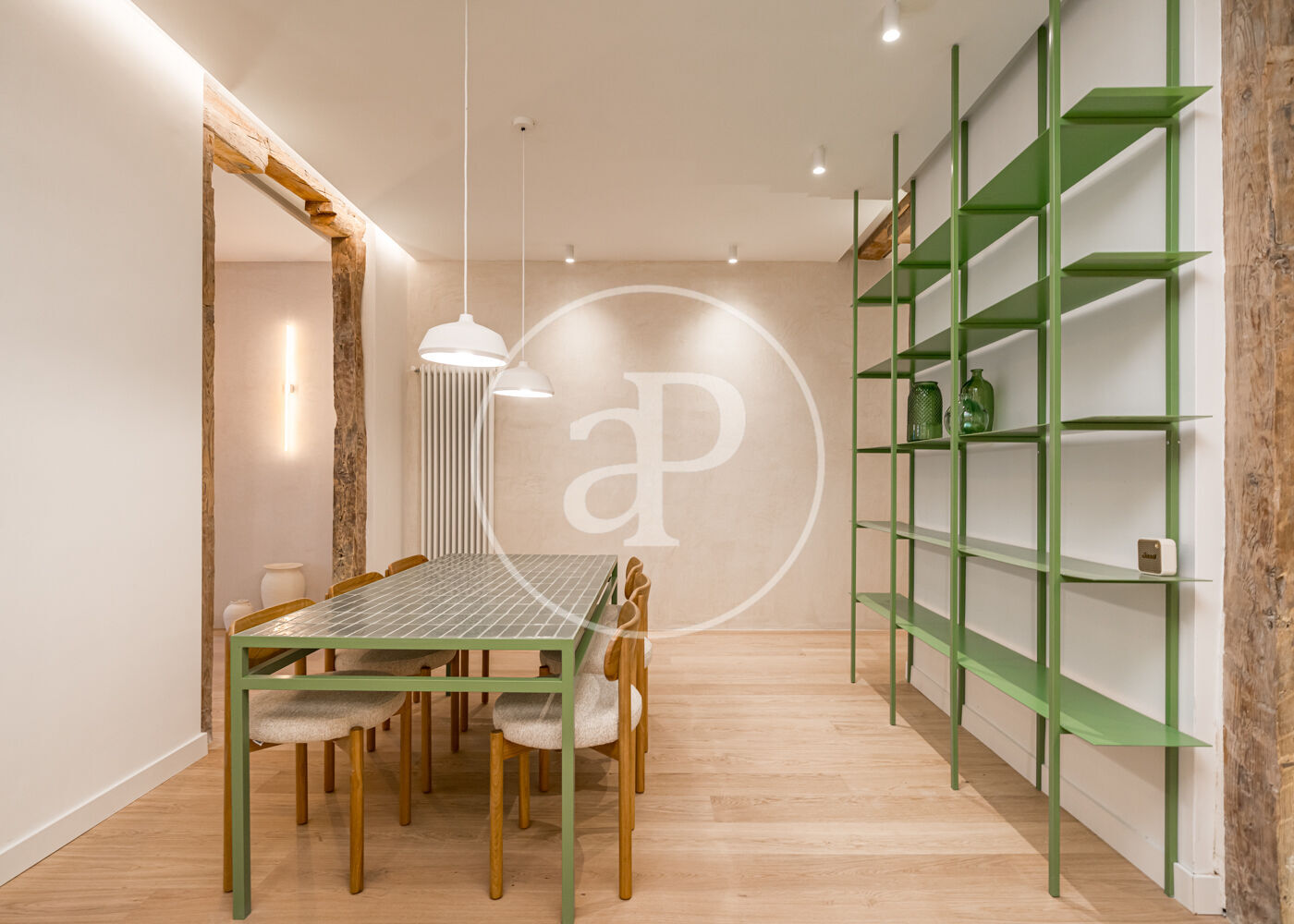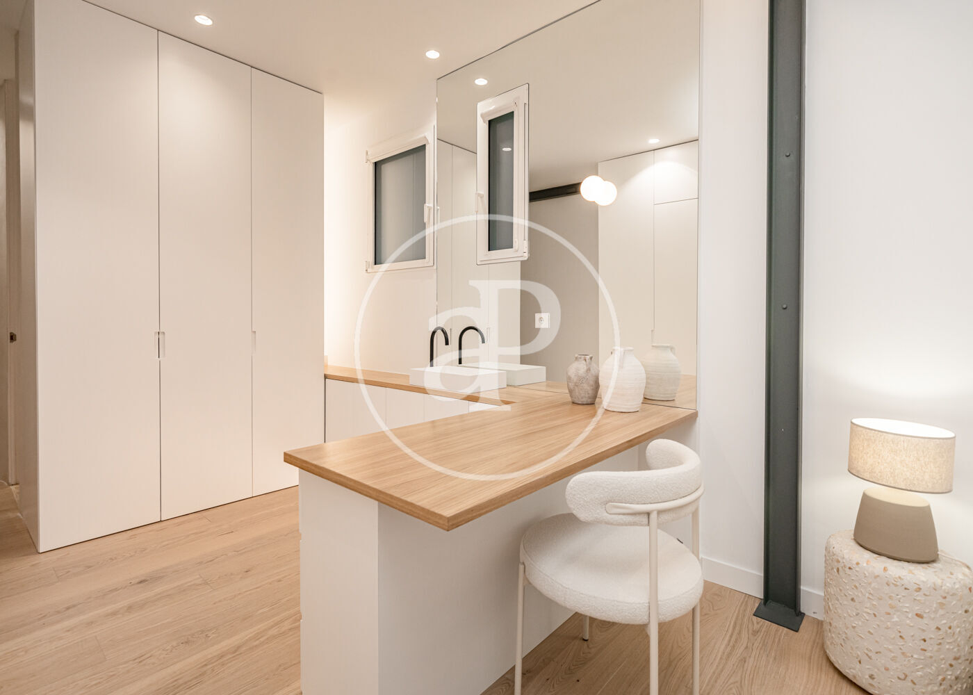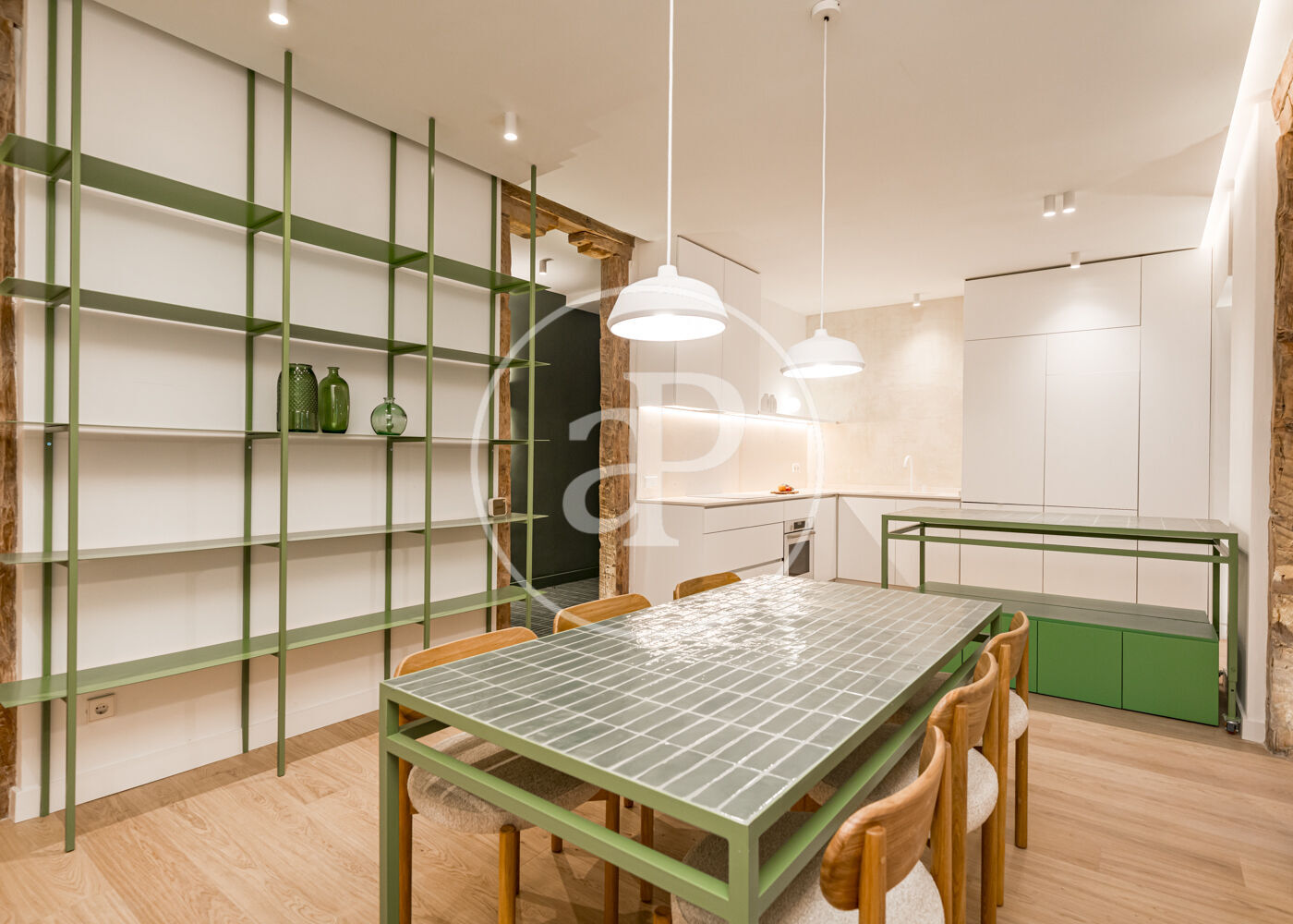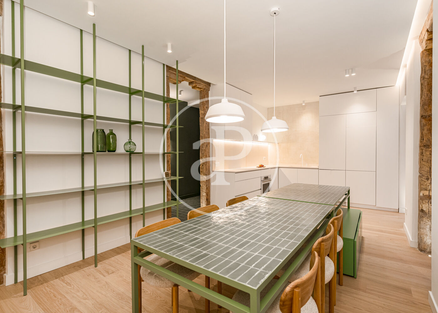 El proyecto ha sido desarrollado por arquitectos con una clara vocación de diseño. Gran parte del mobiliario y los elementos funcionales han sido concebidos a medida, incluyendo la cocina integrada, las estanterías tipo biblioteca, los armarios empotrados y el mobiliario de los baños con duchas italianas. Los suelos de madera refuerzan la sensación de calidez y continuidad entre los espacios.