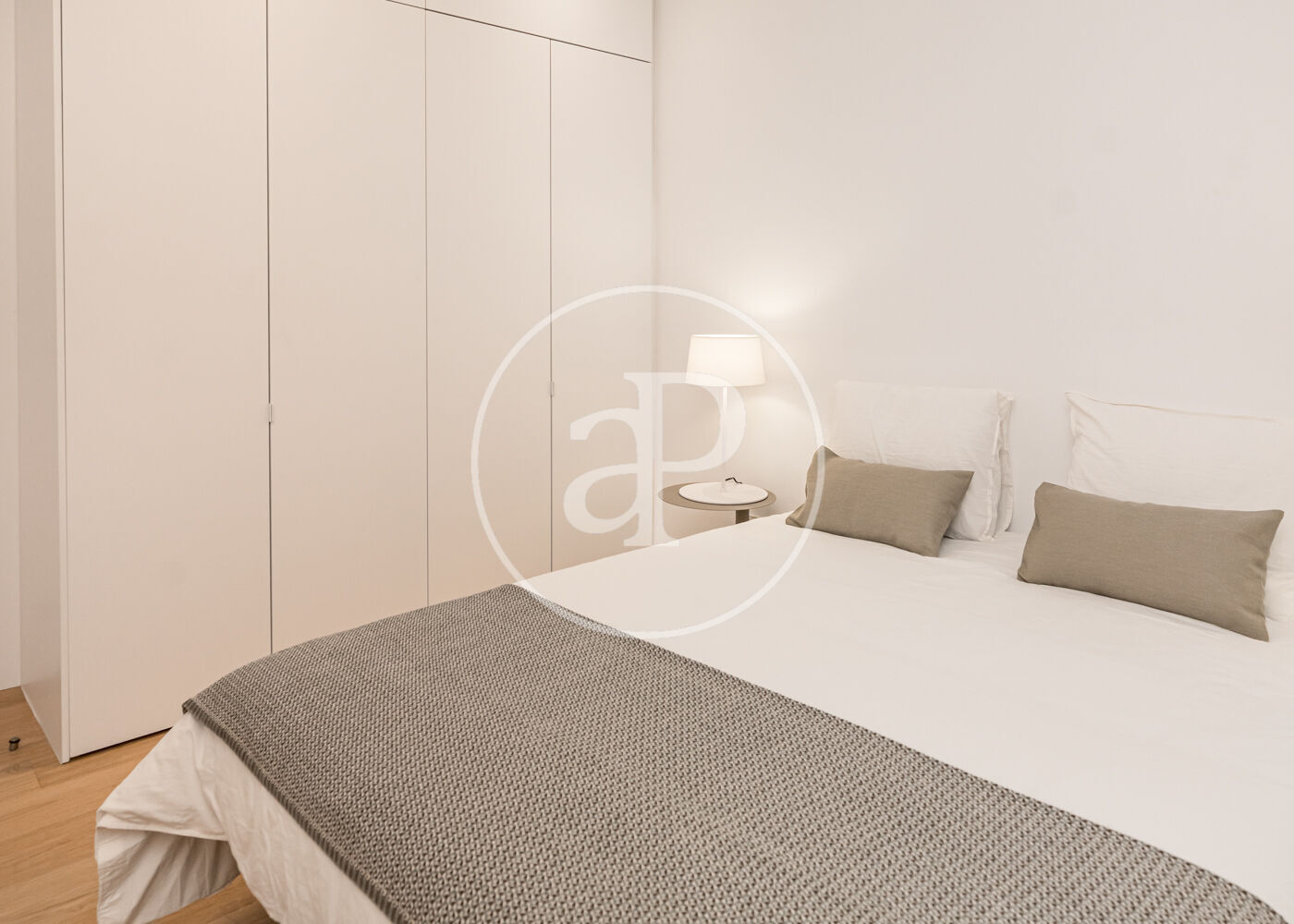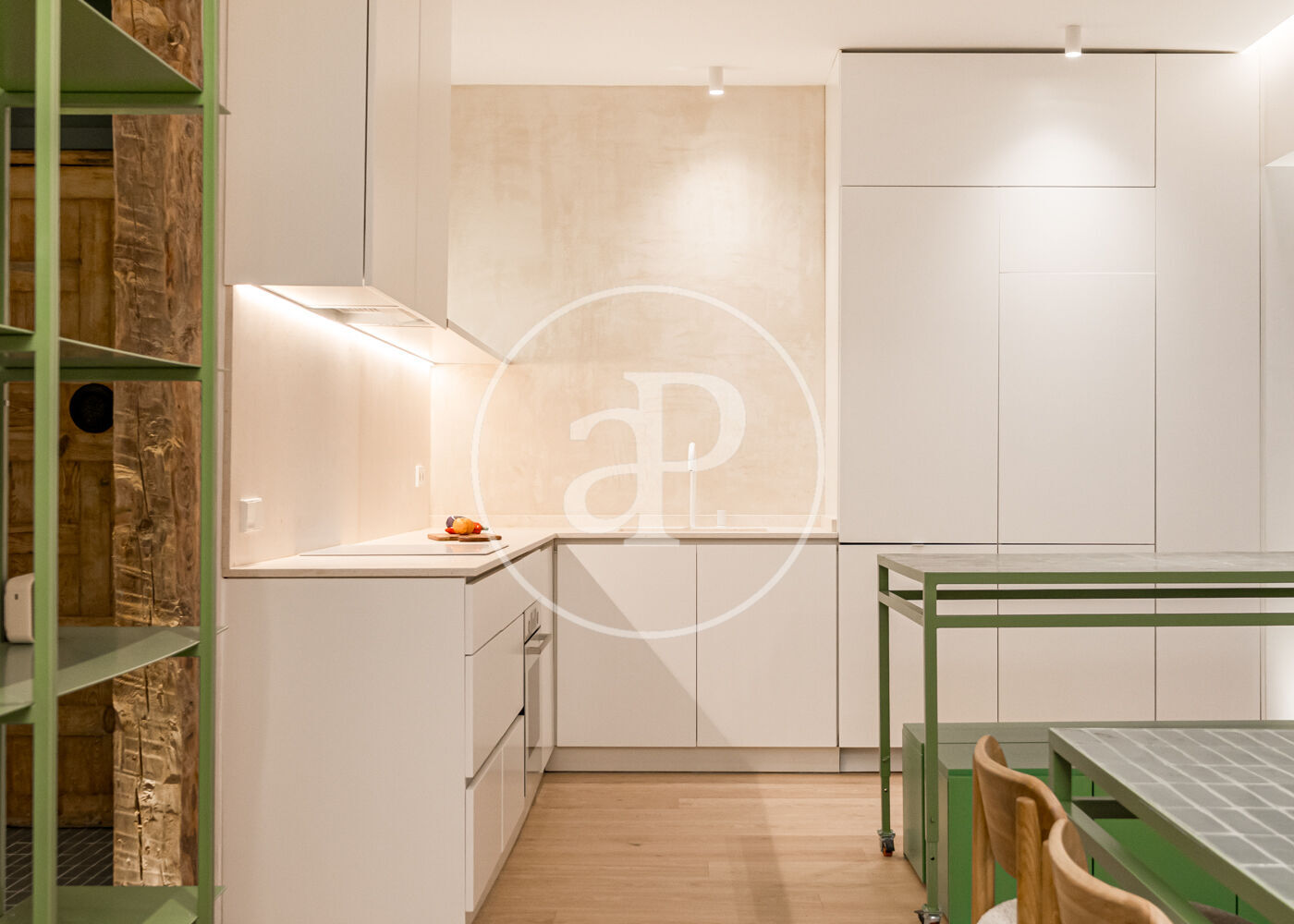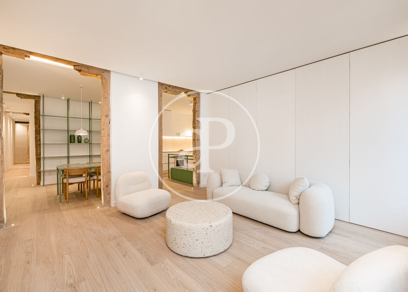 El proyecto ha sido desarrollado por arquitectos con una clara vocación de diseño. Gran parte del mobiliario y los elementos funcionales han sido concebidos a medida, incluyendo la cocina integrada, las estanterías tipo biblioteca, los armarios empotrados y el mobiliario de los baños con duchas italianas. Los suelos de madera refuerzan la sensación de calidez y continuidad entre los espacios.