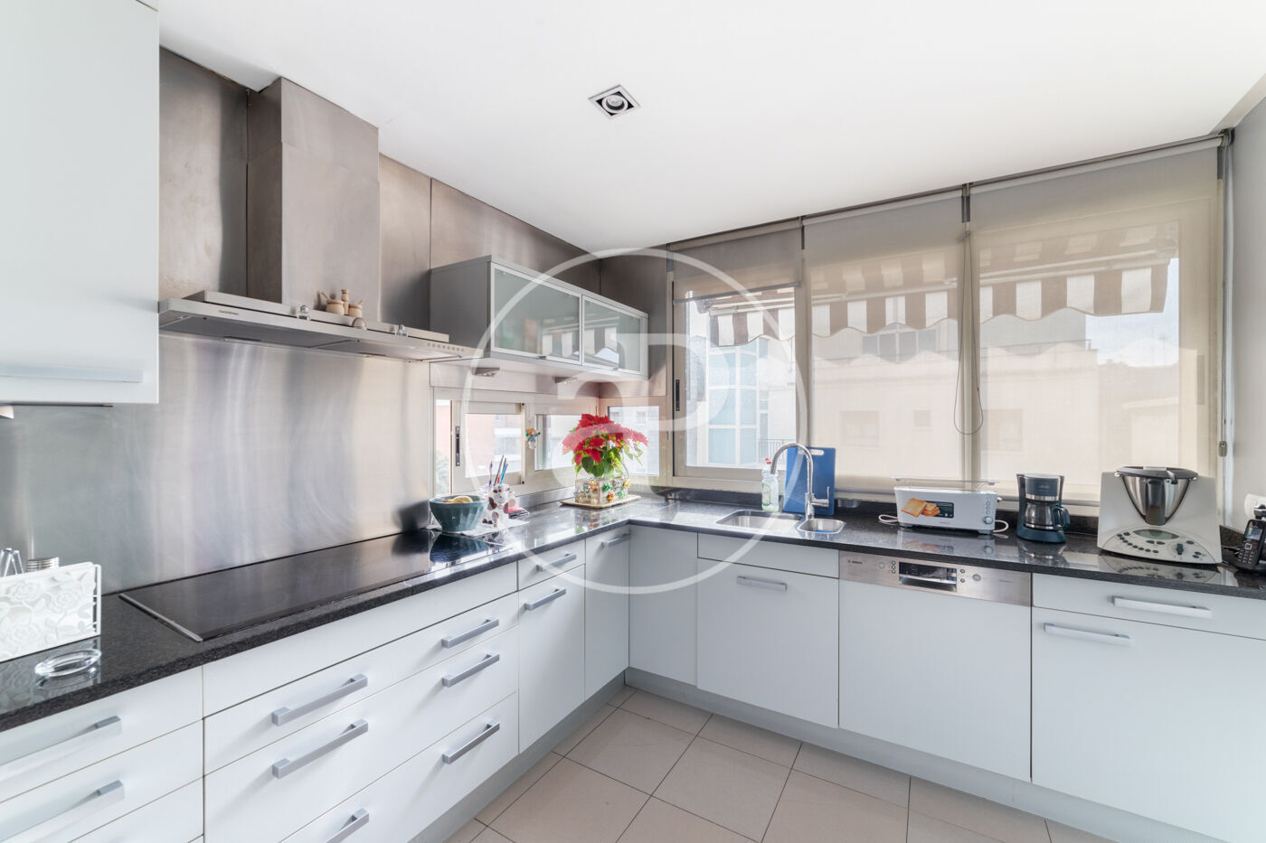 La primera planta consta de un recibidor que nos dirige a un amplio salón comedor en dos alturas, con grandes ventanales, orientado al sur y al norte, un cuarto de estar que puede quedar abierto con puertas correderas y un aseo en pasillo. La cocina independiente está equipada con electrodomésticos de alta gama, gran capacidad de almacenaje y un montaplatos que comunica con la planta superior. Junto a ella la zona de servicio, con zona de lavado, dormitorio y baño. La zona de noche se compone de dos dormitorios, ambos con baño completo en suite y numerosos armarios empotrados.