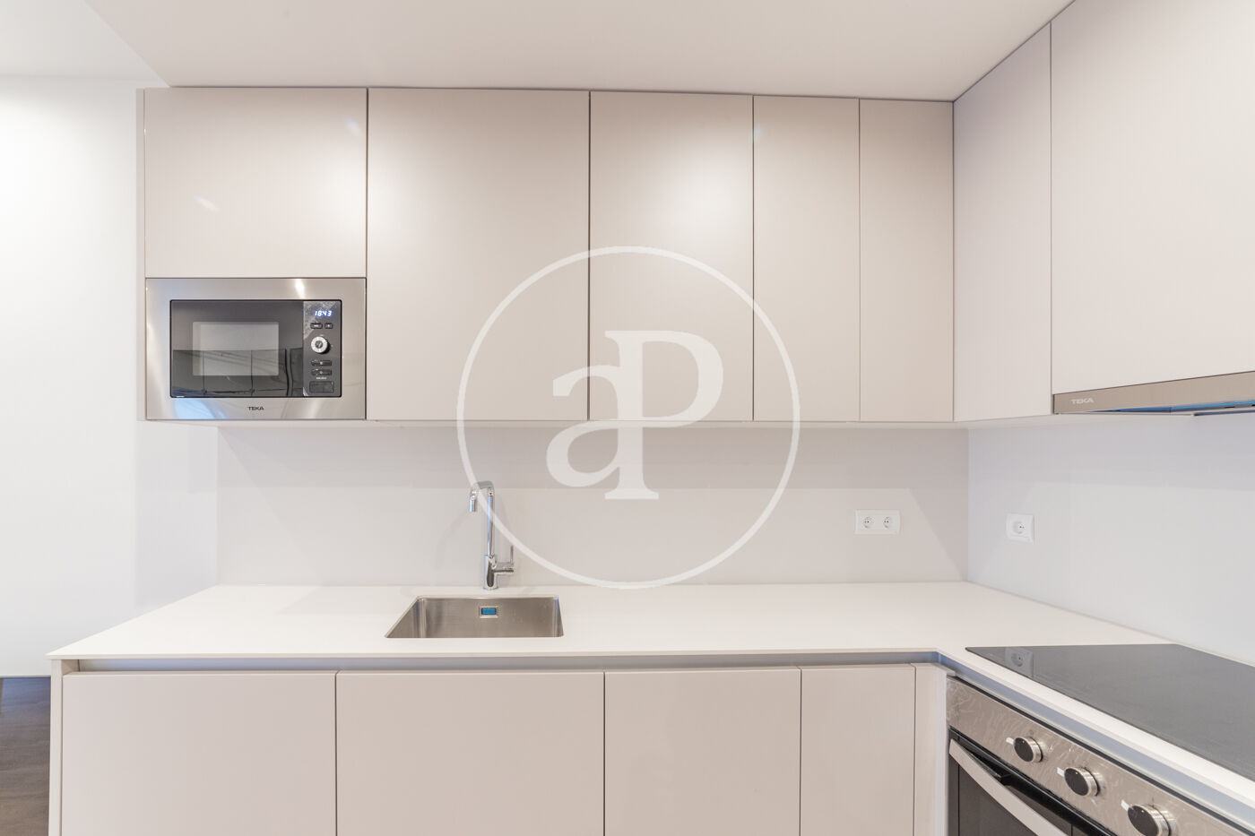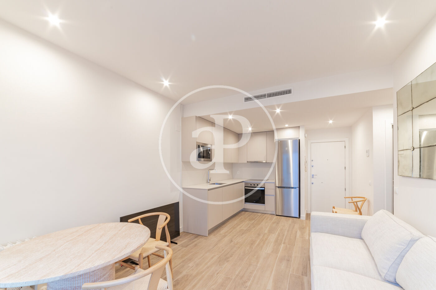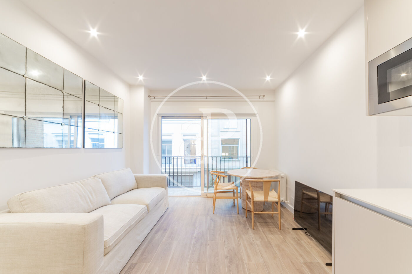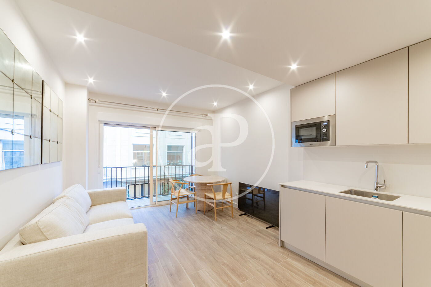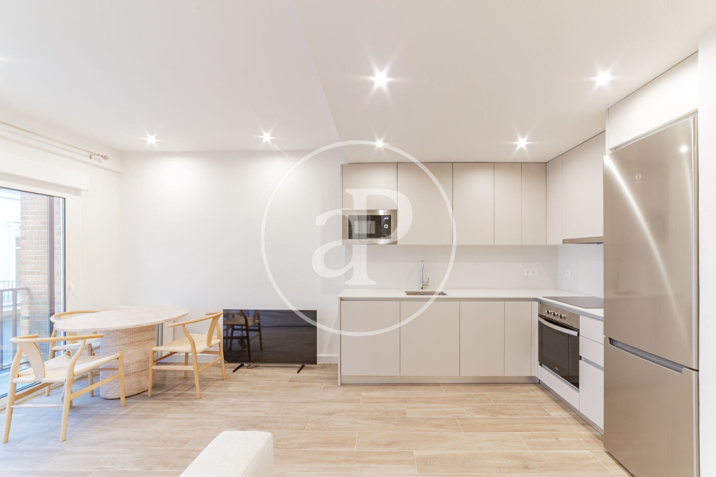 El salón con cocina integrada destaca por su luminosidad, gracias a un gran ventanal que da acceso a un balcón espacioso, ideal para disfrutar de la luz natural durante todo el día.