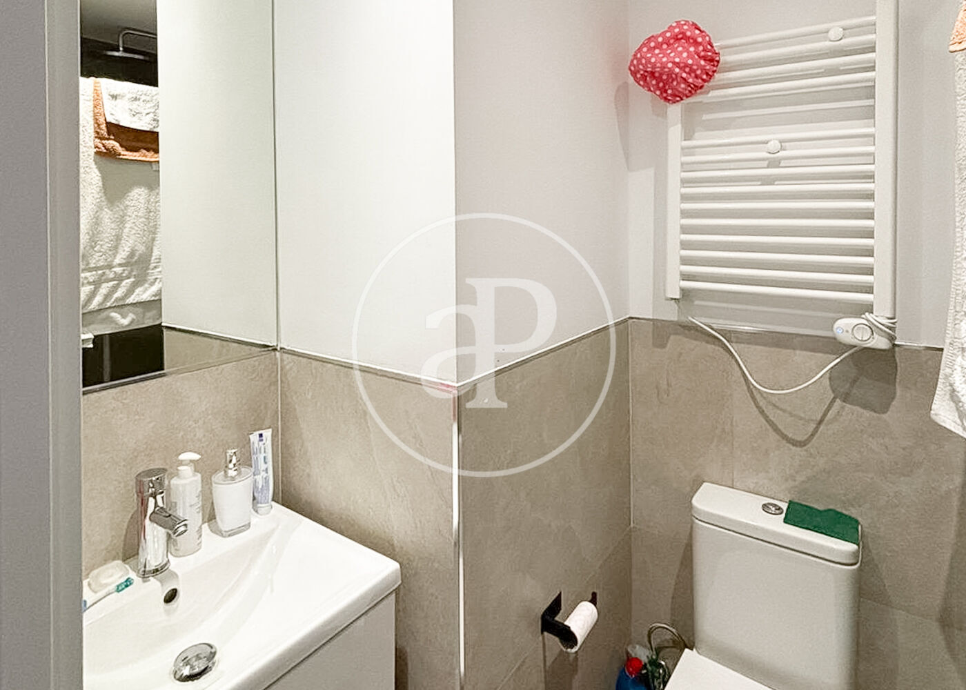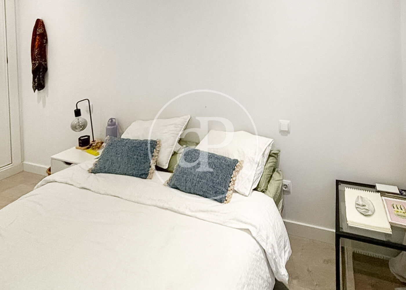 El piso cuenta con dos (2) dormitorios dobles de buen tamaño y con dos cuartos de baño (uno con ducha y otro con bañera). Se entrega amueblado y con la cocina completamente equipada con electrodomésticos de primera gama (horno, vitro, frigorífico, lavadora, lavavajillas). Calefacción individual eléctrica y aire acondicionado en todas las estancias por split (bomba frío y calor).