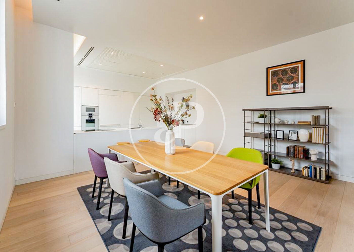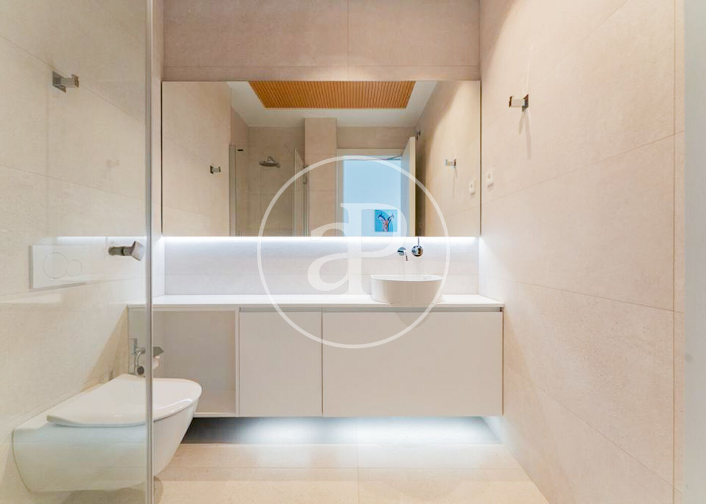 Climatización individual en cada estancia por suelo radiante y aire acondicionado por conductos con la mayor eficiencia energética. Cocina con electrodomésticos de última generación todos panelados para conservar la estetica. La zona de día se compone por gran espacio donde se integran el salón, el comedor y la cocina abierta. El piso tiene una increíble iluminación por sus grandes ventanales y gran orientación (sur y este).