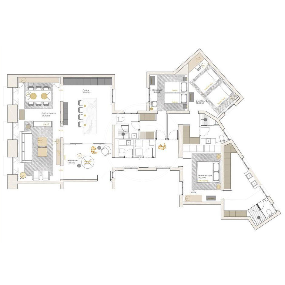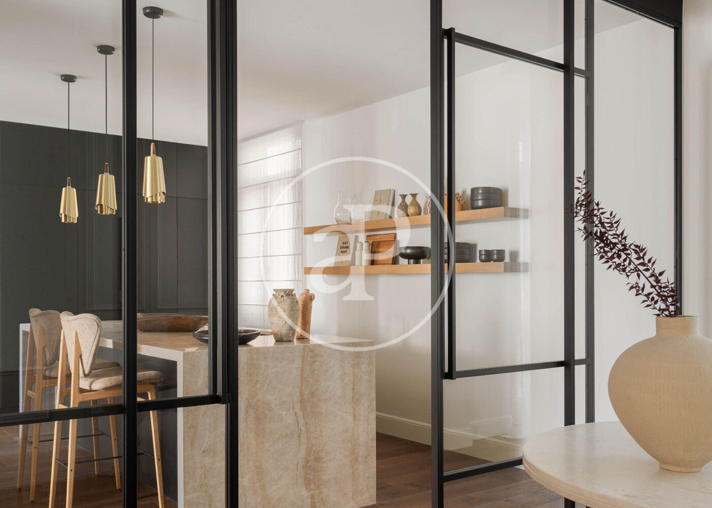 La cocina es independiente y además cuenta con aseo de cortesía para las visitas. La zona de noche la componen tres habitaciones dobles con baños en suite. La rehabilitación se ha realizado de forma muy cuidada, tanto en el diseño como en la elección de acabados y la decoración y mobiliario es de una reconocida interiorista. Su excelente ubicación, rodeada de los mejores restaurantes y boutiques de lujo, así como su buena comunicación, hacen que esta vivienda sea una oportunidad ideal para vivir en la zona más prime de Recoletos.
