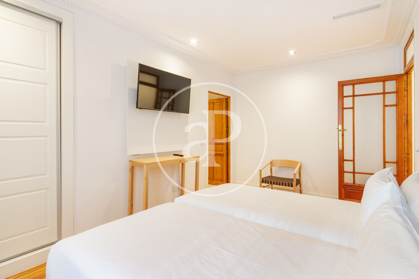 Situado en edificio representativo en pleno centro de Madrid, amplio apartamento cuidado al detalle, compuesto de salón exterior con sofá cama, con acceso a una gran terraza con tumbonas, cocina independiente, dos dormitorios, el primero con literas y baño independiente y destacando el enorme dormitorio principal con dos camas de 90 cm juntas, con balcón exterior y baño en suite. Gran capacidad de almacenaje.
