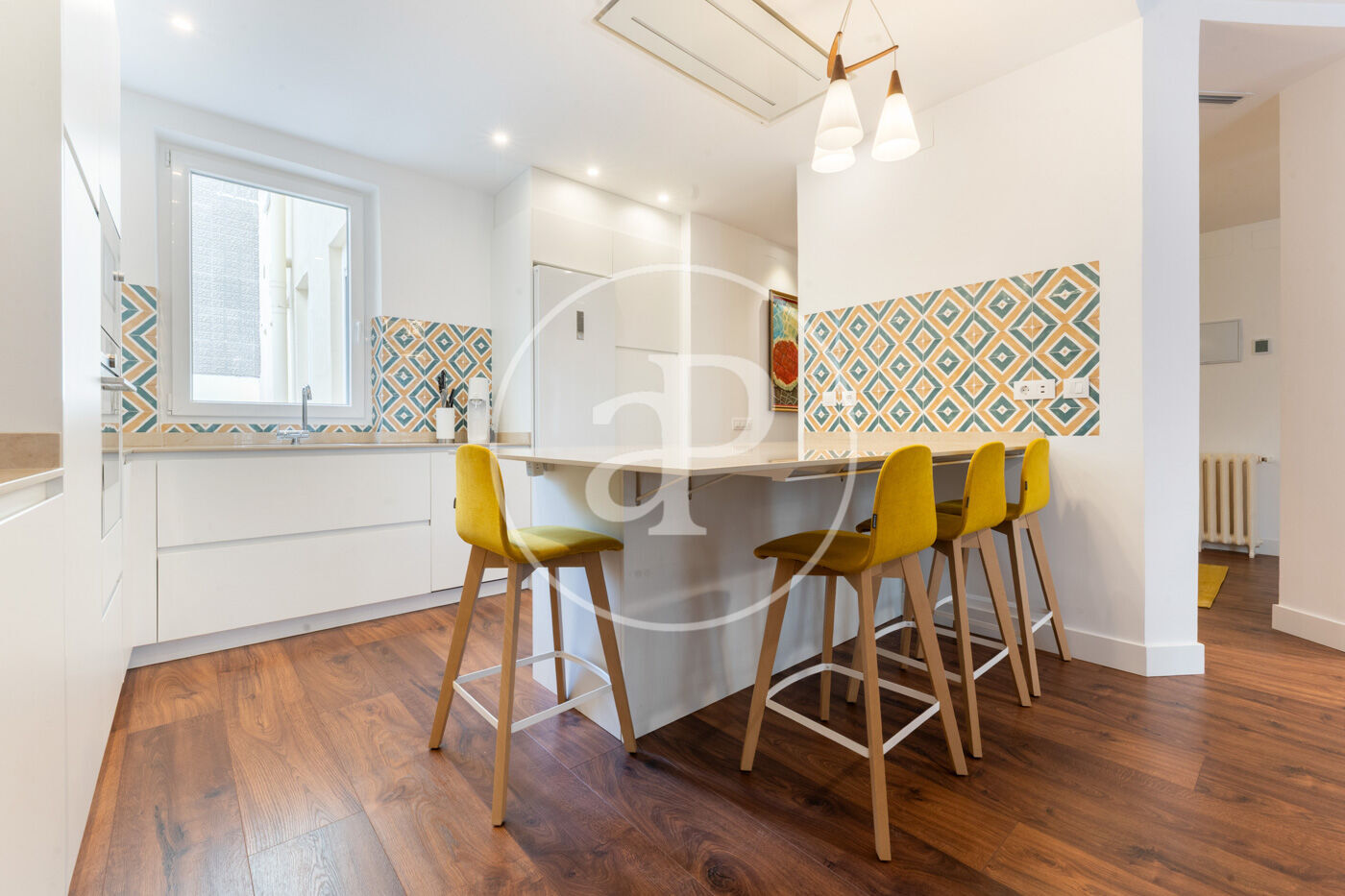 La zona de día está compuesta por un gran salón comedor con cocina integrada que destaca por sus tres amplios ventanales a la calle de orientación oeste que inundan la estancia de luz natural creando un ambiente muy acogedor. La cocina cuenta con todos los electrodomésticos de alta gama panelados y ha sido diseñada cuidando todos los detallas para aprovechar al máximo todo el espacio con gran elegancia y sin olvidar la comodidad.
