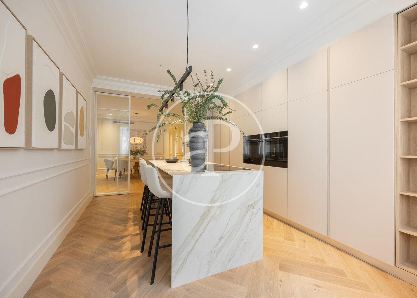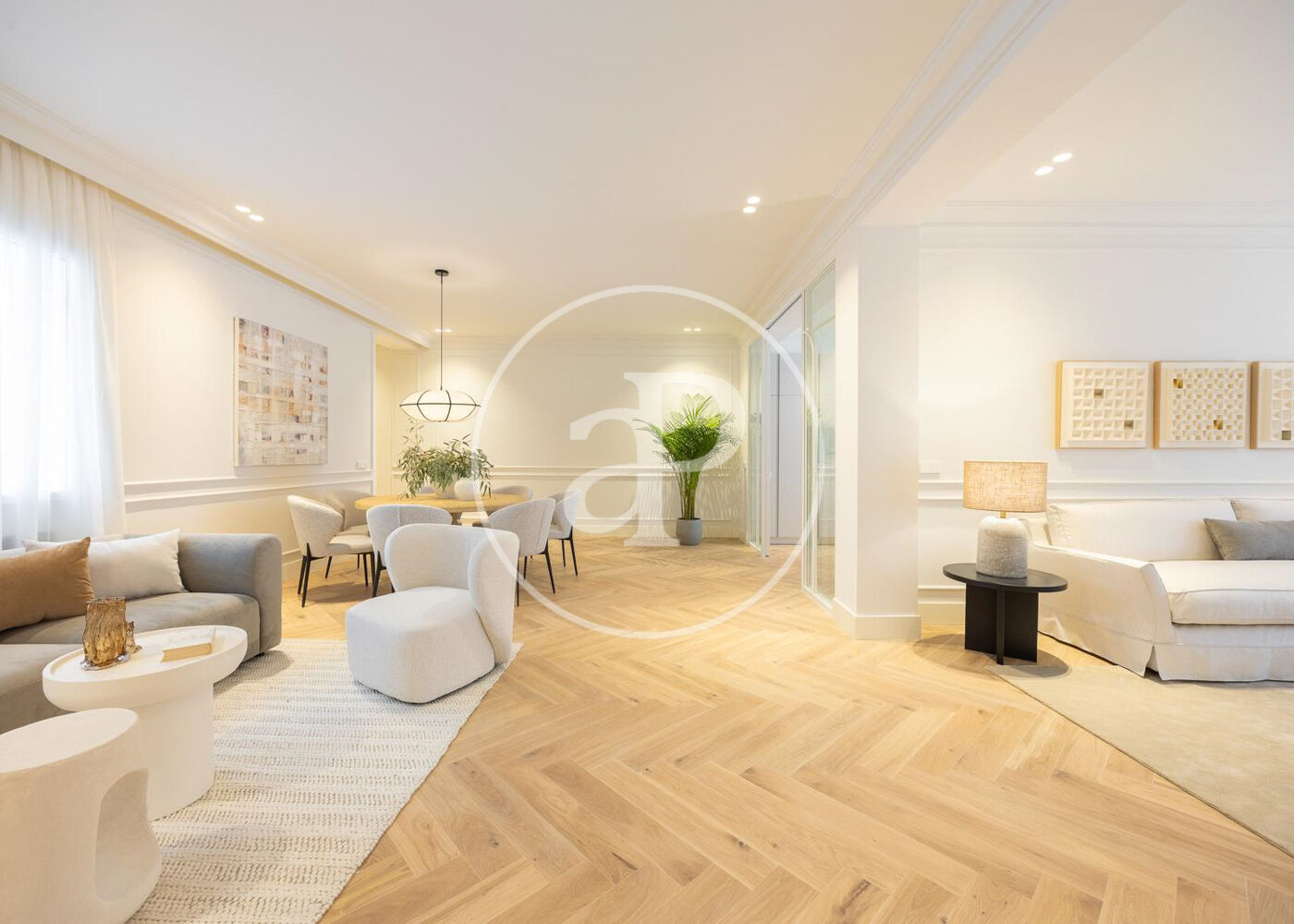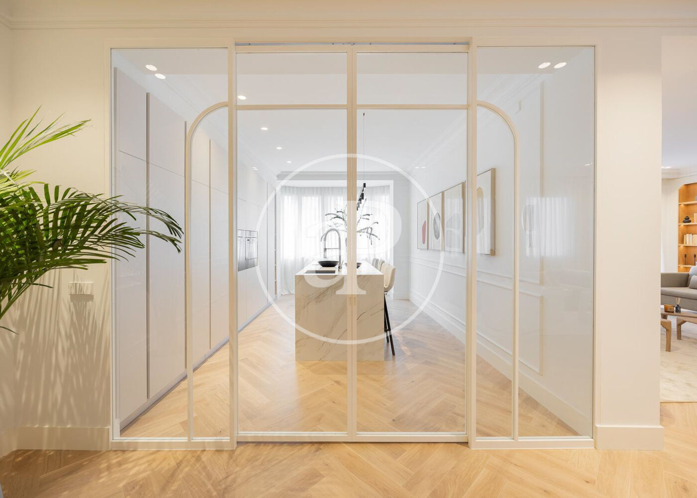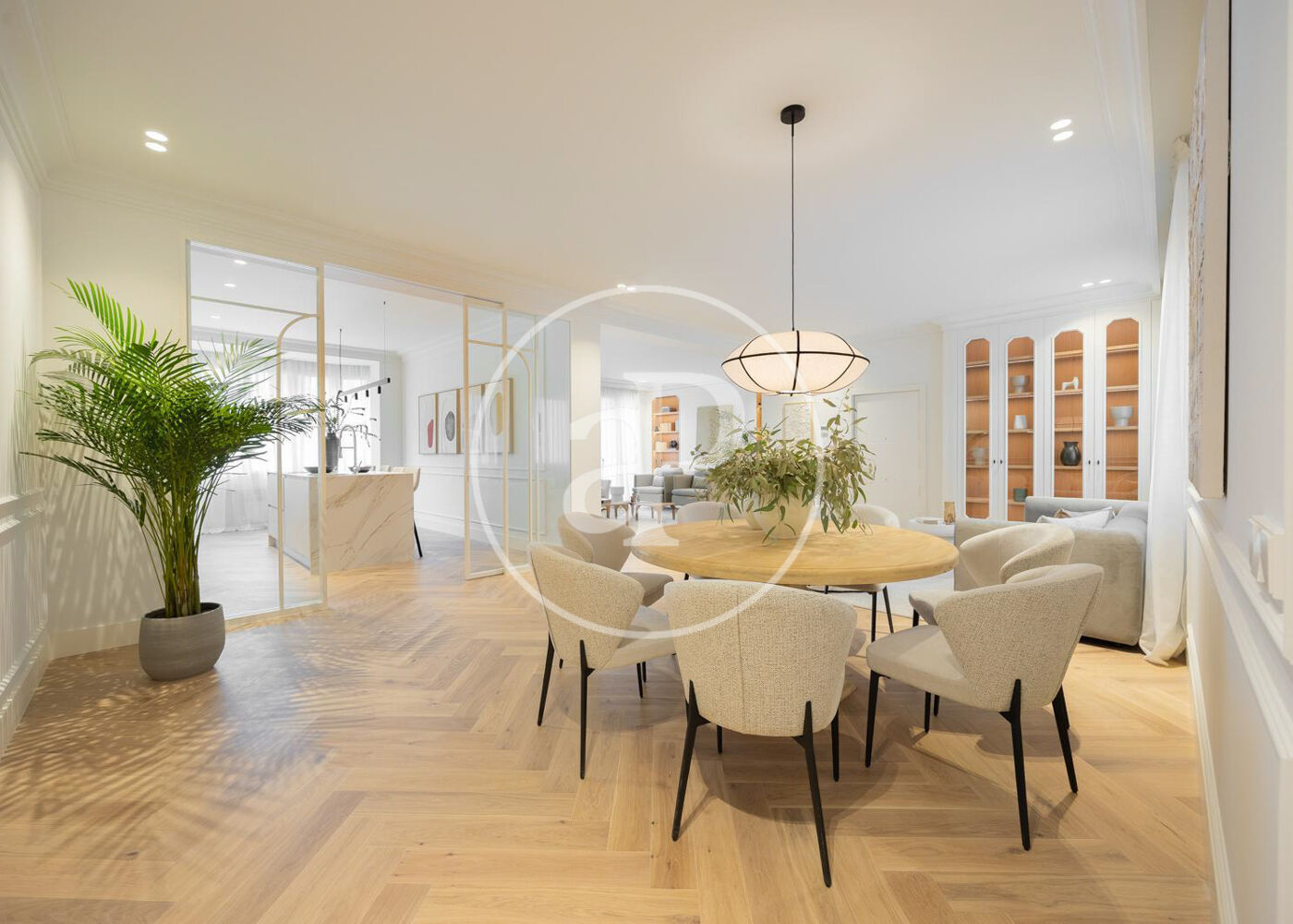 La zona de día cuenta con un magnífico salón comedor con tres grandes ventanales a la calle, abierto a una preciosa cocina de diseño Completamente equipada. Además, tiene un bonito aseo de cortesía y una práctica zona de lavandería.