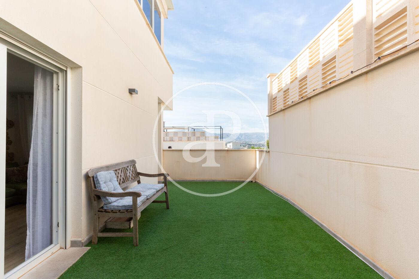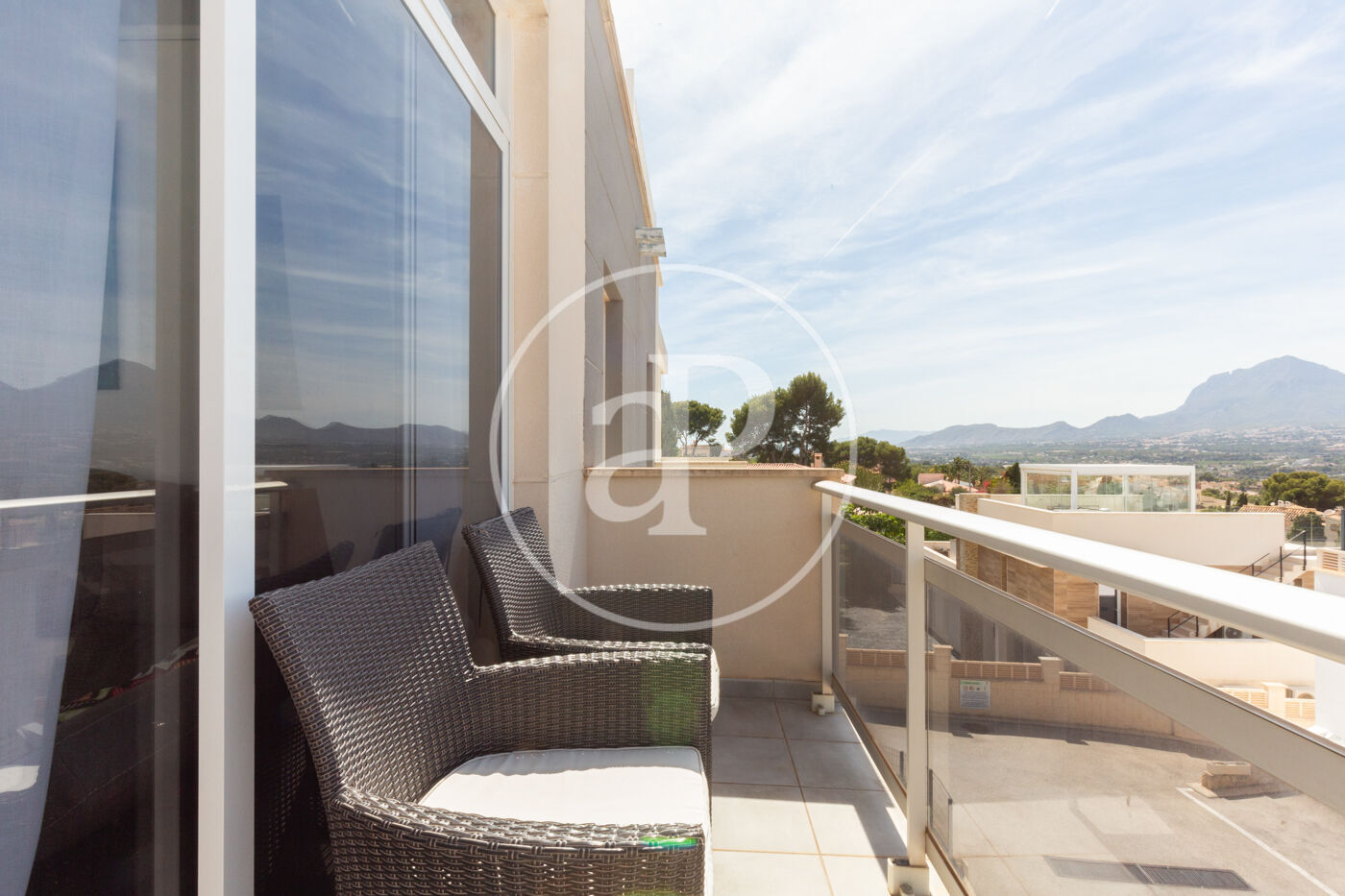 La vivienda es una casa adosada de tres alturas más sótano, con acabados modernos y fantásticas vistas al Albir, las montañas, e incluso al mar. Esta bonita casa dispone de 4 habitaciones y 3 baños, un bonito salón con salida a una gran terraza esquinera y una moderna cocina completa. El sótano está acabado, ofreciendo un espacio de 72m² que puede destinarse a sala de ocio, espacio para invitados, o cualquier otra necesidad. La vivienda incluye un garaje cerrado, además de otra plaza de parking en el exterior. En la parcela exterior de la entrada principal, se encuentra una fabulosa terraza de 22m².
