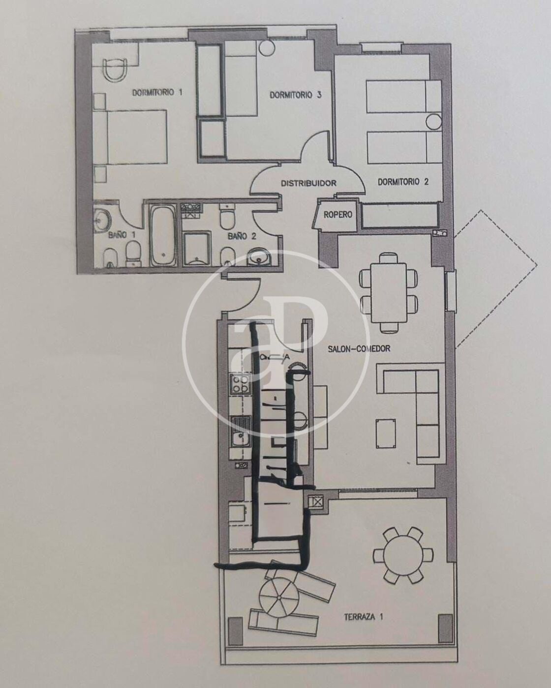 La distribución interior cuenta con tres dormitorios luminosos, todos con armarios empotrados —el principal con baño en suite— y dos baños completos. La cocina, de estilo moderno y completamente reformada, se integra con armonía en el conjunto del hogar. Los suelos laminados Quickstep, resistentes al agua, aportan durabilidad y una estética cuidada con fácil mantenimiento.