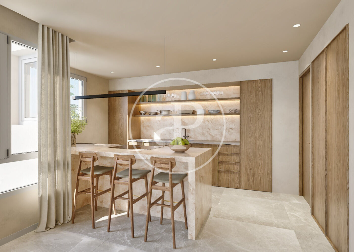 La cocina, integrada en la zona de estar, ha sido diseñada con una isla central de piedra natural y mobiliario de madera, combinando funcionalidad y estética en un espacio pensado tanto para el día a día como para recibir invitados.
