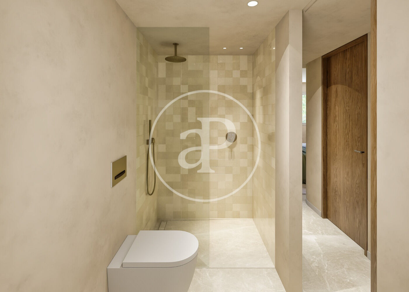 Los tres baños presentan un diseño moderno y cuidado, equipados con amplias duchas a ras de suelo, lavabos de piedra natural, grifería de alta calidad y una iluminación suave que aporta una atmósfera relajante.