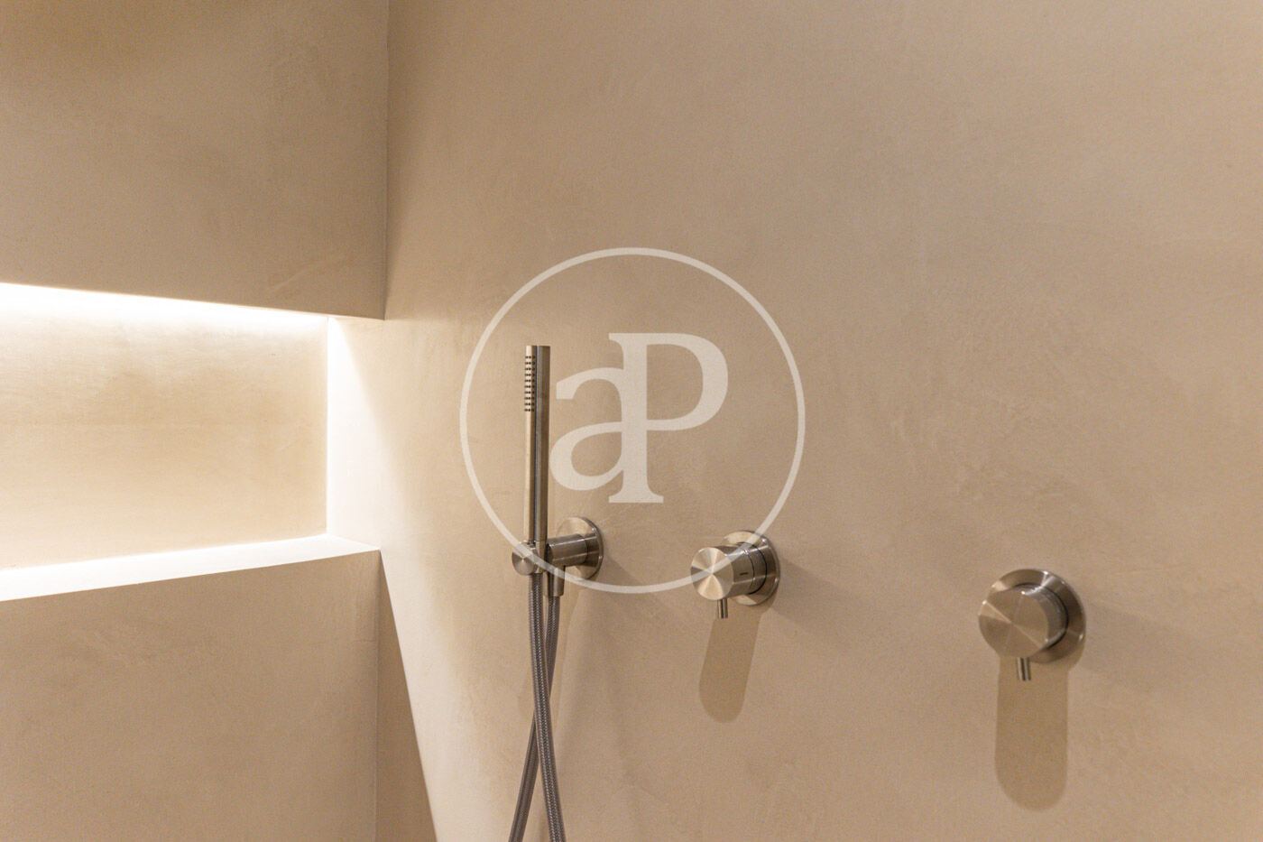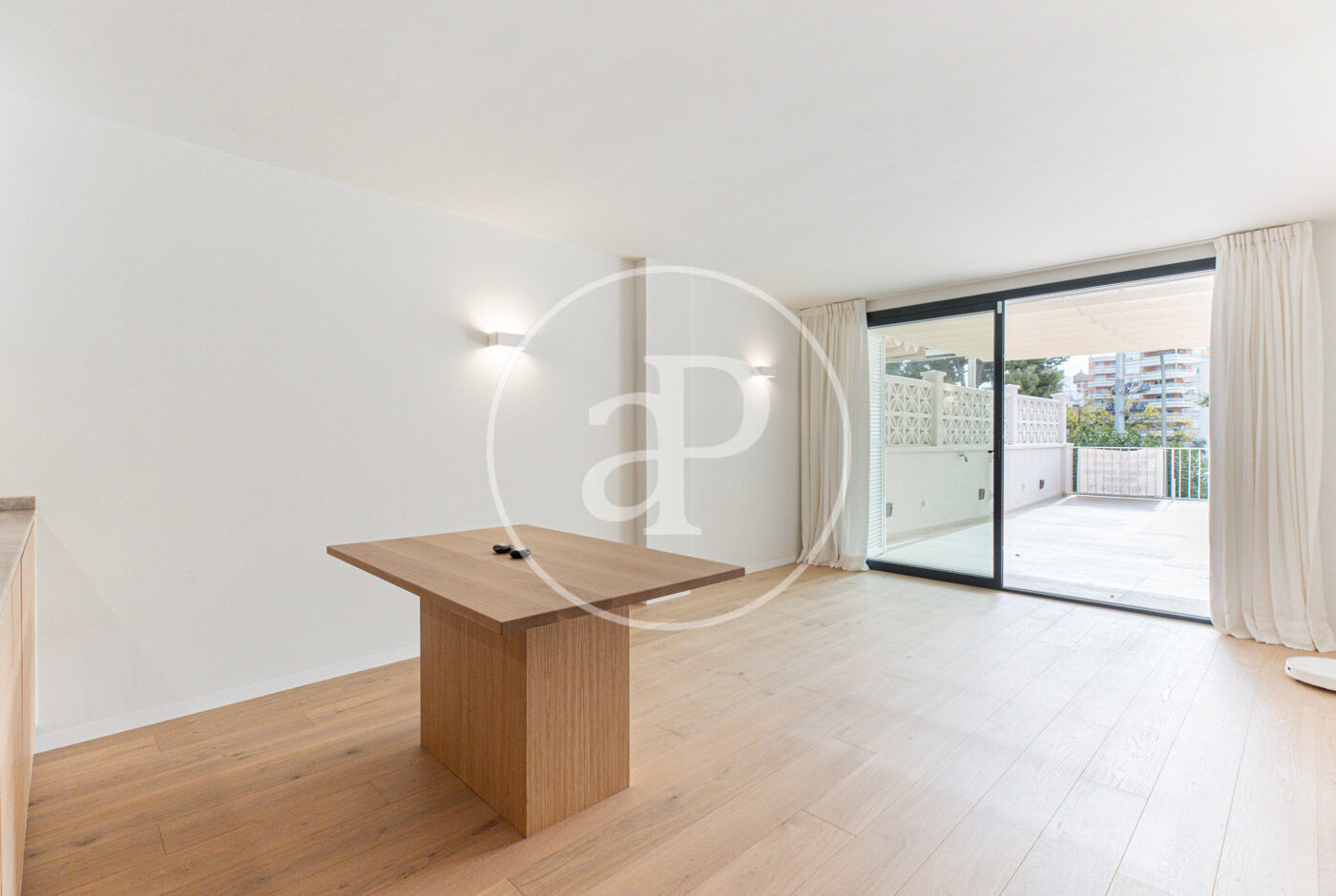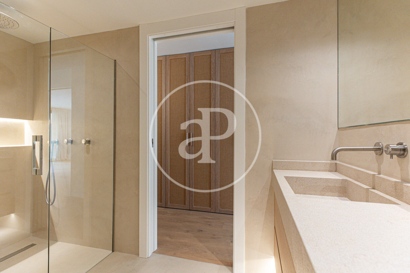 Desde la puerta de entrada a la vivienda, accedemos a un luminoso salón-comedor con un gran ventanal con salida a una terraza con una pérgola ideal para disfrutar del clima mediterráneo y con vistas despejadas al conocido “Palma Sport and Tennis Club”. La cocina, de estilo nórdico, abierta al salón, se encuentra completamente amueblada y equipada con electrodomésticos de última generación e impecables acabados. En una de las terrazas encontramos la coladuría, en la que encontramos armarios hechos a medida para la lavadora- secadora, con mucho espacio de almacenamiento.