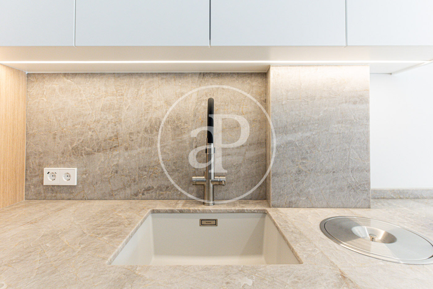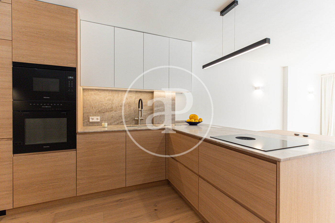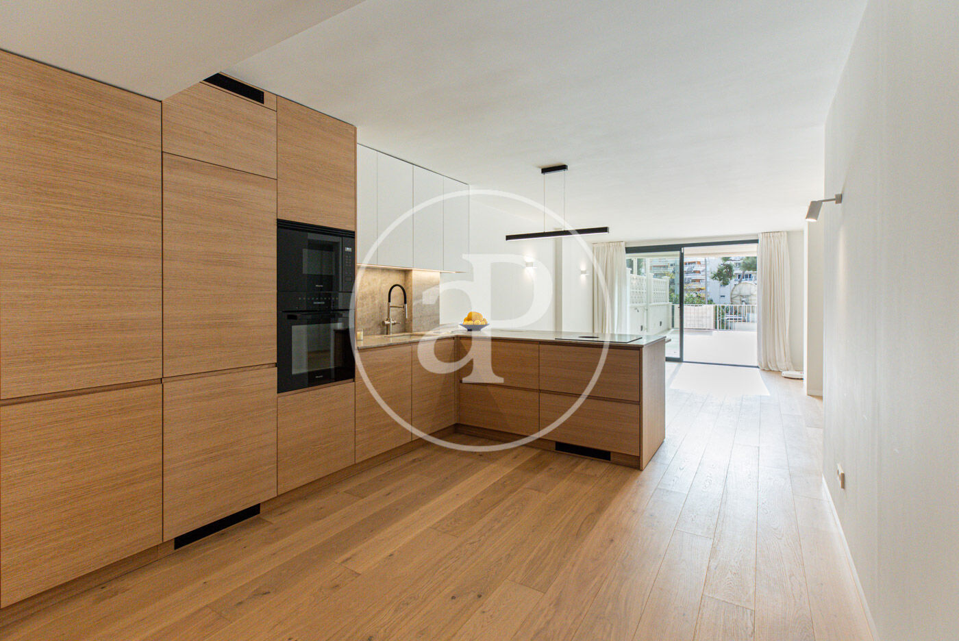 Desde la puerta de entrada a la vivienda, accedemos a un luminoso salón-comedor con un gran ventanal con salida a una terraza con una pérgola ideal para disfrutar del clima mediterráneo y con vistas despejadas al conocido “Palma Sport and Tennis Club”. La cocina, de estilo nórdico, abierta al salón, se encuentra completamente amueblada y equipada con electrodomésticos de última generación e impecables acabados. En una de las terrazas encontramos la coladuría, en la que encontramos armarios hechos a medida para la lavadora- secadora, con mucho espacio de almacenamiento.