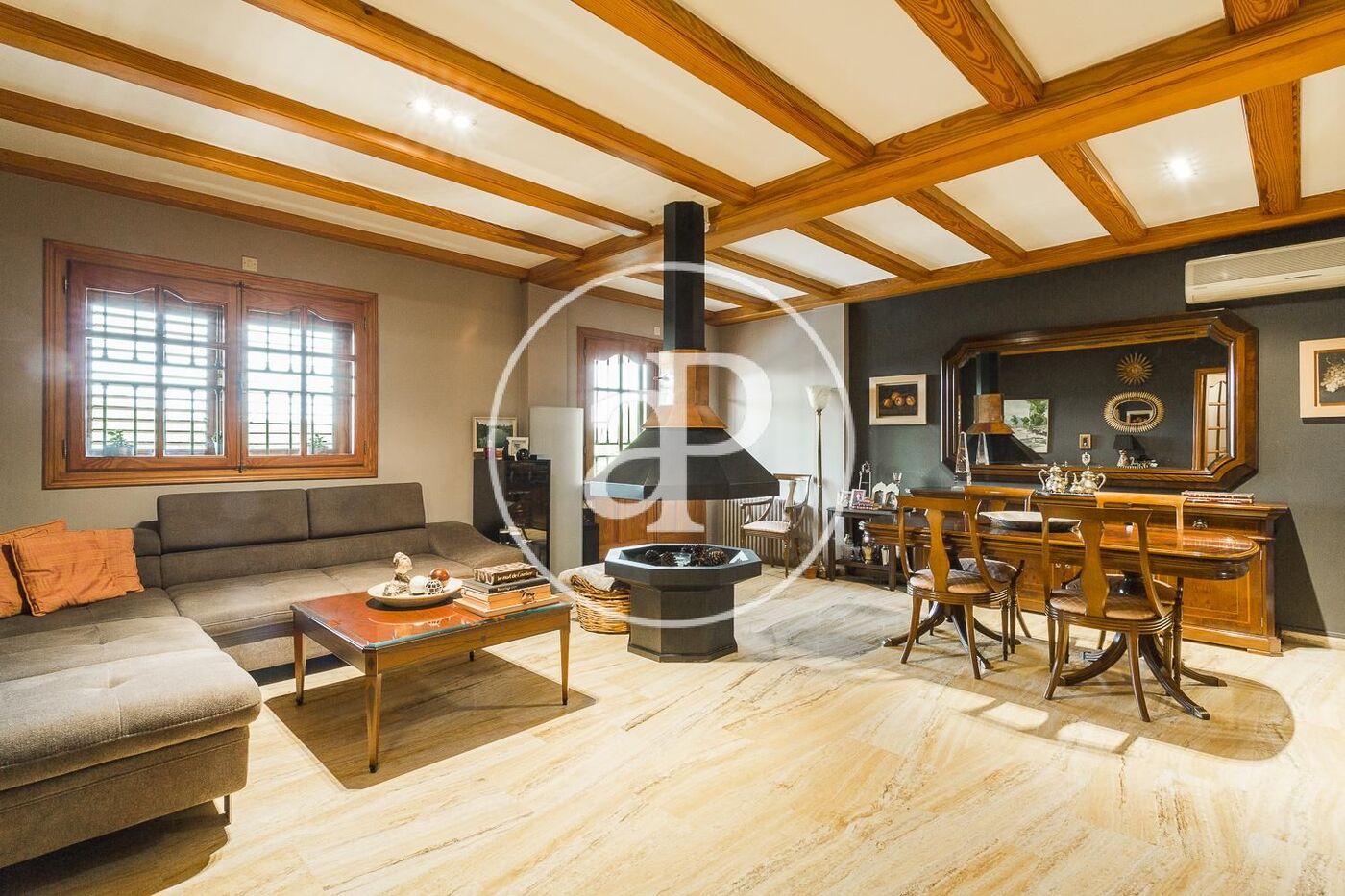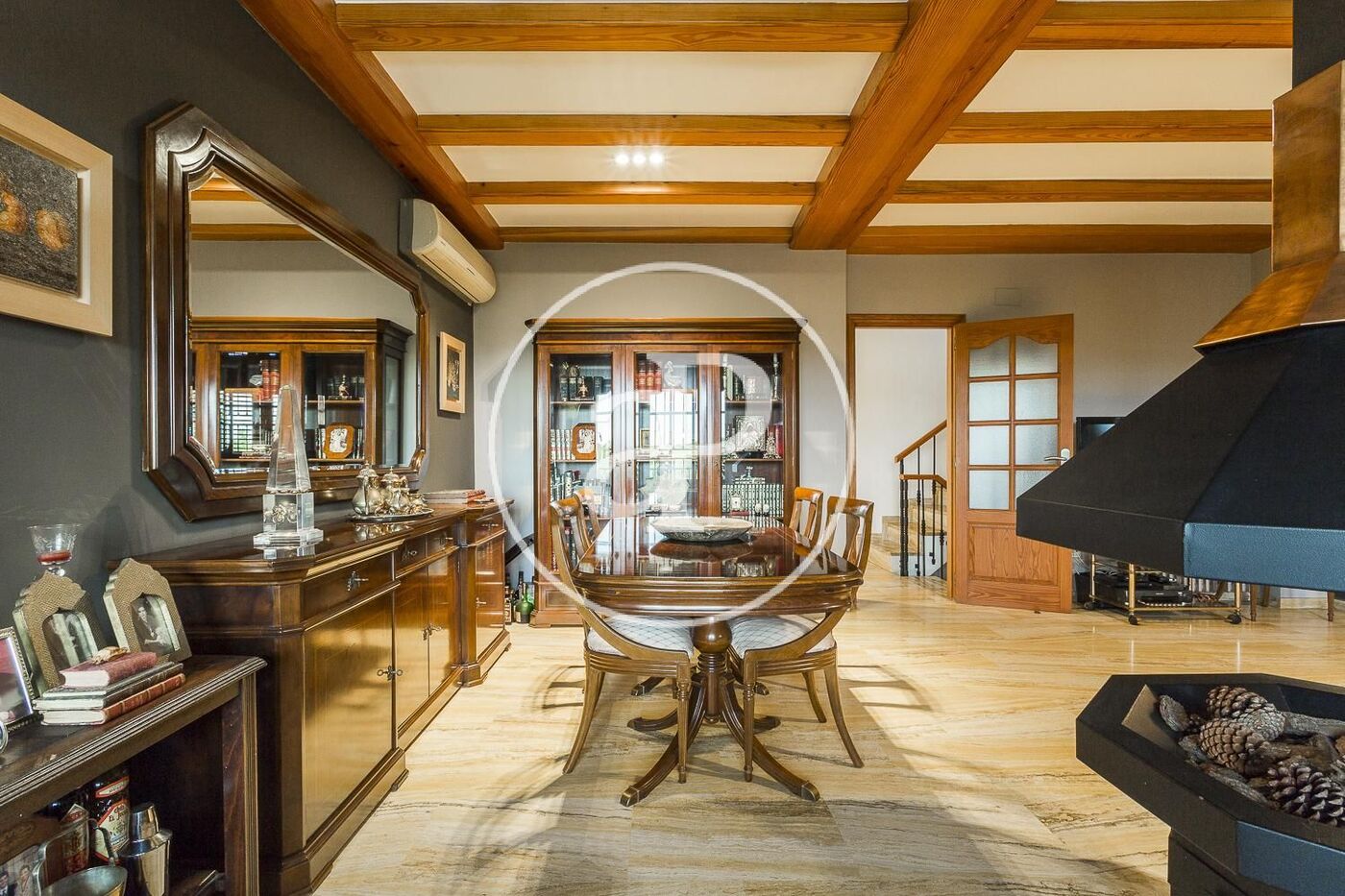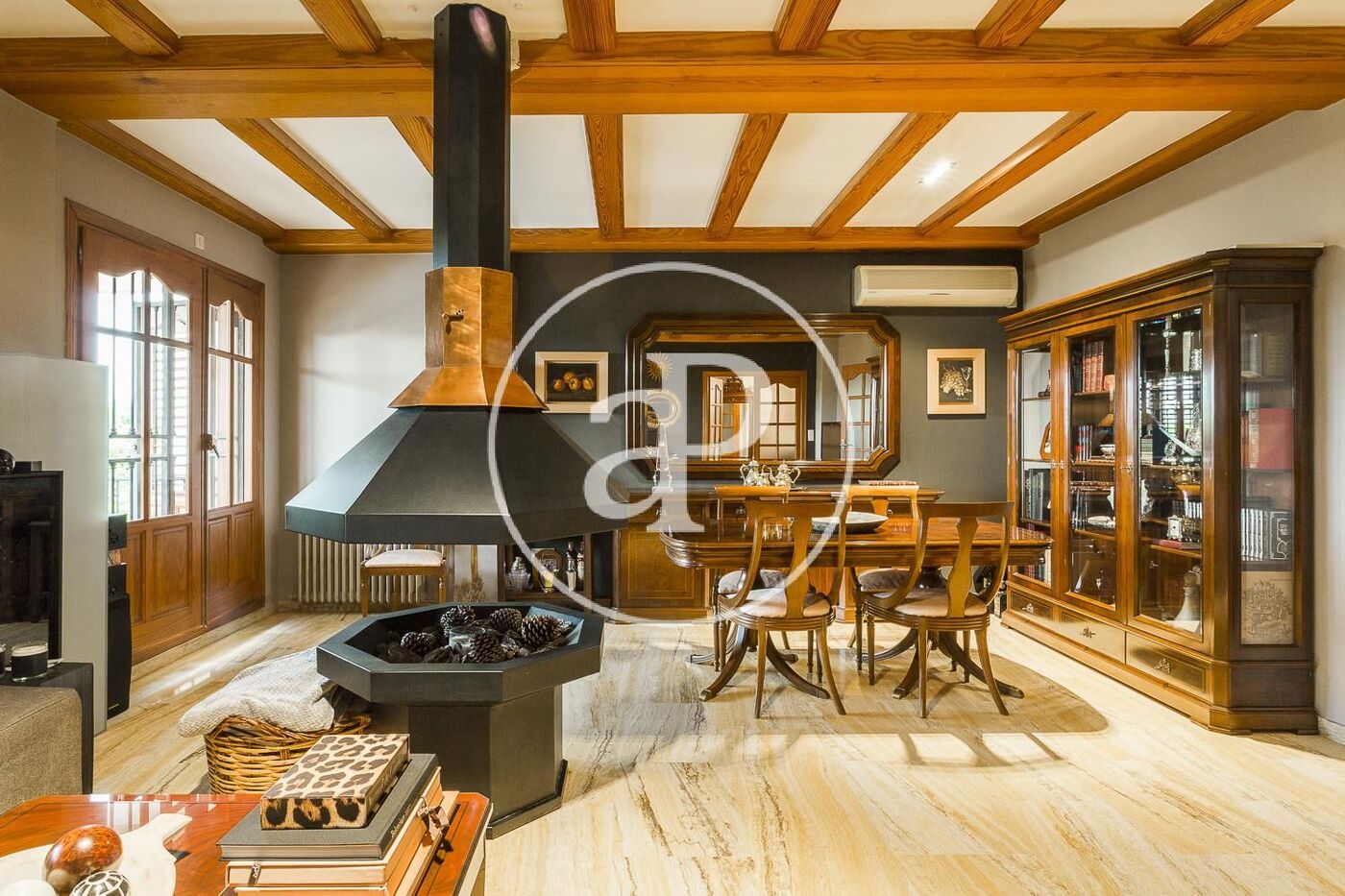 Aire acondicionado, calefacción central por radiadores, vigas de madera en techos, pavimento en salón comedor en mármol travertino y parquet en todas las estancias de noche, gas natural…