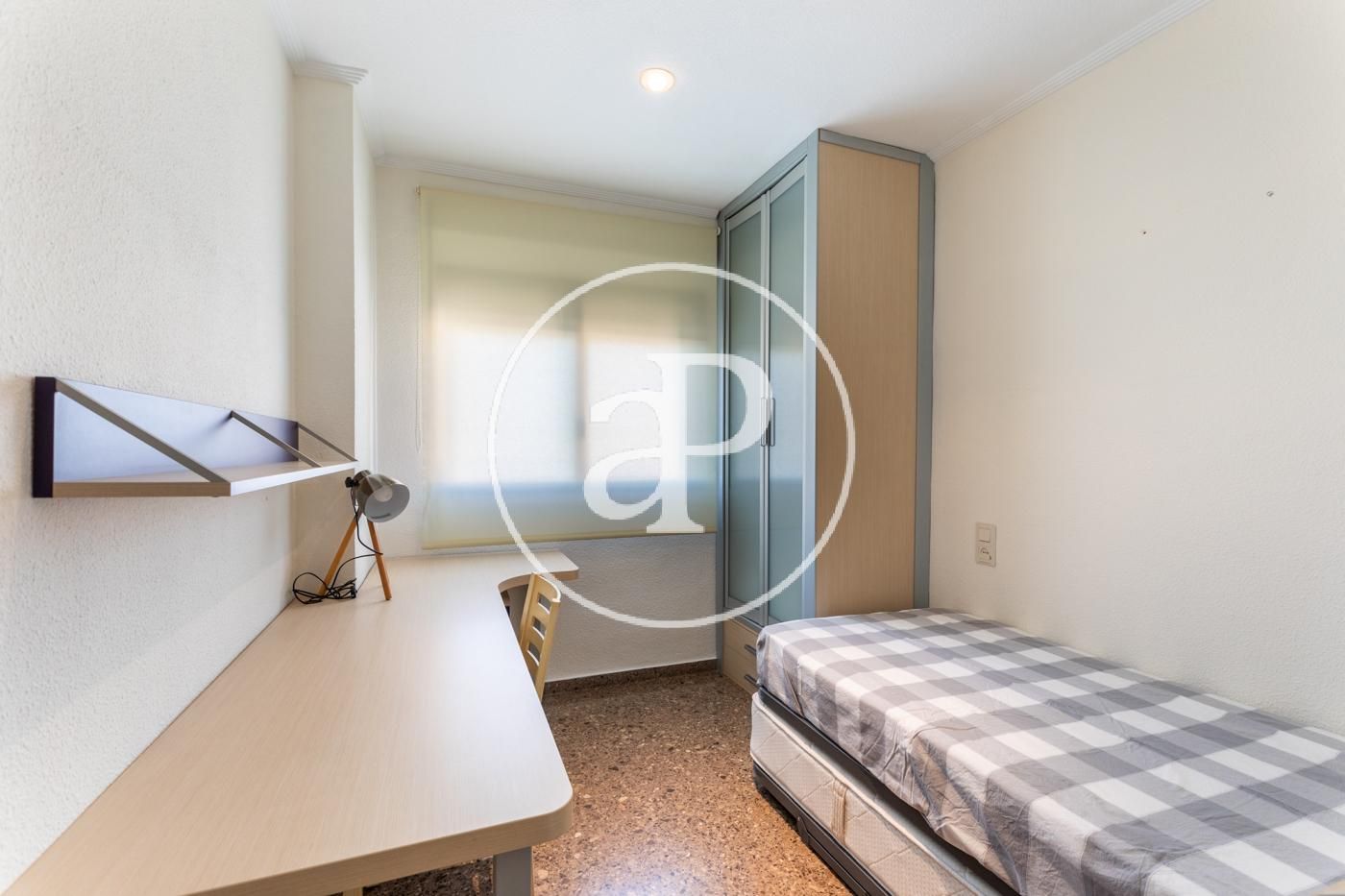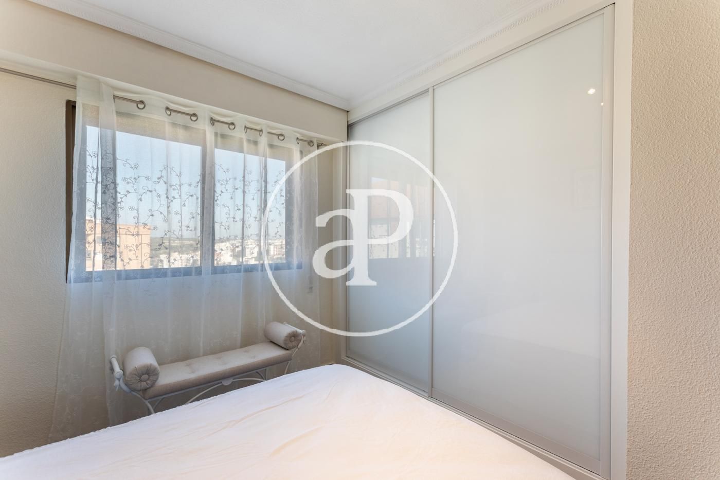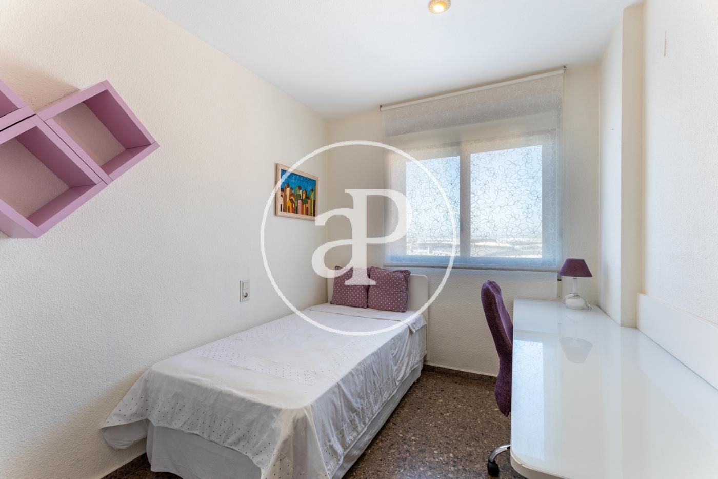 Su superficie se distribuye en distribuidor totalmente vestido y enfrente tenemos comedor-salón equipado con un balcón, el cual, dispone de vistas tanto a la ciudad de valencia como a las montañas. El comedor-salón esta amueblado y consta de varios ventanales donde se ven las montañas para su deleite. La cocina es individual, en forma de ele con mesa para poder comer en ella, equipada con todos los electrodomésticos. 2 cuartos de baño exteriores, uno de ellos en suite con todo el equipamiento accesible. Consta de 3 habitaciones que dan a la zona de montaña y la de matrimonio tiene las vistas a la zona oeste, todas las habitaciones cuentan con armarios empotrados lacados en blanco. En el suelo dispone de gres en gris y zonas húmedas en color blanco.