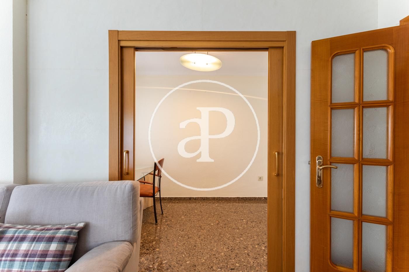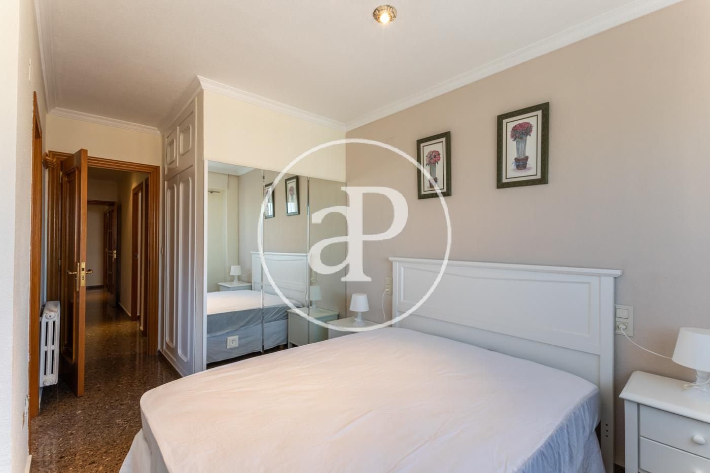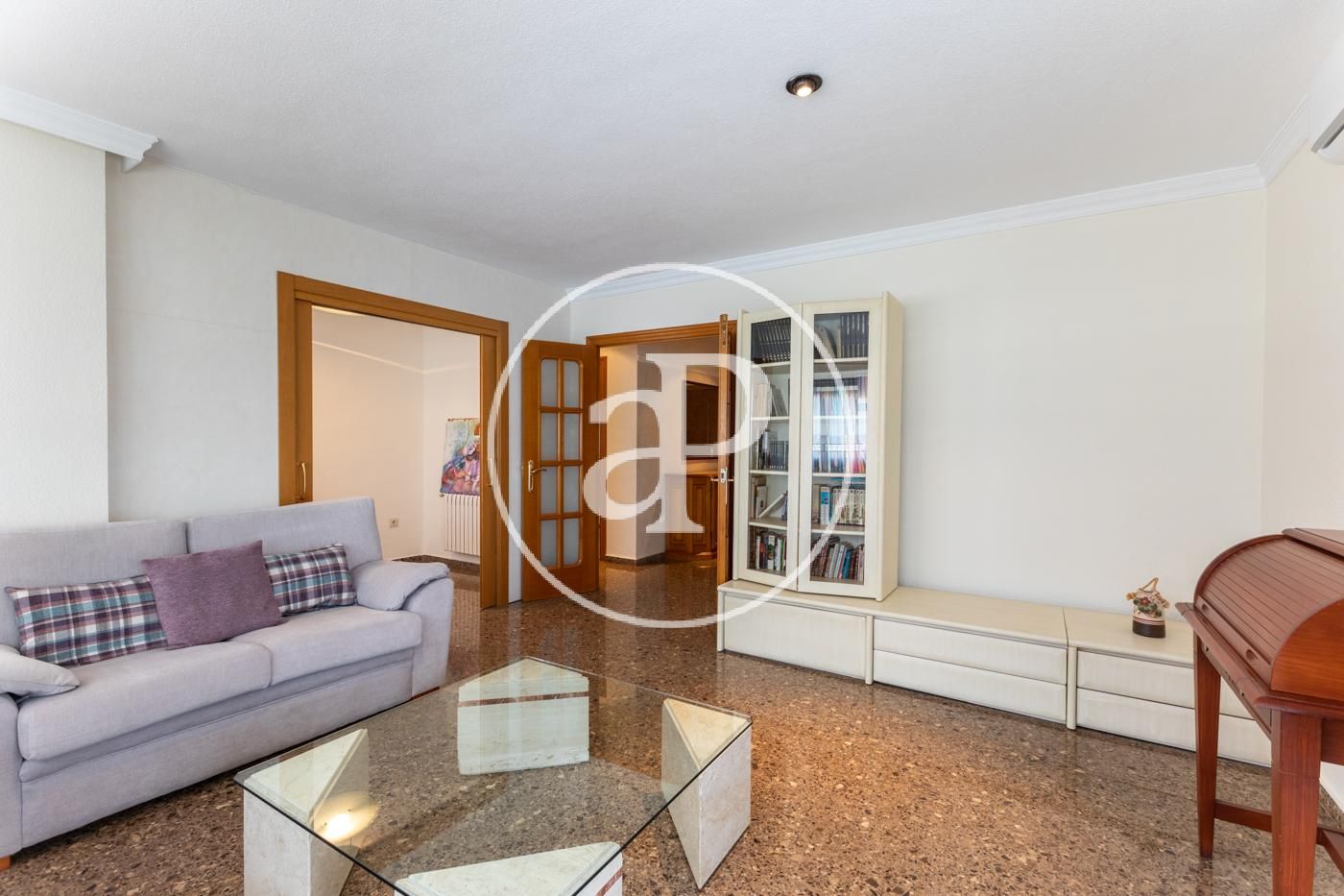 Su superficie se distribuye en distribuidor totalmente vestido y enfrente tenemos comedor-salón equipado con un balcón, el cual, dispone de vistas tanto a la ciudad de valencia como a las montañas. El comedor-salón esta amueblado y consta de varios ventanales donde se ven las montañas para su deleite. La cocina es individual, en forma de ele con mesa para poder comer en ella, equipada con todos los electrodomésticos. 2 cuartos de baño exteriores, uno de ellos en suite con todo el equipamiento accesible. Consta de 3 habitaciones que dan a la zona de montaña y la de matrimonio tiene las vistas a la zona oeste, todas las habitaciones cuentan con armarios empotrados lacados en blanco. En el suelo dispone de gres en gris y zonas húmedas en color blanco.
