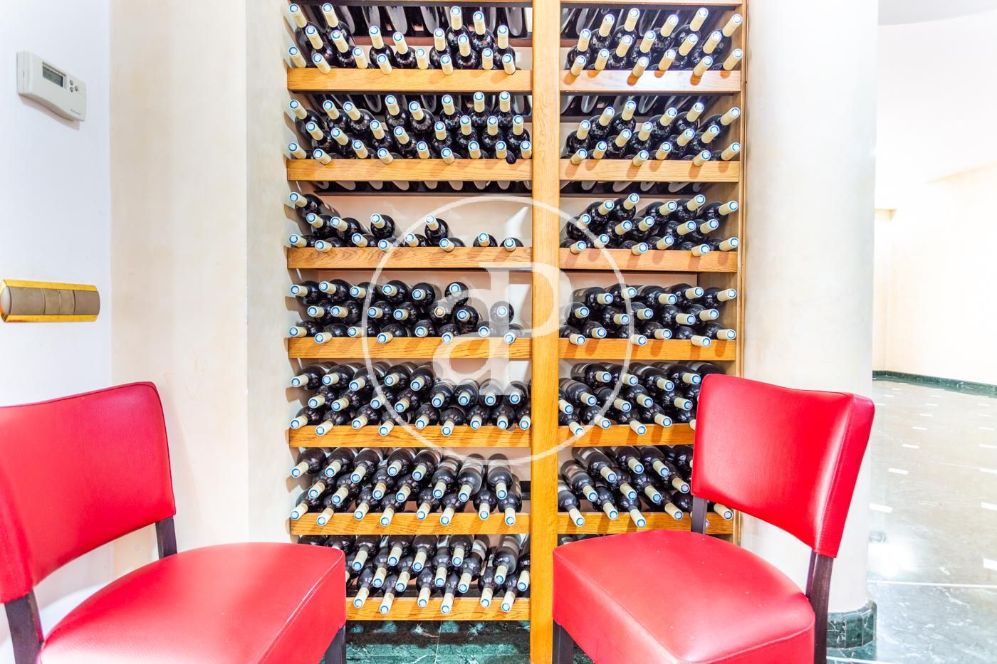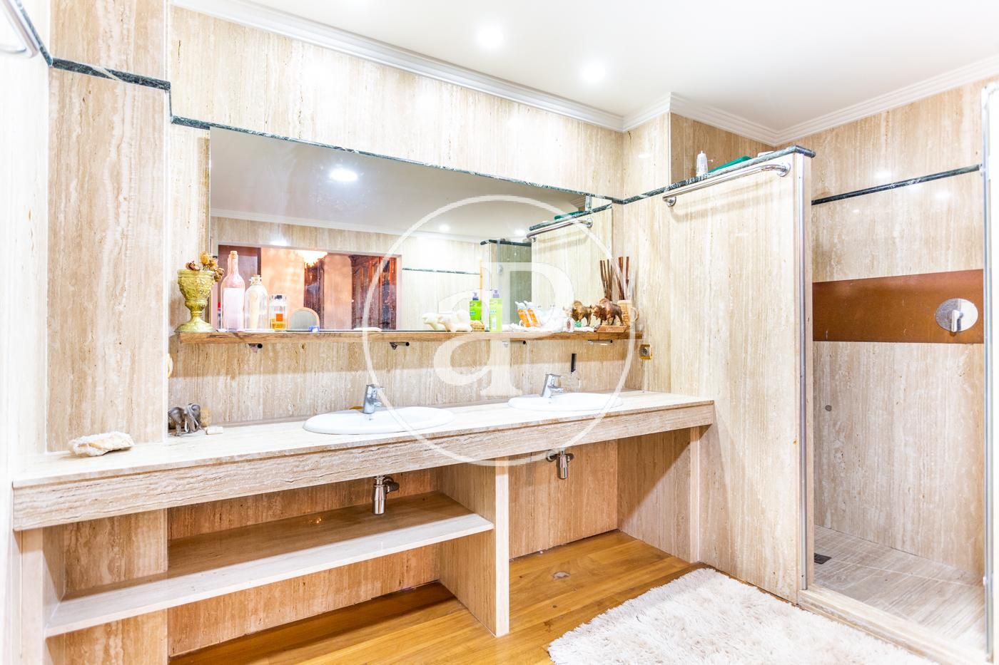 Te reciben puertas altas y anchas dignas de esta casa. Al ingresar a la vivienda, te encuentras en un espacio con materiales de acabado de la más alta calidad. Las grandes ventanas hacen, que la casa sea accesible a mucha luz natural. La planta inferior está diseñada para la vida cotidiana: una cocina espaciosa y una sala de estar grande tienen sus propias salidas a la terraza y la piscina. Será agradable reunirse aquí con toda la familia o con amigos tanto en verano como en invierno. El salón tiene una gran chimenea. También en esta misma planta hay una pequeña área de descanso con baño privado, lo cual es muy conveniente si hay personas mayores en la familia.
