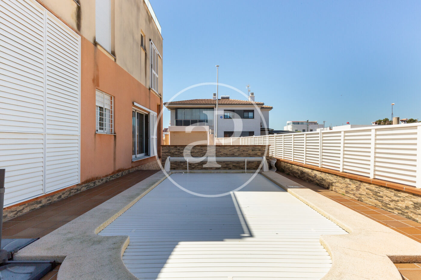 El exterior ha sido diseñado para disfrutar al máximo del clima mediterráneo y la vida al aire libre. Dispone de una amplia zona con capacidad para dos vehículos, así como una fantástica piscina privada con sistema de depuración por cloración salina. La piscina cuenta con una cubierta tipo persiana, que ayuda a conservar la temperatura del agua y mantenerla limpia durante todo el año. También dispone de una ducha exterior.