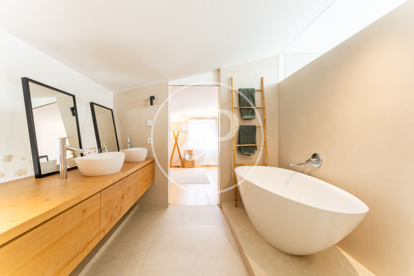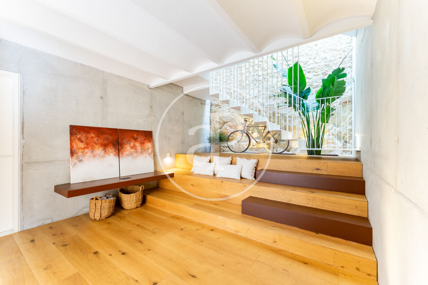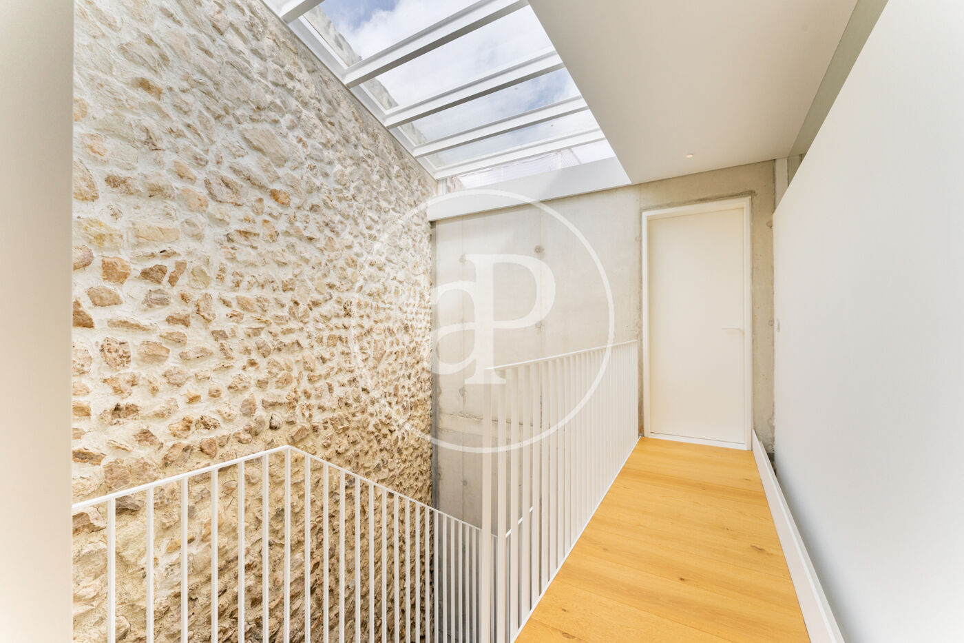 En la última planta, dos habitaciones dobles conectadas por un baño completo ofrecen un espacio íntimo y acogedor. La zona de las escaleras, con su techo de cristal y las paredes de piedra vistas, aporta una luz natural increíble que realza cada detalle arquitectónico.
