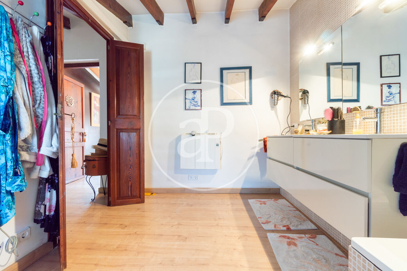 En la primera planta, encontrarás dos amplias habitaciones dobles. La primera cuenta con un baño en suite y un salón privado, ideal para disfrutar de momentos de tranquilidad o tener un espacio ideal para tus invitados. La segunda habitación incluye un vestidor y un baño independiente de gran tamaño, perfecto para mayor comodidad.