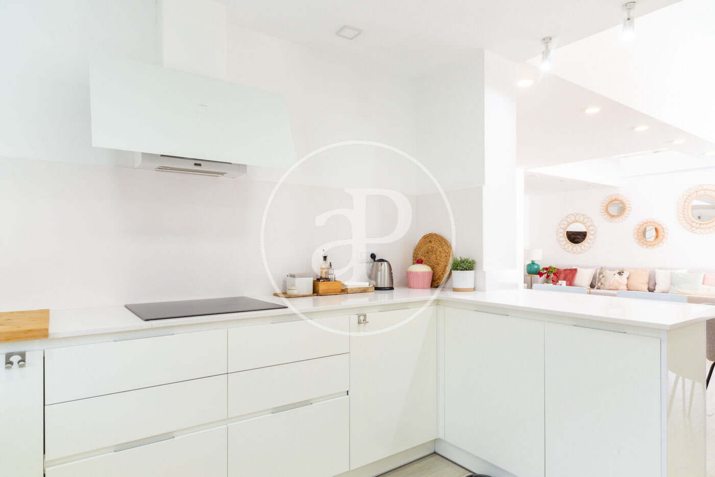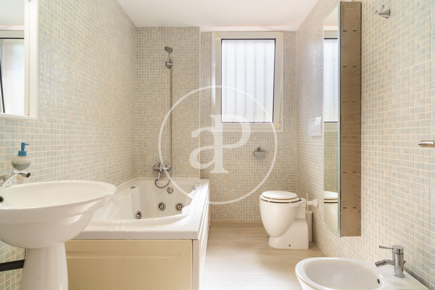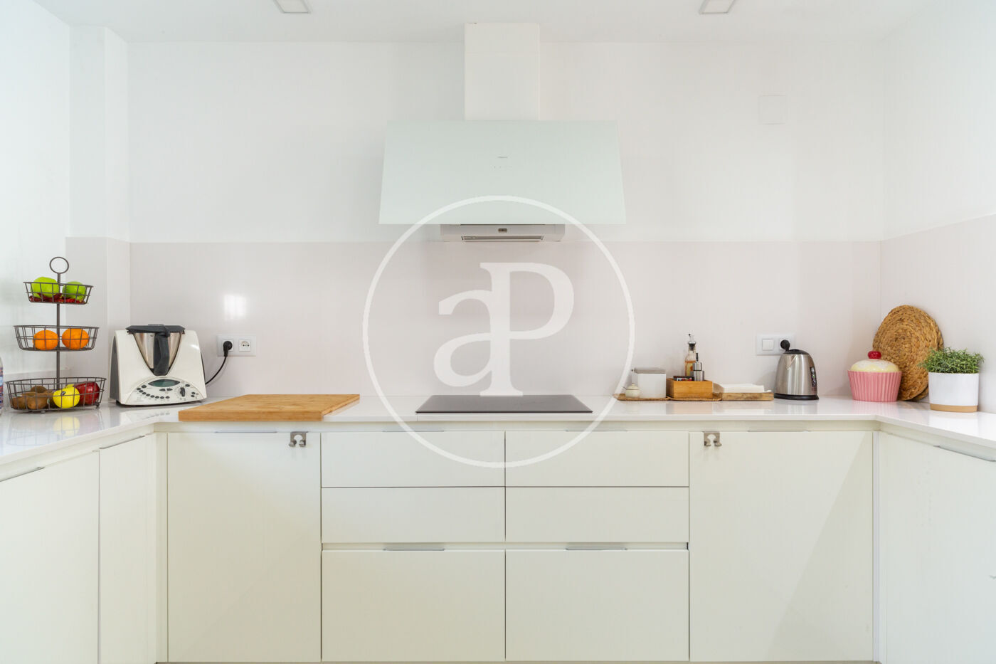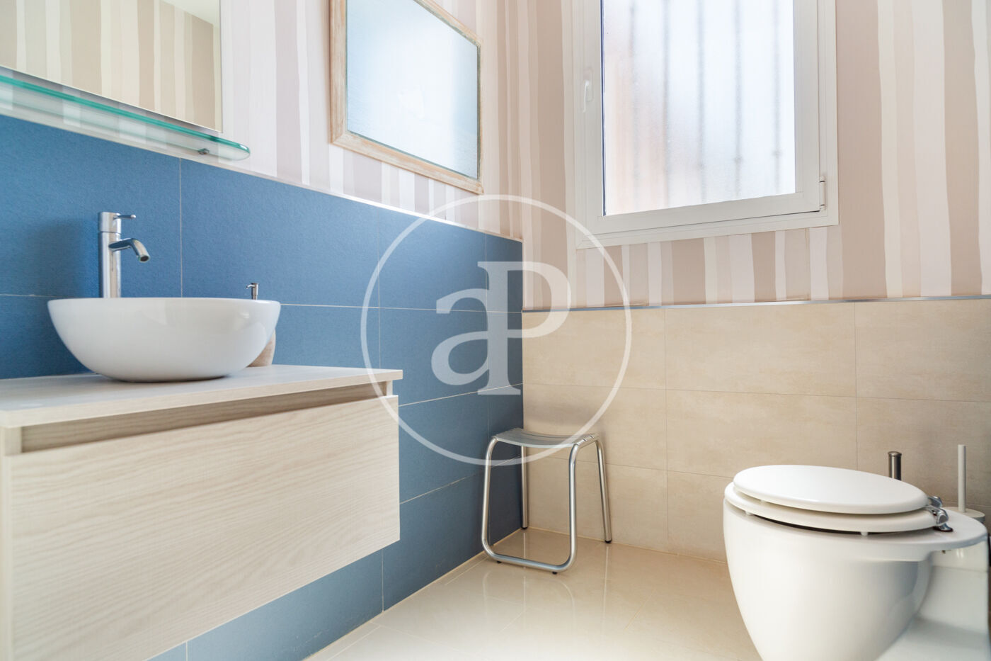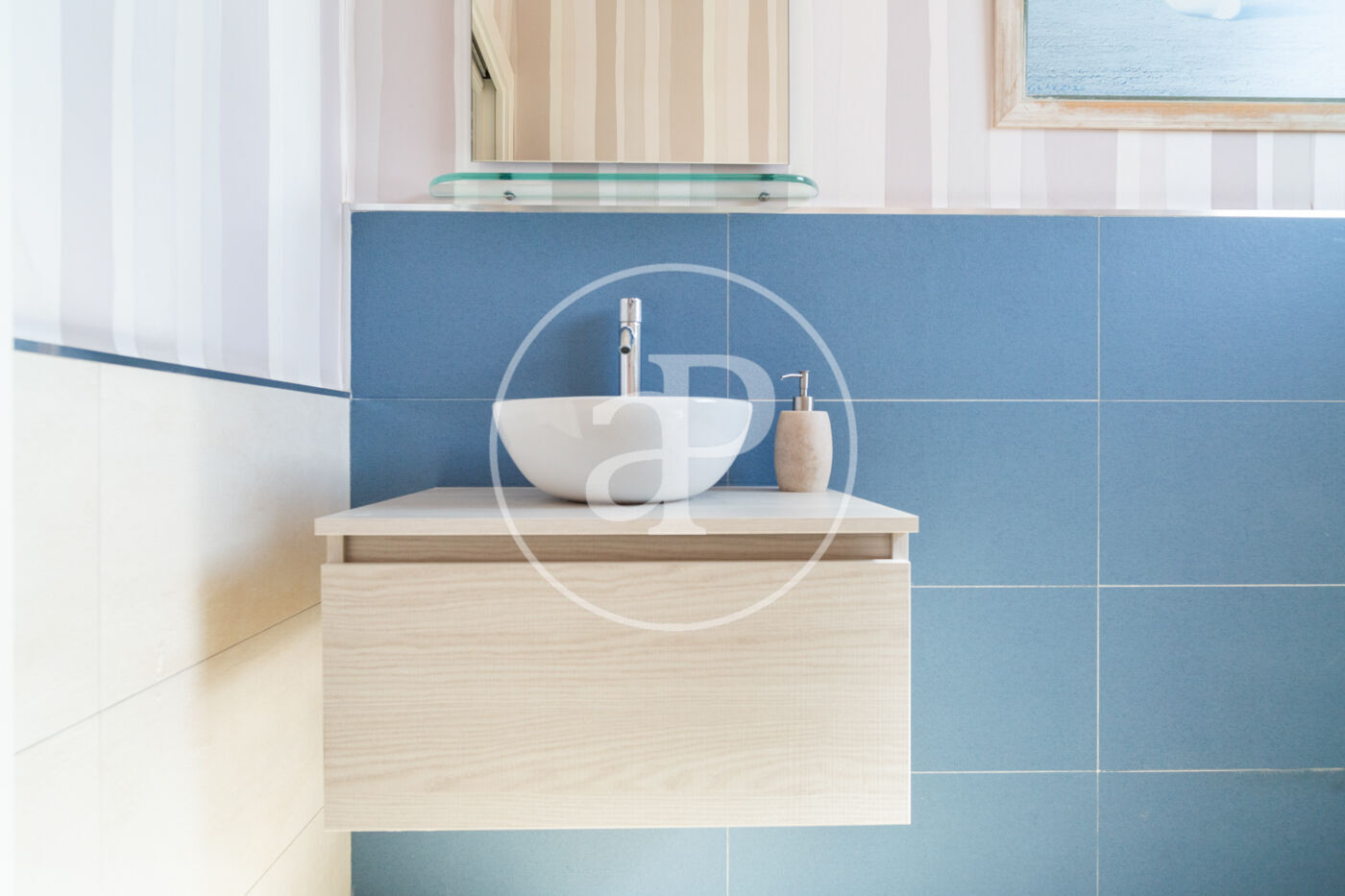 Accedemos a planta principal con un espacioso salón-comedor con acceso a la terraza y jardín, con una amplia cocina abierta perfectamente equipada, tres dormitorios dobles con armariada, un cuarto de baño completo y el dormitorio principal con cuarto de baño en suite con bañera de hidromasaje y vestidor.