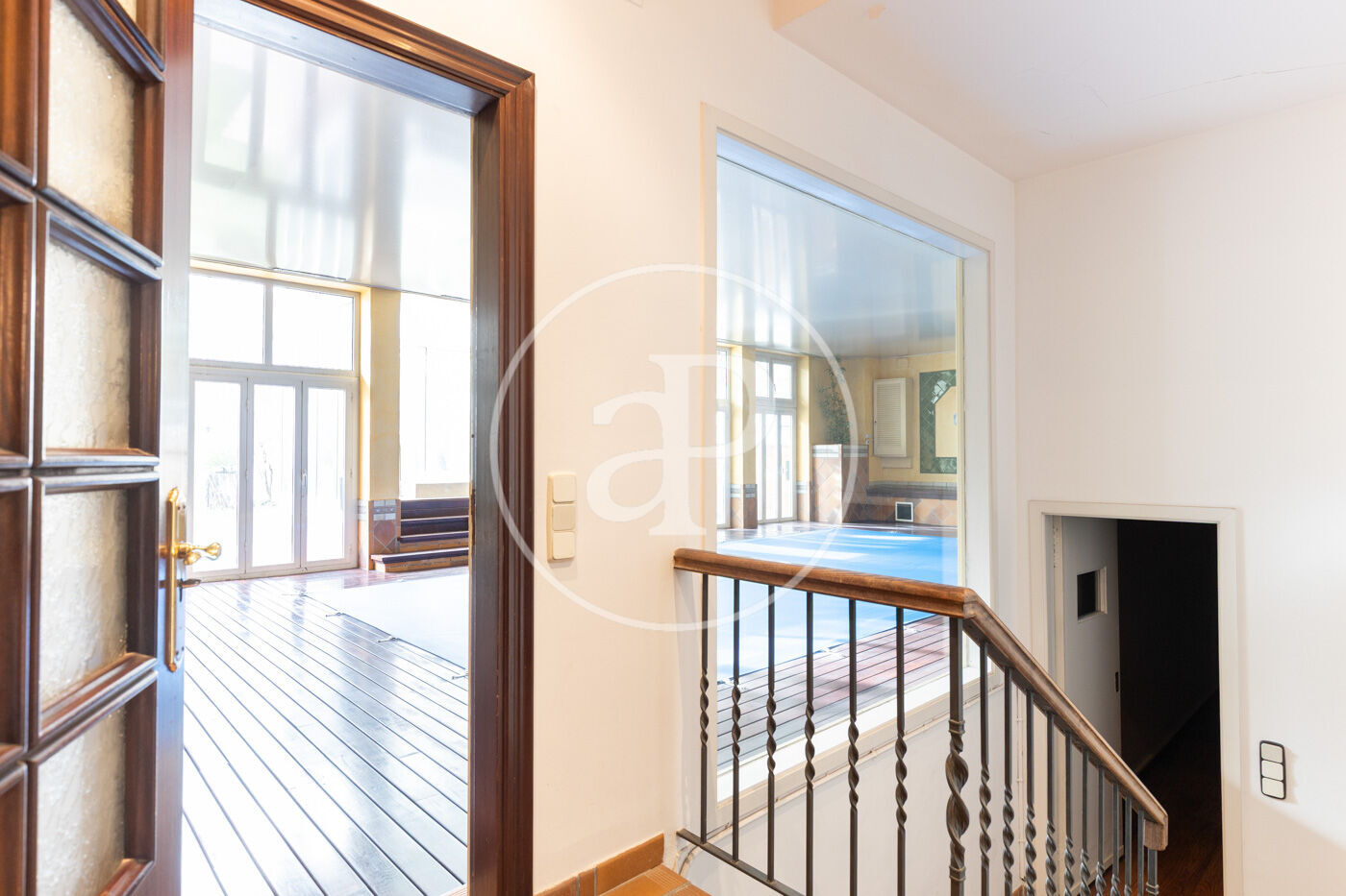 En la planta baja encontramos la entrada principal junto con la entrada del parking, parking con capacidad para tres coches grandes. Entrando a la casa un recibidor muy amplio nos da la bienvenida, que podemos acceder a una sala polivalente muy grande de 27m2 para poder darle diferentes usos (despacho, sala de juegos) desde el recibidor podemos acceder al parking. Nos encontramos las escaleras para subir a la primera planta junto con el ascensor, un comedor de verano que comunica con el jardín, el cual está equipado con una barbacoa de obra. Desde el jardín podemos acceder a la primera planta. Llegamos a una de las joyas de la casa, la zona deportiva, con una piscina cubierta climatizada de 9m x 4m, un jacuzzi y una pista de básquet con un vestuario con varias duchas y un aseo. Desde la piscina podemos acceder al jardín. Desde la planta baja podemos acceder a la bodega, bodega de 13m2 muy bien conservada.