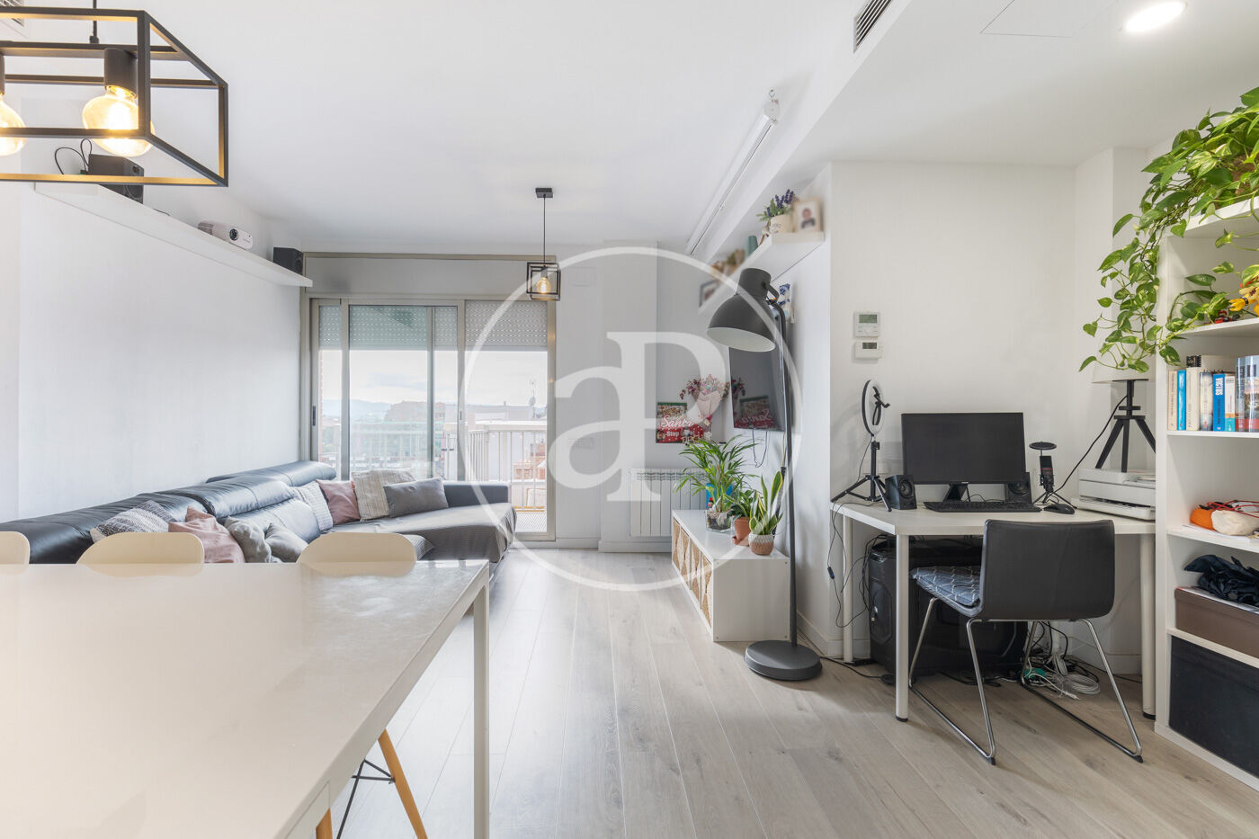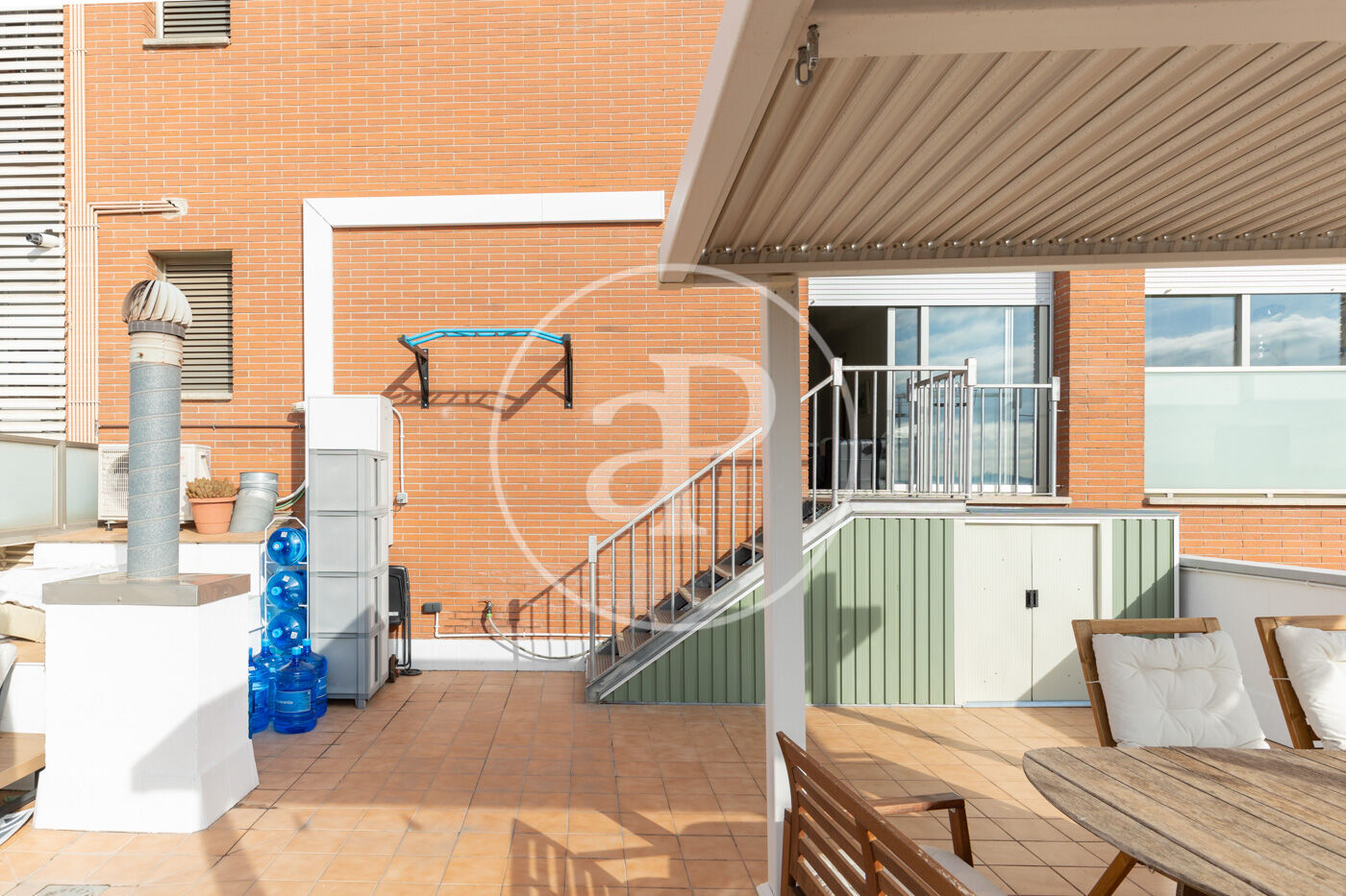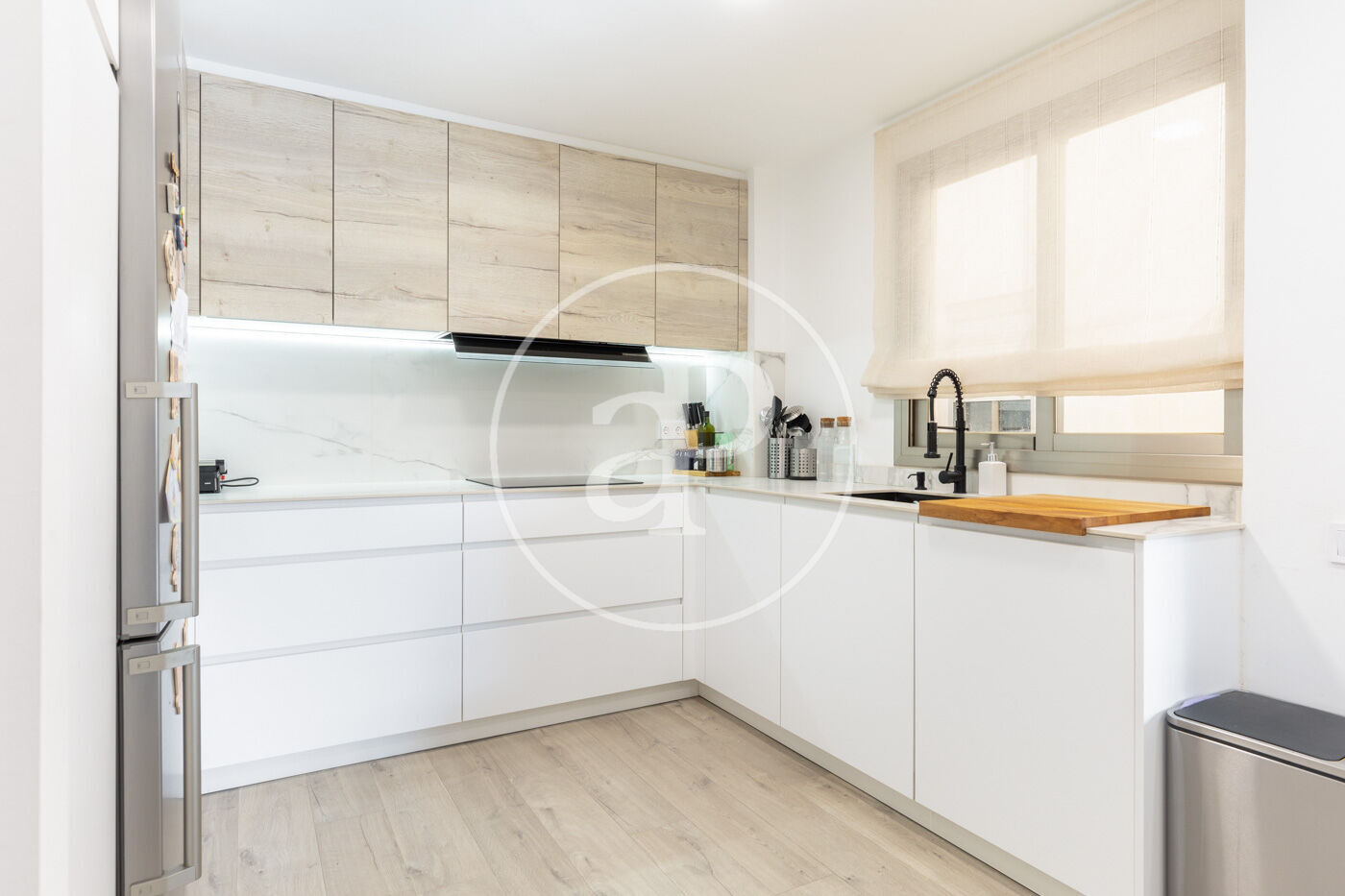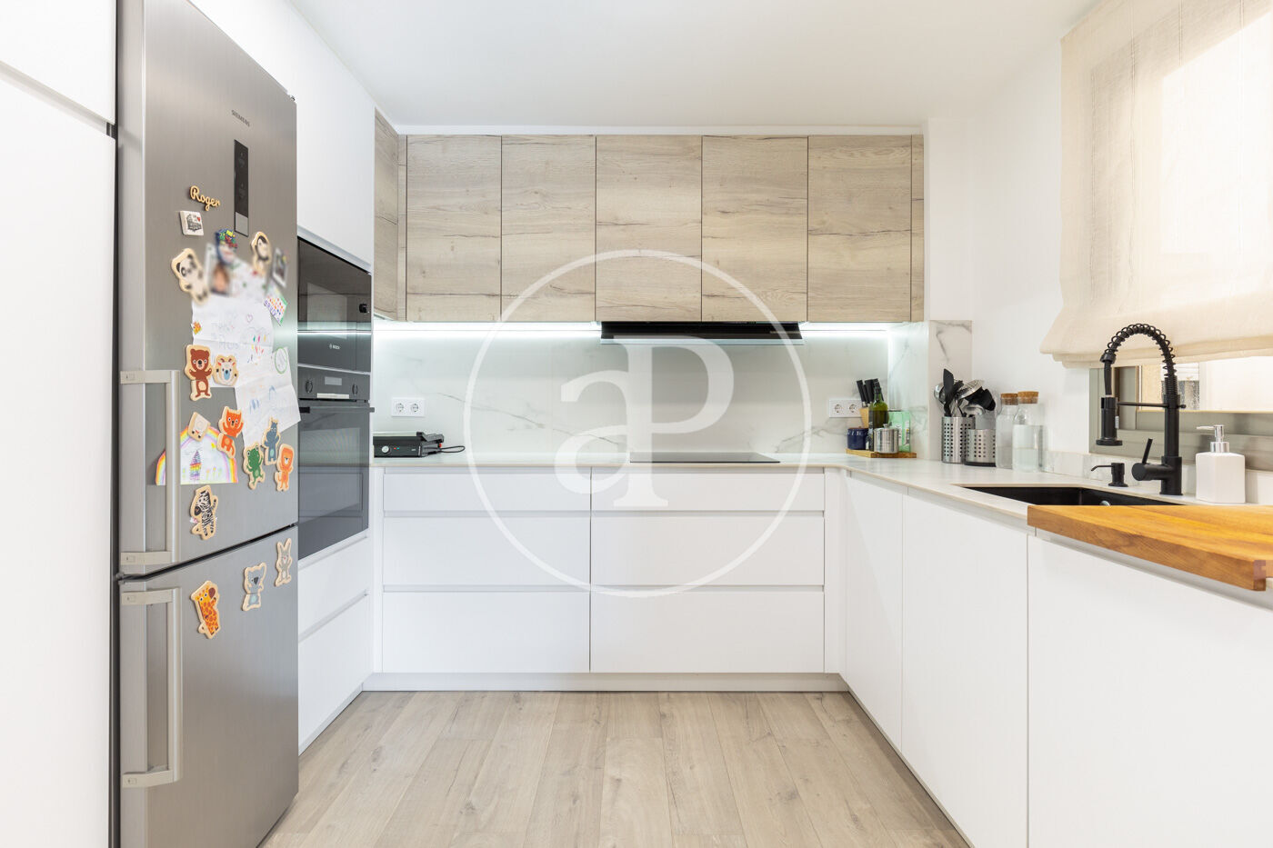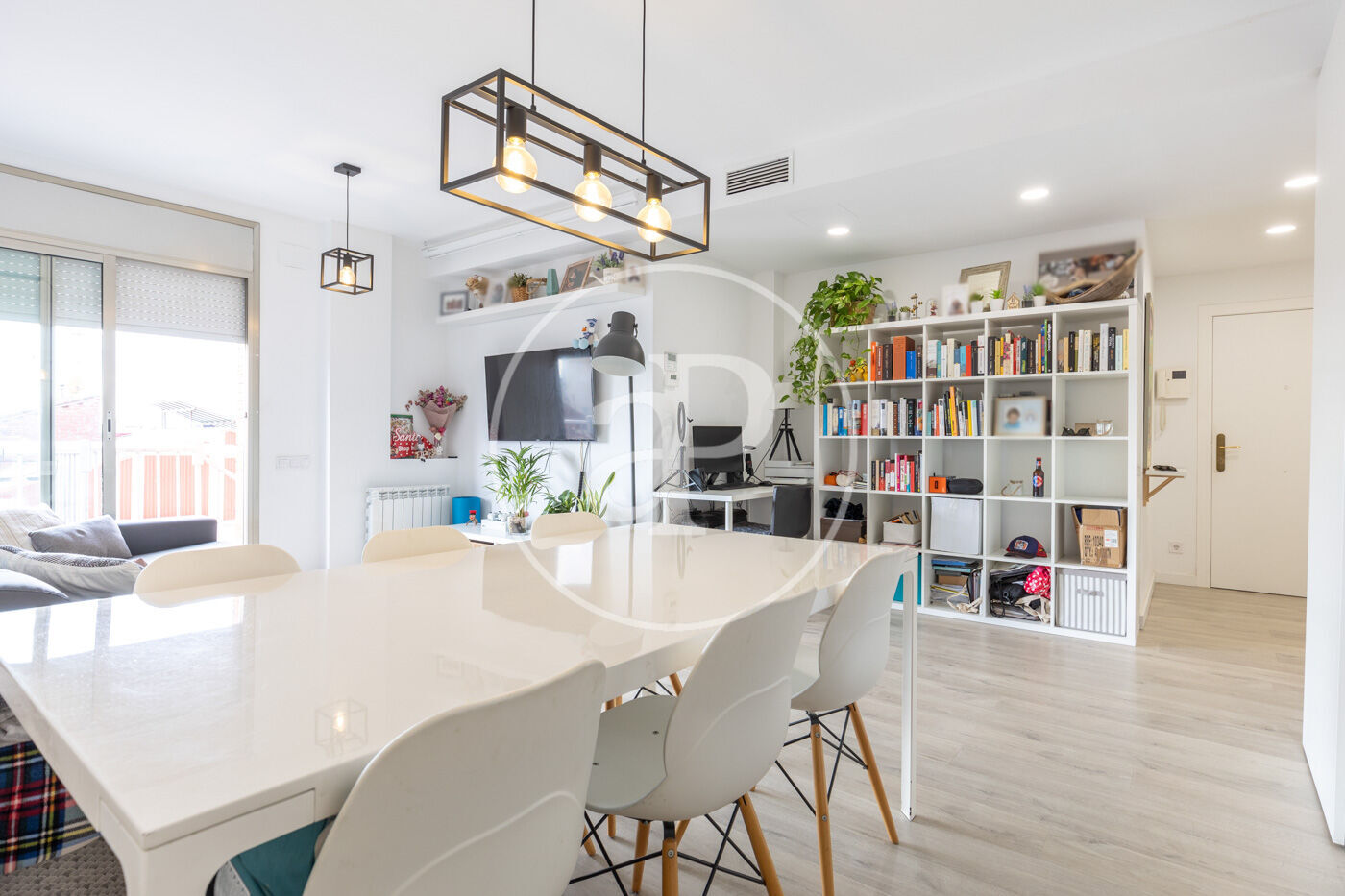 Se trata de una vivienda dividida en dos ambientes, en un lado tendríamos la zona de día que se compone de una cocina abierta con electrodomésticos Bosch y lavavajillas paneleado, dispone de un comedor muy acogedor. Desde el comedor podemos acceder a la joya de la vivienda, una terraza de 65m2 con orientación sur con vistas increíbles a Montserrat y al Tibidabo. Aprovechando el espacio de las escaleras de la terraza se ha puesto la zona de aguas (lavadero)