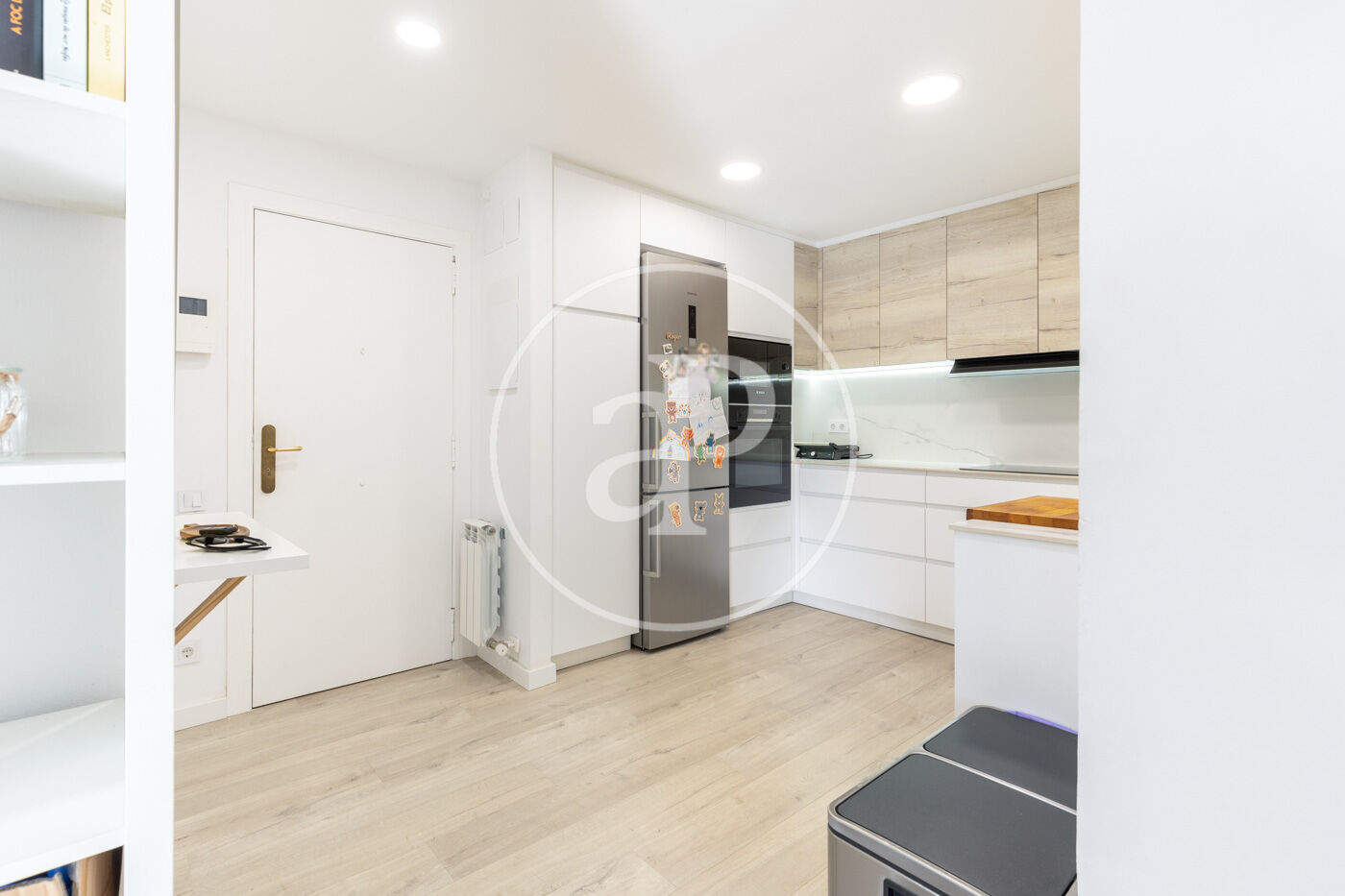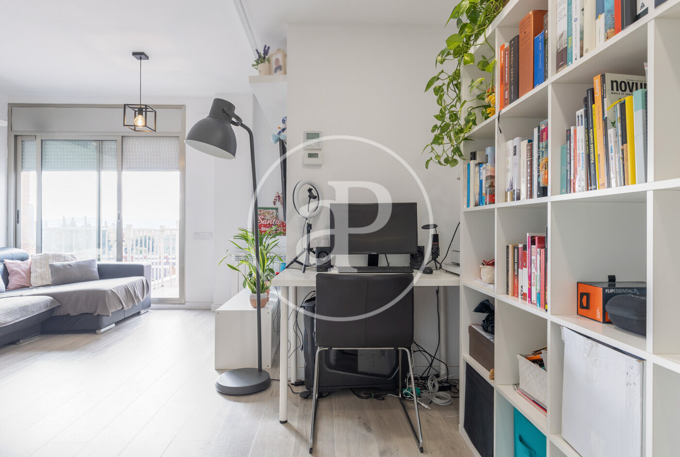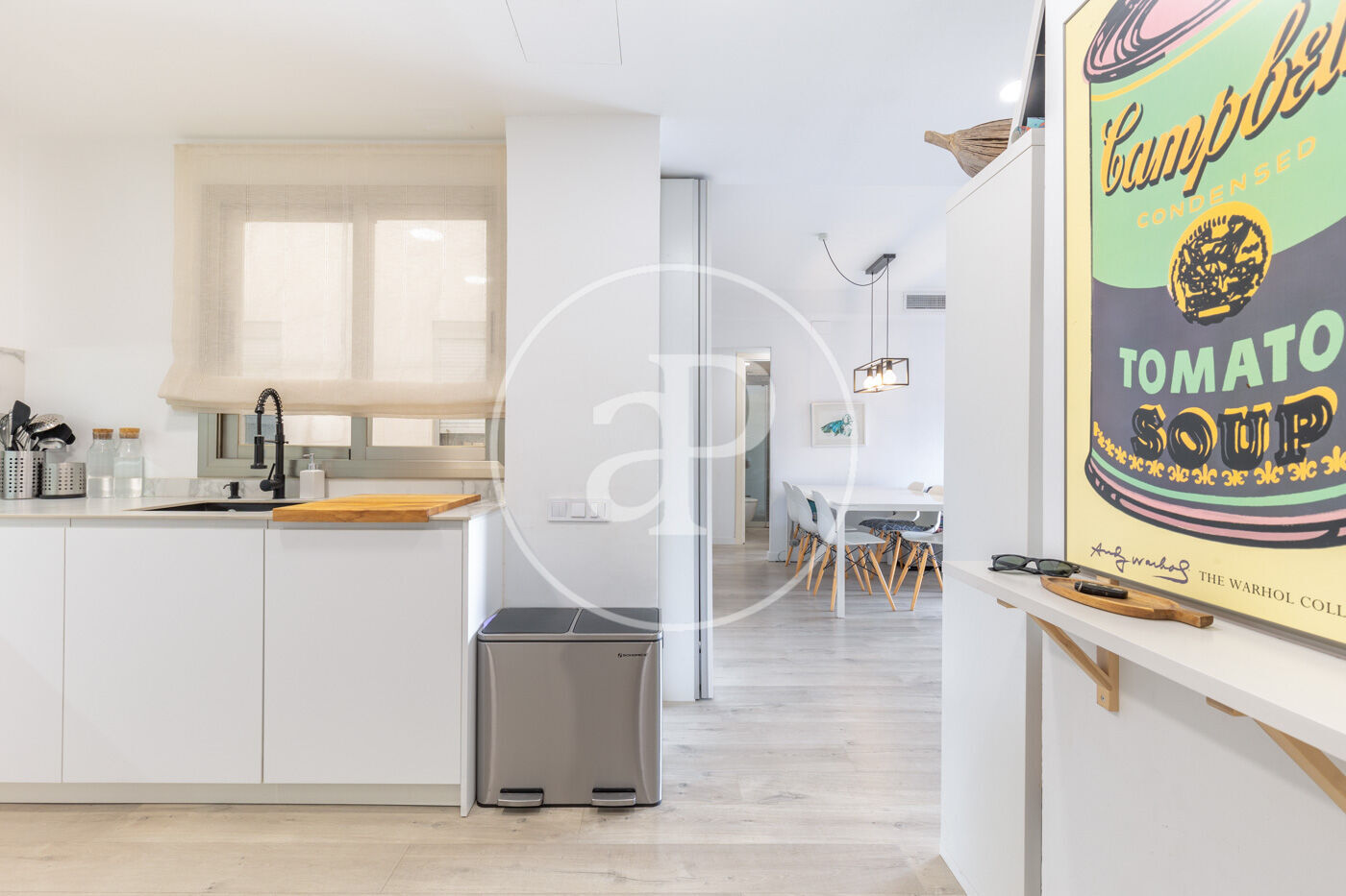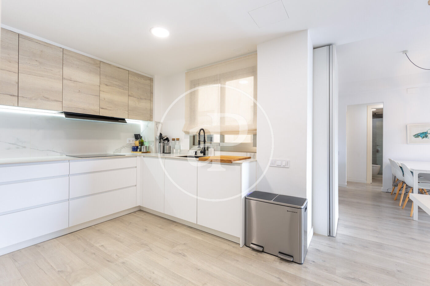 Se trata de una vivienda dividida en dos ambientes, en un lado tendríamos la zona de día que se compone de una cocina abierta con electrodomésticos Bosch y lavavajillas paneleado, dispone de un comedor muy acogedor. Desde el comedor podemos acceder a la joya de la vivienda, una terraza de 65m2 con orientación sur con vistas increíbles a Montserrat y al Tibidabo. Aprovechando el espacio de las escaleras de la terraza se ha puesto la zona de aguas (lavadero)