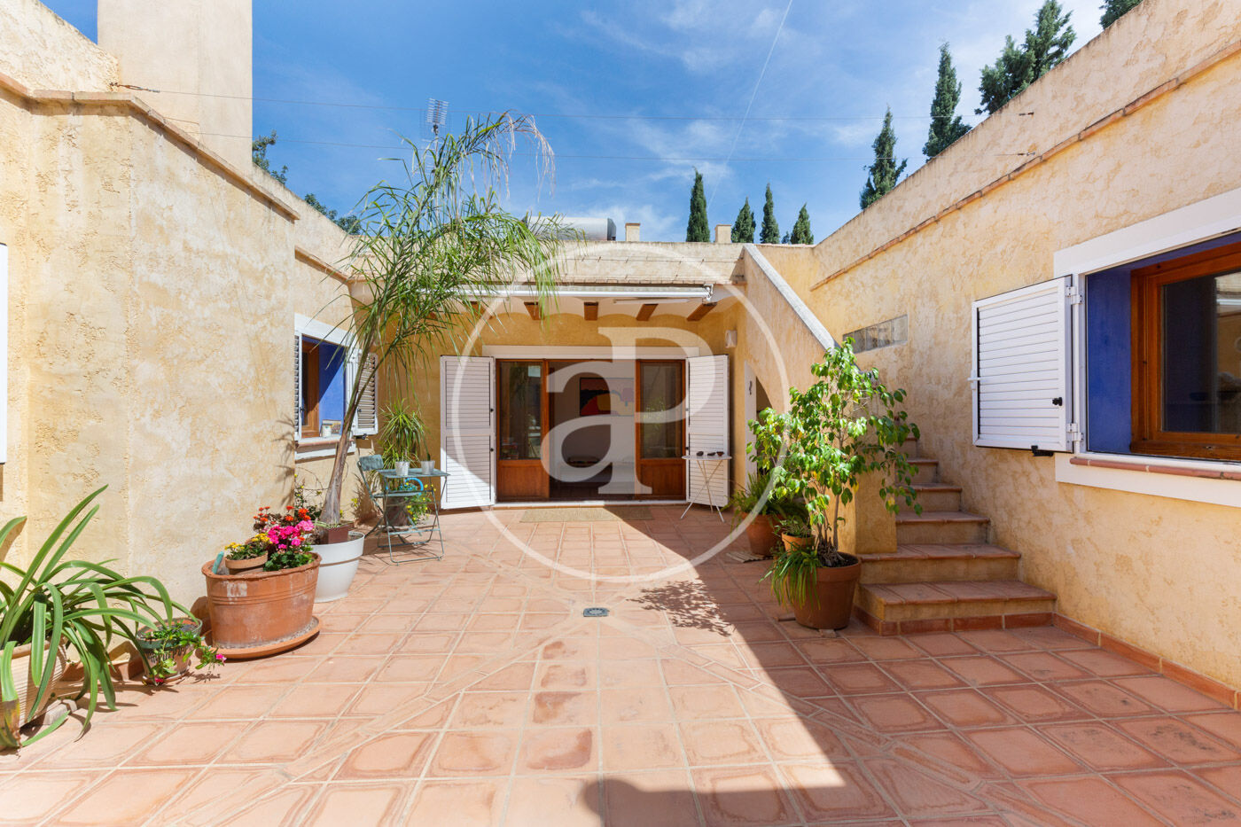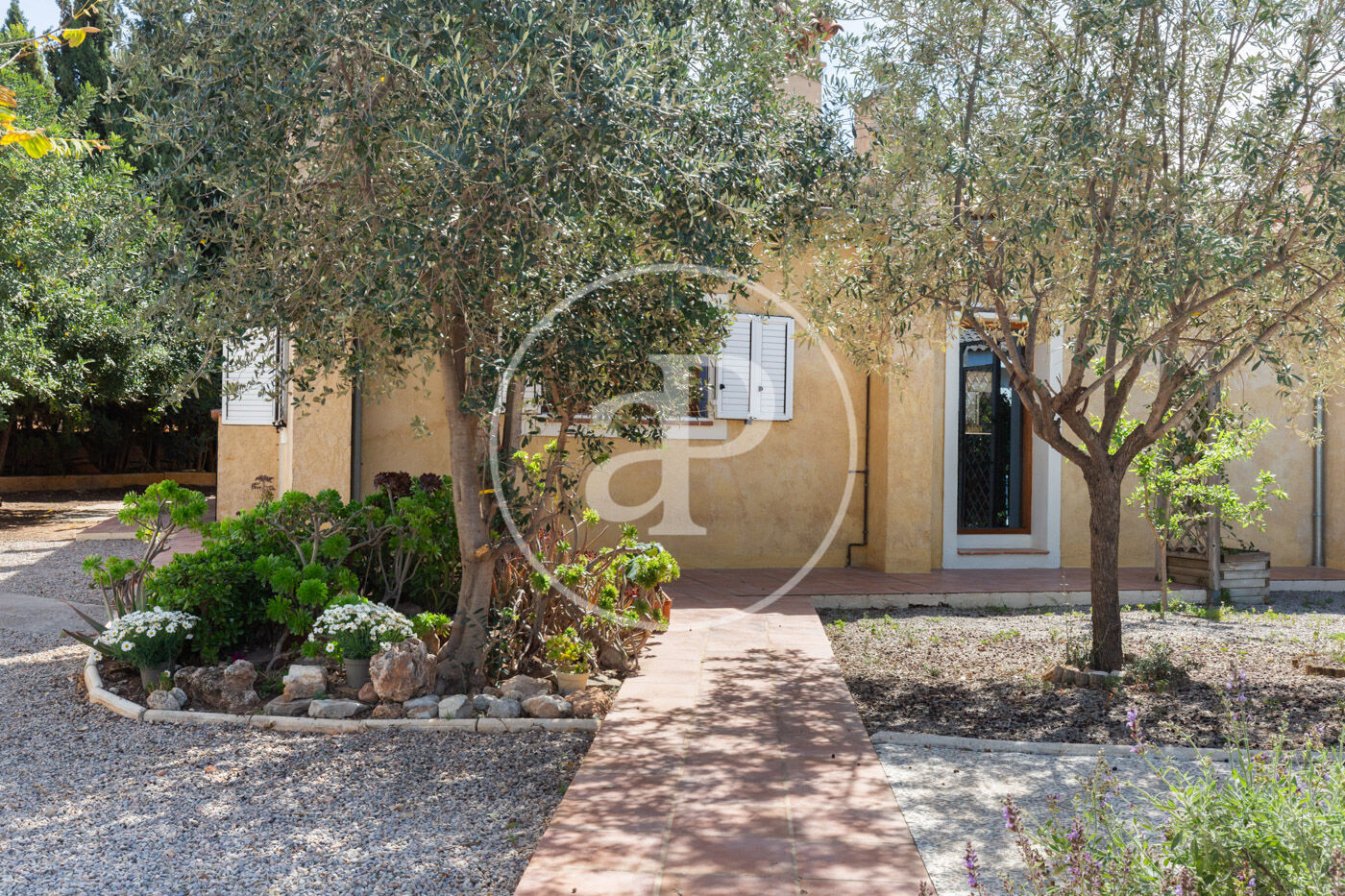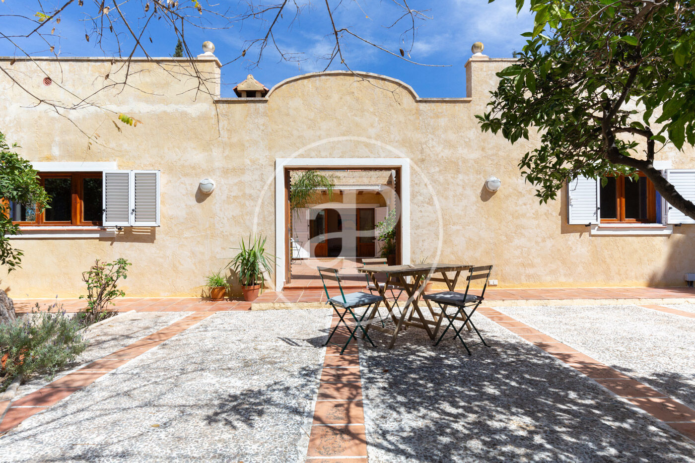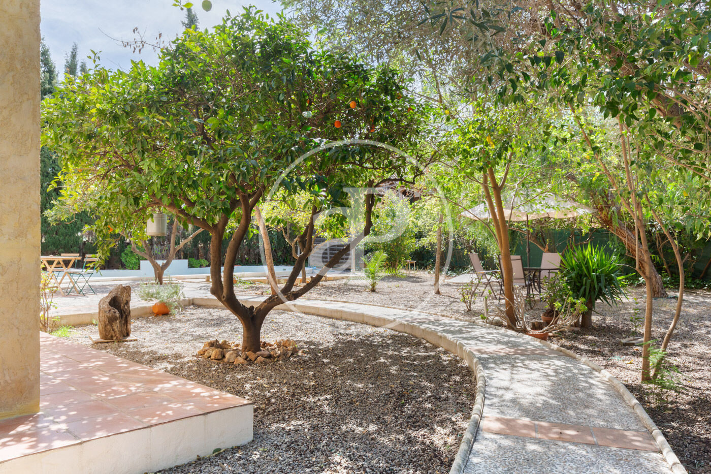 Una vez entramos a la propiedad, nos recibe su hermoso jardín estilo mediterráneo, con variedad de arbustos aromáticos y árboles frutales como naranjos, limoneros, higos y mangrano. Nos lleva el camino hacia la magnífica vivienda de una sola planta, diseñada con exquisito estilo y diseño único por su maravilloso patio central que permite a las estancias tener luz natural y una excelente ventilación, ayudando que la temperatura de la casa sea más estable todo el año.