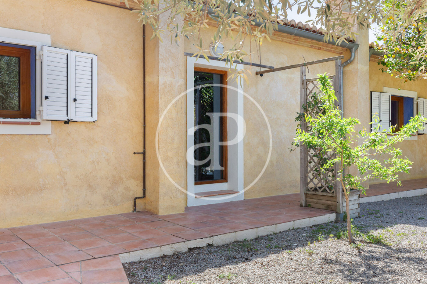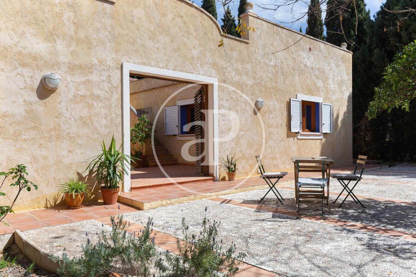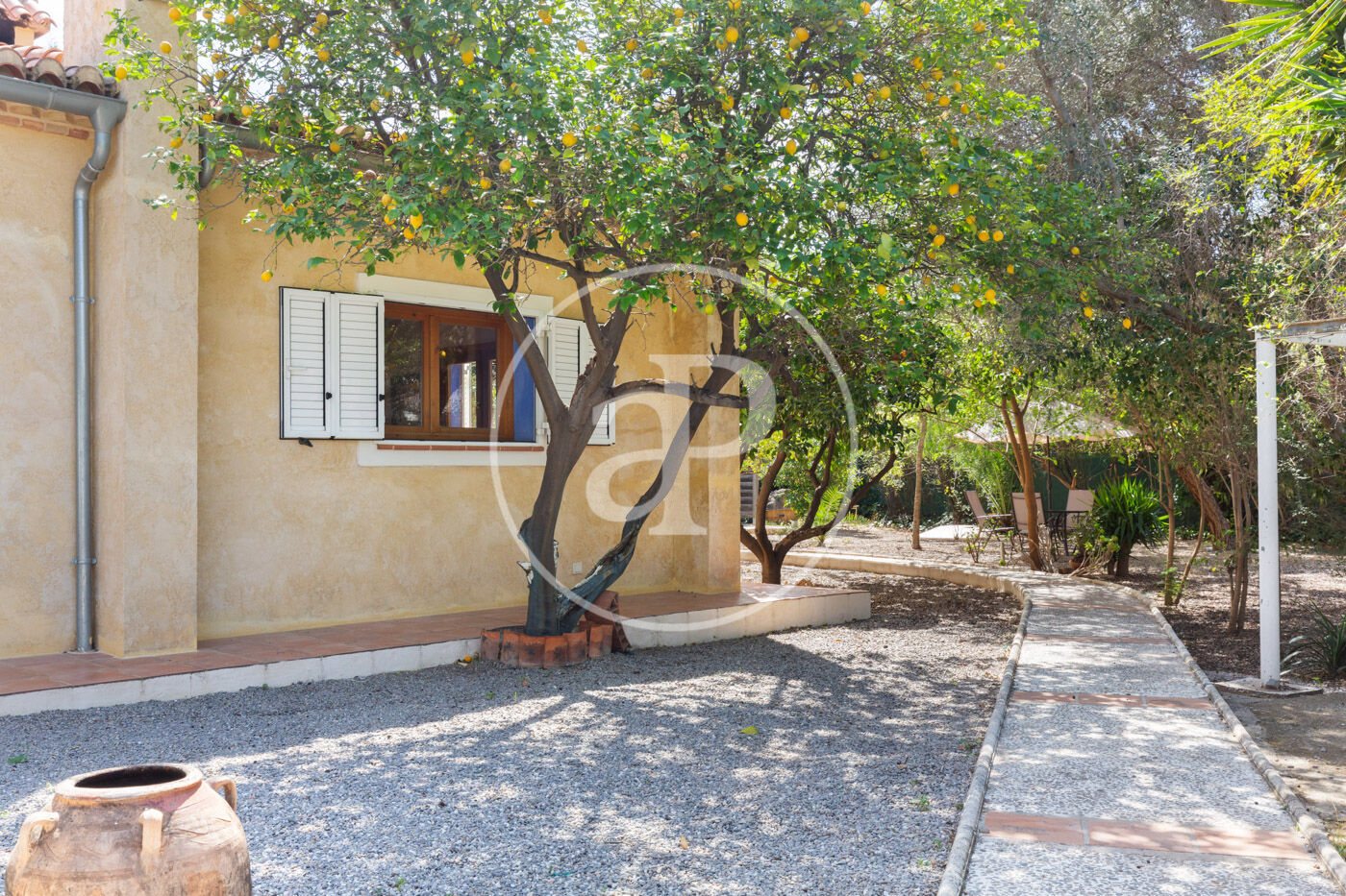 Una vez entramos a la propiedad, nos recibe su hermoso jardín estilo mediterráneo, con variedad de arbustos aromáticos y árboles frutales como naranjos, limoneros, higos y mangrano. Nos lleva el camino hacia la magnífica vivienda de una sola planta, diseñada con exquisito estilo y diseño único por su maravilloso patio central que permite a las estancias tener luz natural y una excelente ventilación, ayudando que la temperatura de la casa sea más estable todo el año.