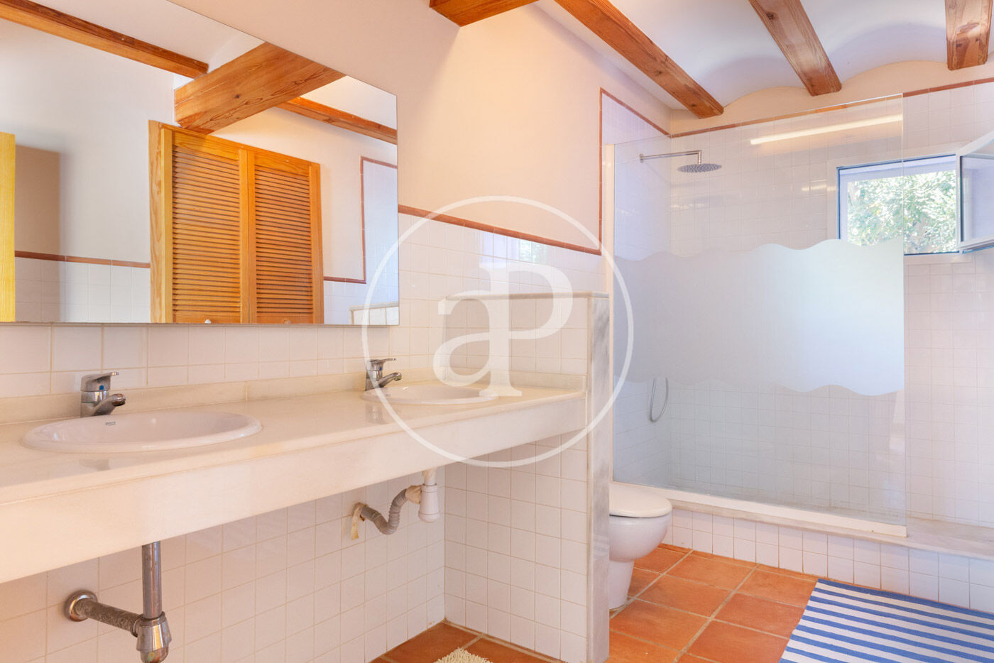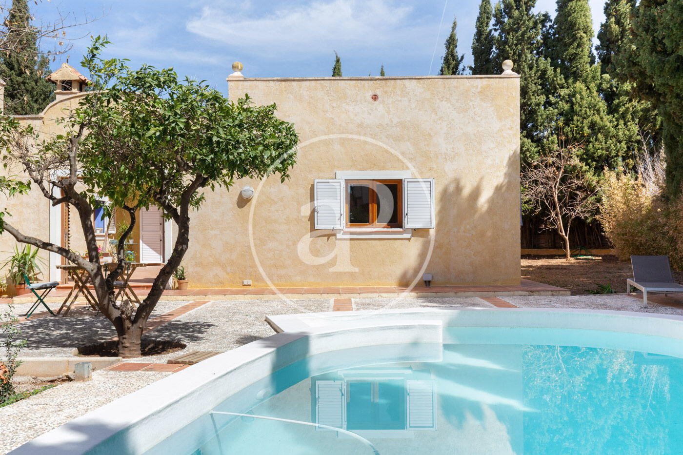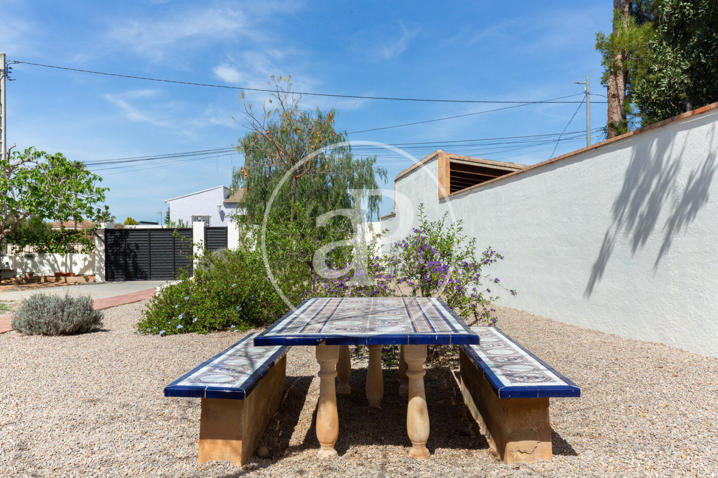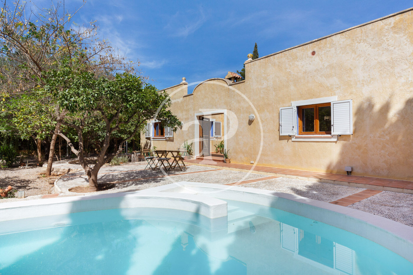 Una vez entramos a la propiedad, nos recibe su hermoso jardín estilo mediterráneo, con variedad de arbustos aromáticos y árboles frutales como naranjos, limoneros, higos y mangrano. Nos lleva el camino hacia la magnífica vivienda de una sola planta, diseñada con exquisito estilo y diseño único por su maravilloso patio central que permite a las estancias tener luz natural y una excelente ventilación, ayudando que la temperatura de la casa sea más estable todo el año.