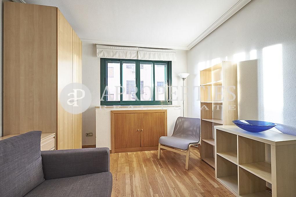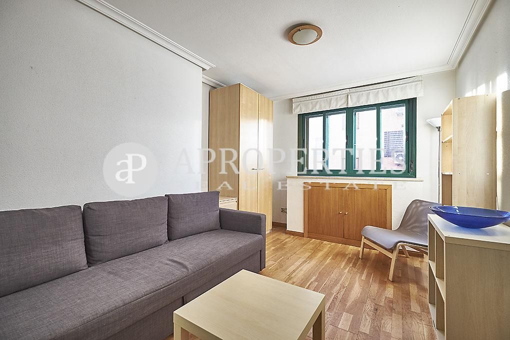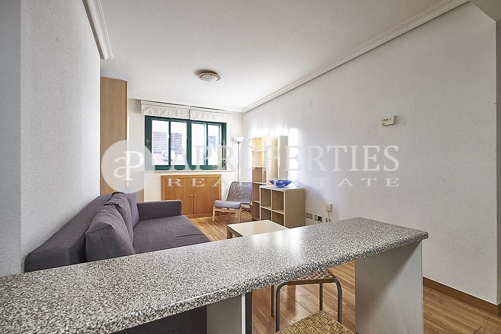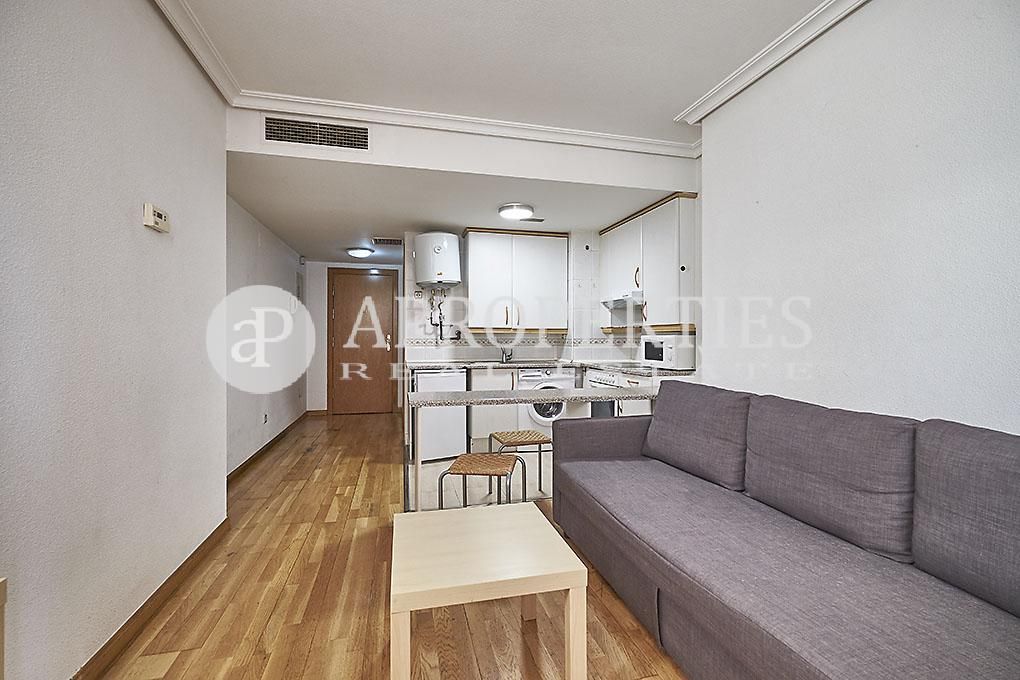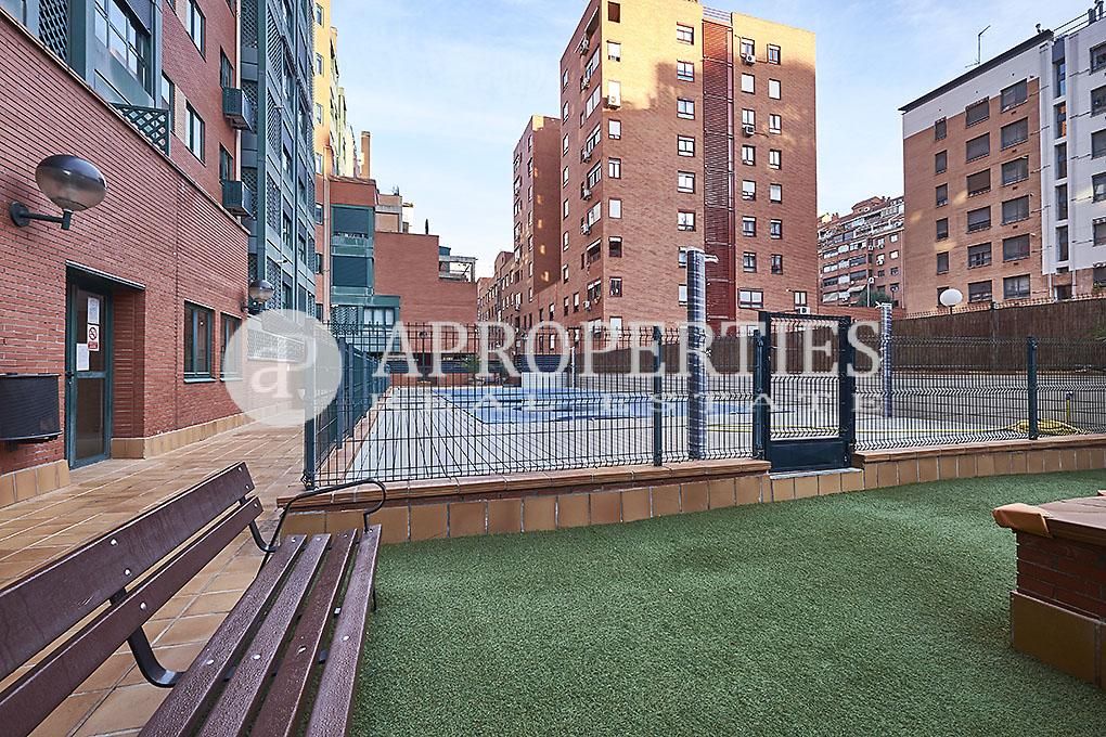 Bonito estudio con excelente ubicación, rodeado de los mejores servicios, hospitales, embajadas, colegios y perteneciente a una moderna urbanización privada. La vivienda se encuentra en una quinta planta con 41m² de superficie construida, distribuidos en una amplia estancia con mirador, una cocina americana equipada y un cuarto de baño completo con bañera hidromasaje. Dispone de aire acondicionado frio-calor. Incluye además un trastero muy amplio. La urbanización dispone de piscina, zonas ajardinadas, portero físico, video-portero y vigilancia 24h. Muy bien comunicado, próximo al metro de Avenida de la Paz y con fácil acceso a la M-30. Los gastos de comunidad son de 47 €/mes y el IBI es de 235 € aproximadamente. Posibilidad de alquilar o adquirir plaza de garaje en la misma finca.