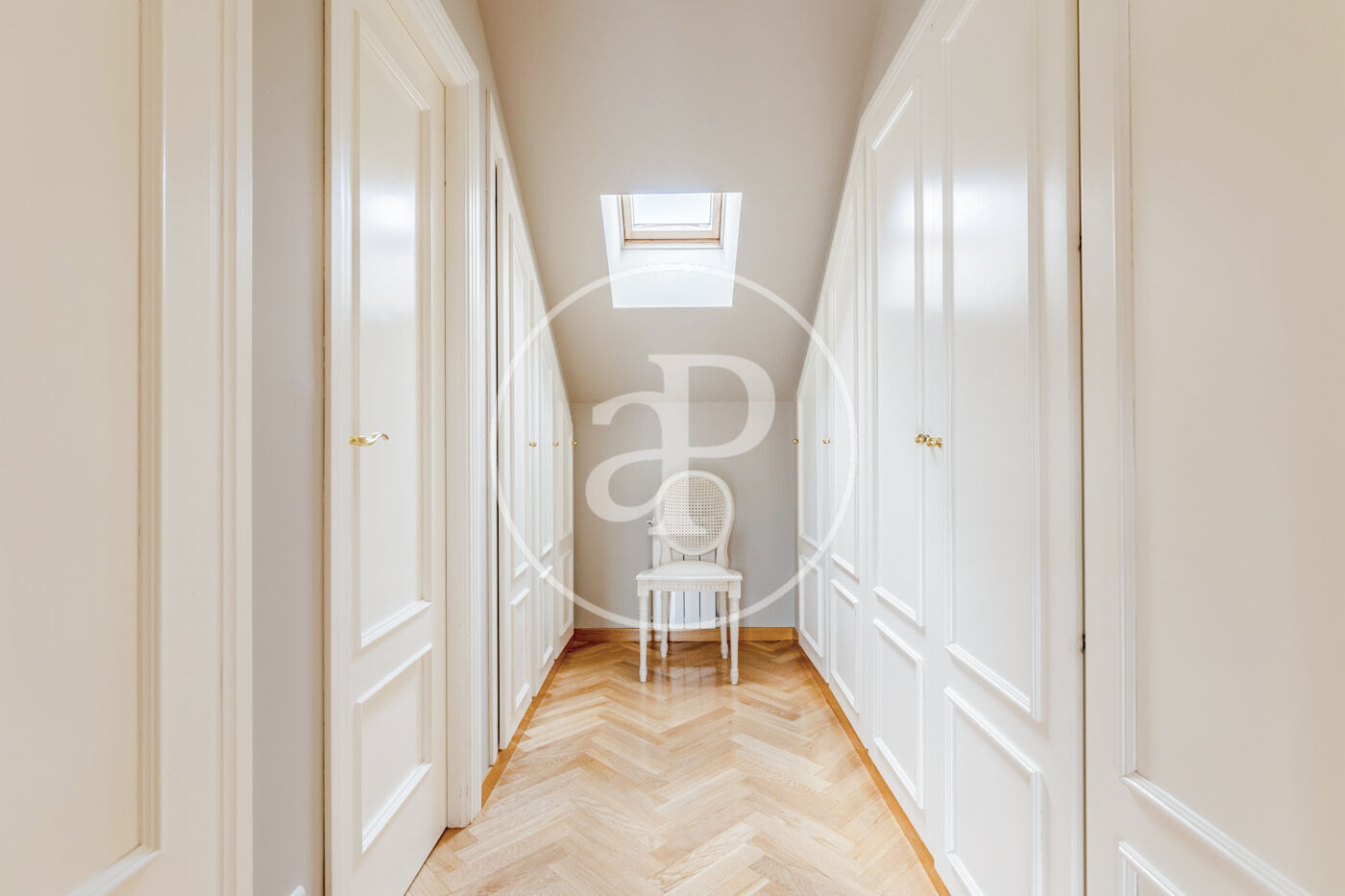 La escalera principal de acceso a la vivienda es elevable automáticamente, una característica inspirada en las antiguas fortalezas que el arquitecto ha integrado con maestría en el diseño de la misma. La vivienda presenta una distribución en espejo, con una entrada central que da acceso a dos alas prácticamente simétricas. La casa se desarrolla en tres plantas más un sótano. En la planta principal, a través de un amplio recibidor, el ala derecha alberga un espacioso salón-estudio, un aseo de cortesía y cuatro dormitorios con dos baños compartidos. En el ala izquierda se encuentran la cocina, un cuarto de servicio con área de lavandería y un segundo salón con chimenea. En la primera planta, se encuentra el dormitorio principal, que ocupa gran parte de la superficie, equipado con un impresionante vestidor y un baño con tocador, todo ello de estilo setentero. La planta baja está estructurada en pilares, emulando la forma de un hórreo. En el primer pilar se dispone de una gran zona de gimnasio con sauna y baños, mientras que el segundo pilar incluye un garaje para dos vehículos, un cuarto de herramientas y una despensa. Desde aquí se accede al sótano, que cuenta con una bodega equipada con cocina, una acogedora zona de estar con chimenea, un aseo y una amplia cava para almacenamiento de vinos.