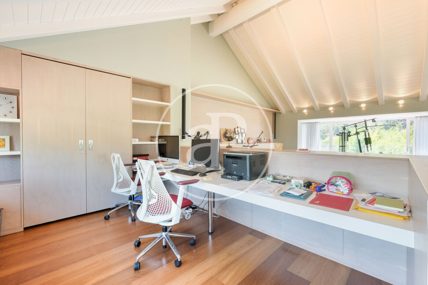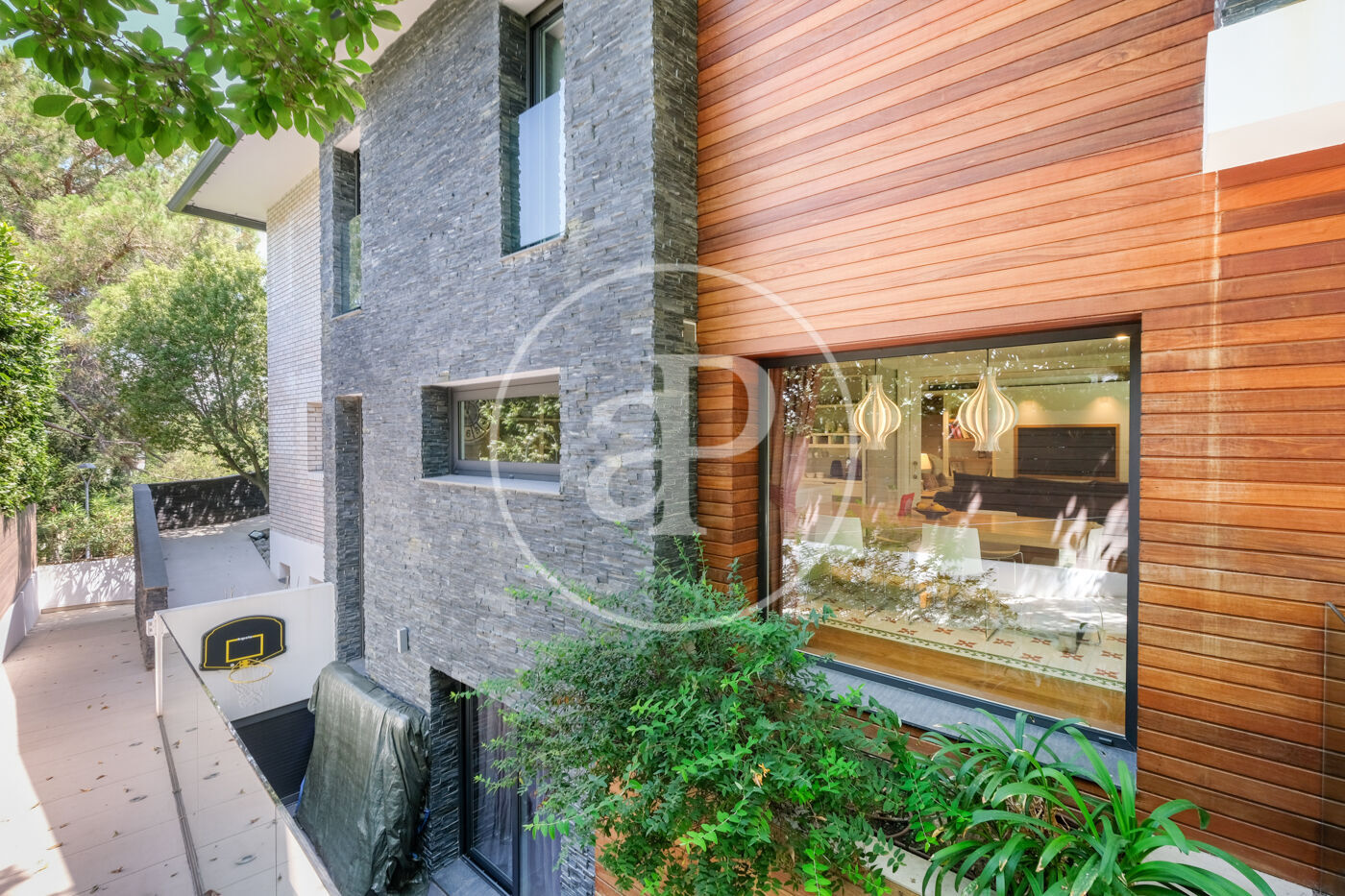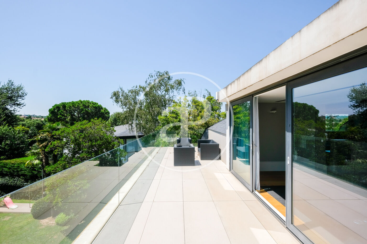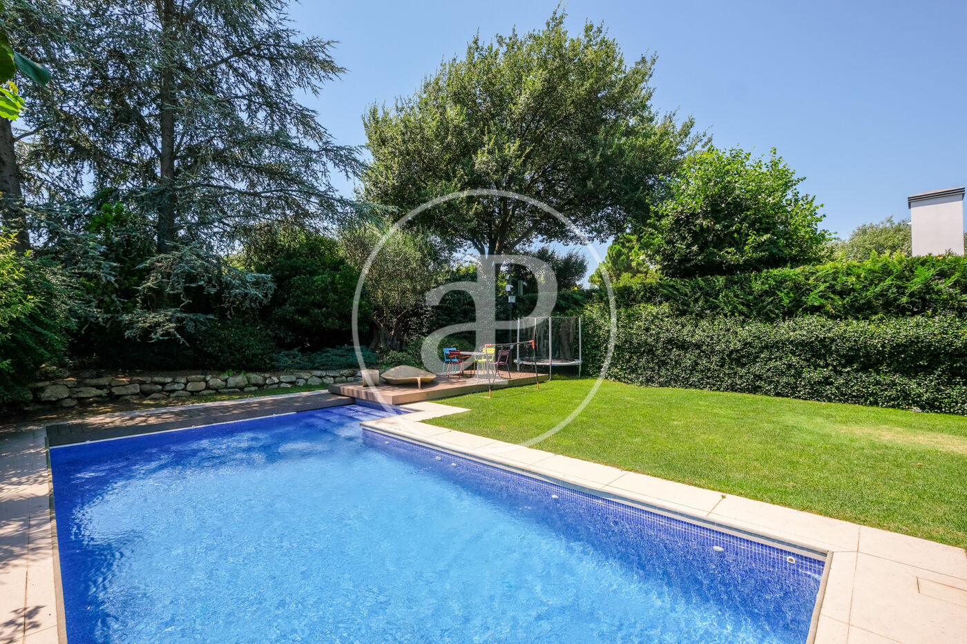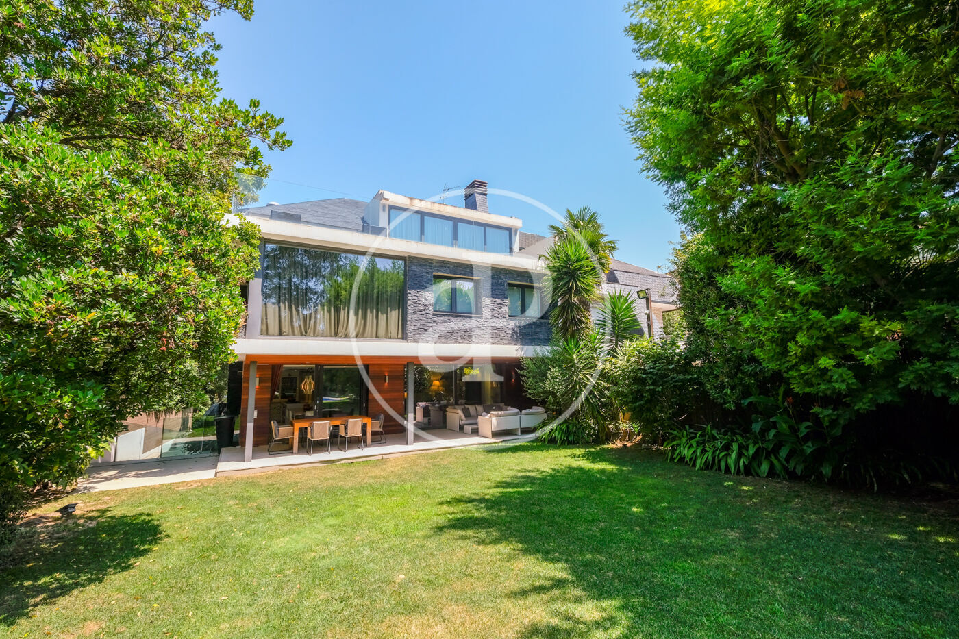 Diseño, lujo y exclusividad, son los mejores adjetivos que describen a esta espectacular villa de 590 m2 construidos, reformada íntegramente por un prestigioso arquitecto, cuidando el más mínimo detalle en toda la vivienda. Cuenta con una parcela amplia y ajardinada de 845 m2, frente al Golf de Sant Cugat, con inmejorable ubicación en la zona residencial más exclusiva y tranquila de Sant Cugat, L’Eixample, al lado de paradas de autobús, a menos de 10 minutos andando de la estación de tren "FGC Sant Cugat Centre" y del centro de la ciudad y todo tipo de servicios y a tan sólo 15 minutos en coche de la zona alta de Barcelona.