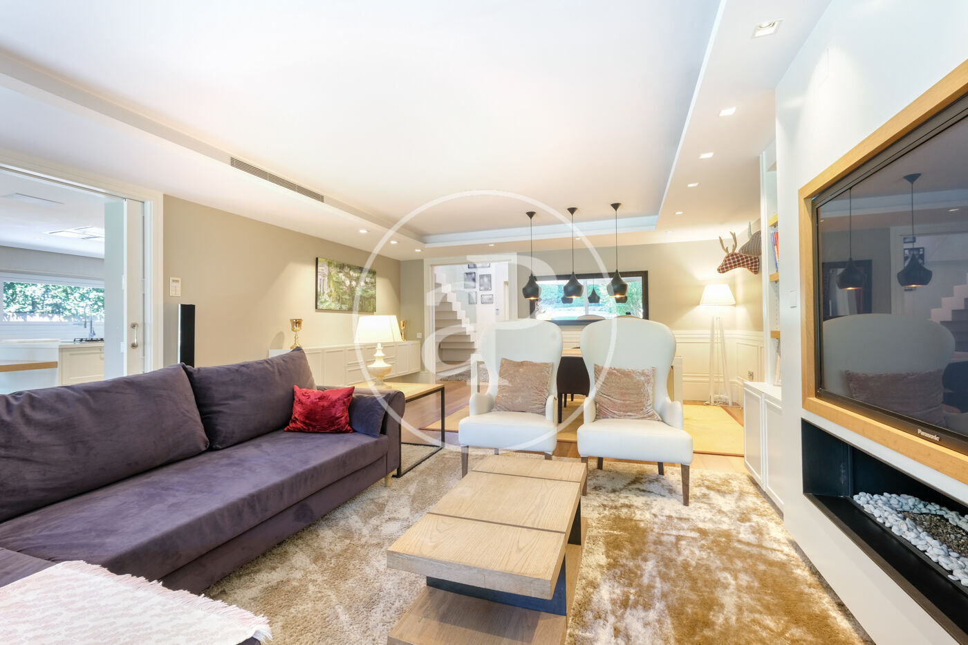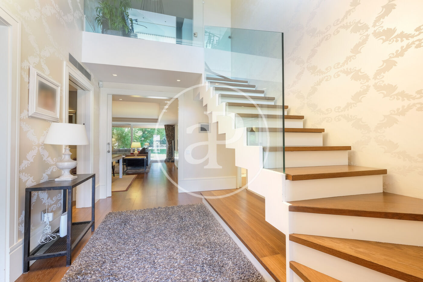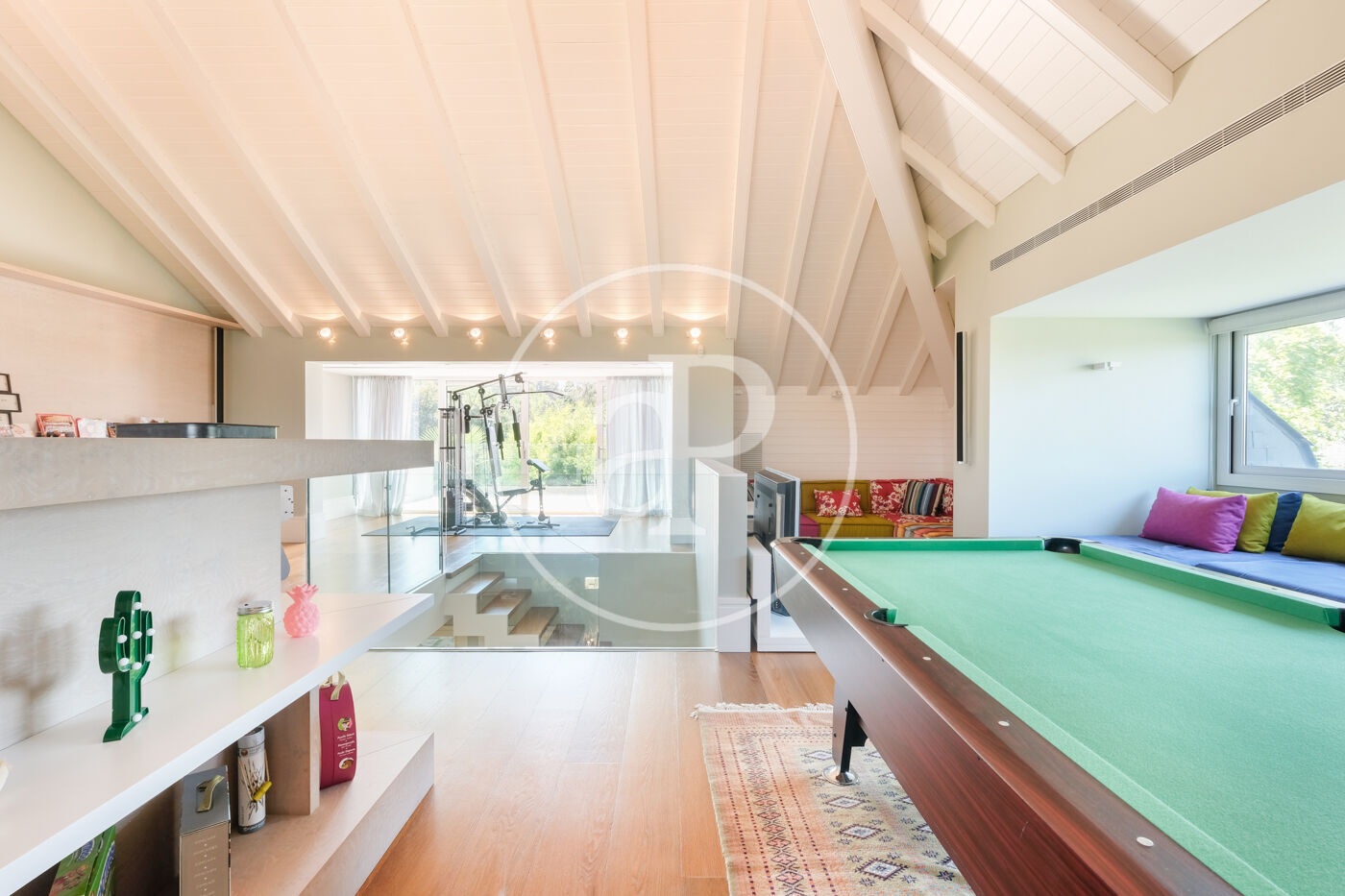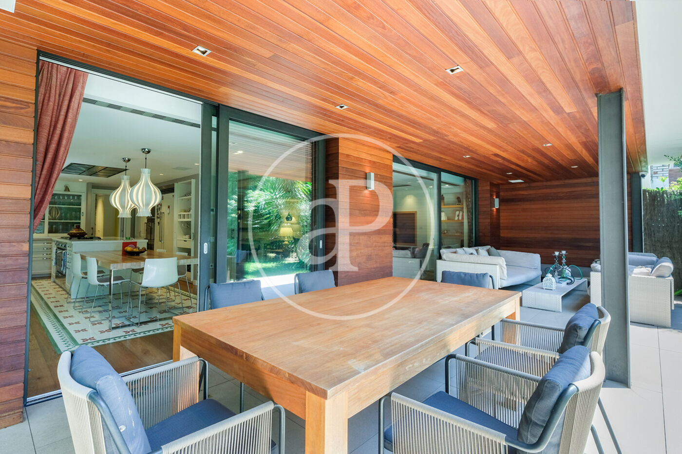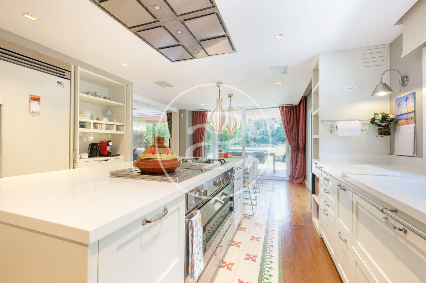 Diseño, lujo y exclusividad, son los mejores adjetivos que describen a esta espectacular villa de 590 m2 construidos, reformada íntegramente por un prestigioso arquitecto, cuidando el más mínimo detalle en toda la vivienda. Cuenta con una parcela amplia y ajardinada de 845 m2, frente al Golf de Sant Cugat, con inmejorable ubicación en la zona residencial más exclusiva y tranquila de Sant Cugat, L’Eixample, al lado de paradas de autobús, a menos de 10 minutos andando de la estación de tren "FGC Sant Cugat Centre" y del centro de la ciudad y todo tipo de servicios y a tan sólo 15 minutos en coche de la zona alta de Barcelona.